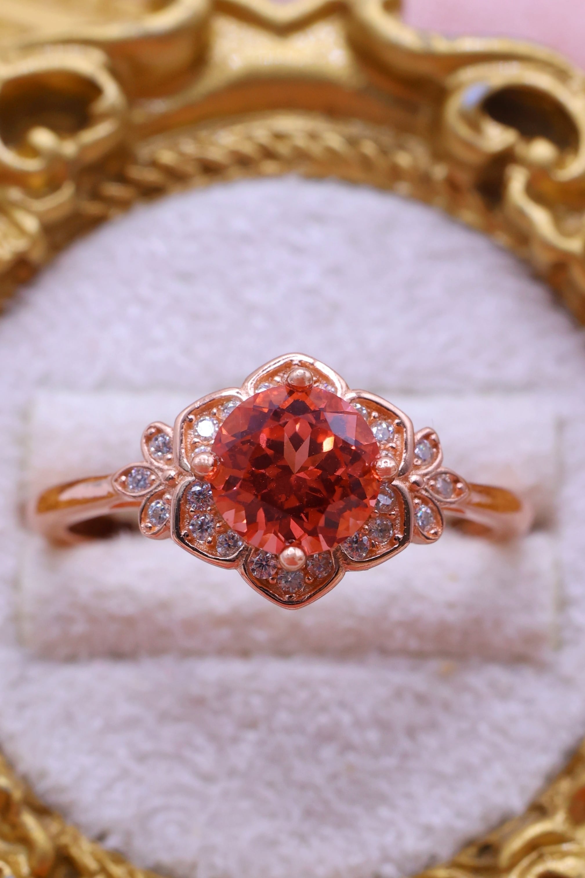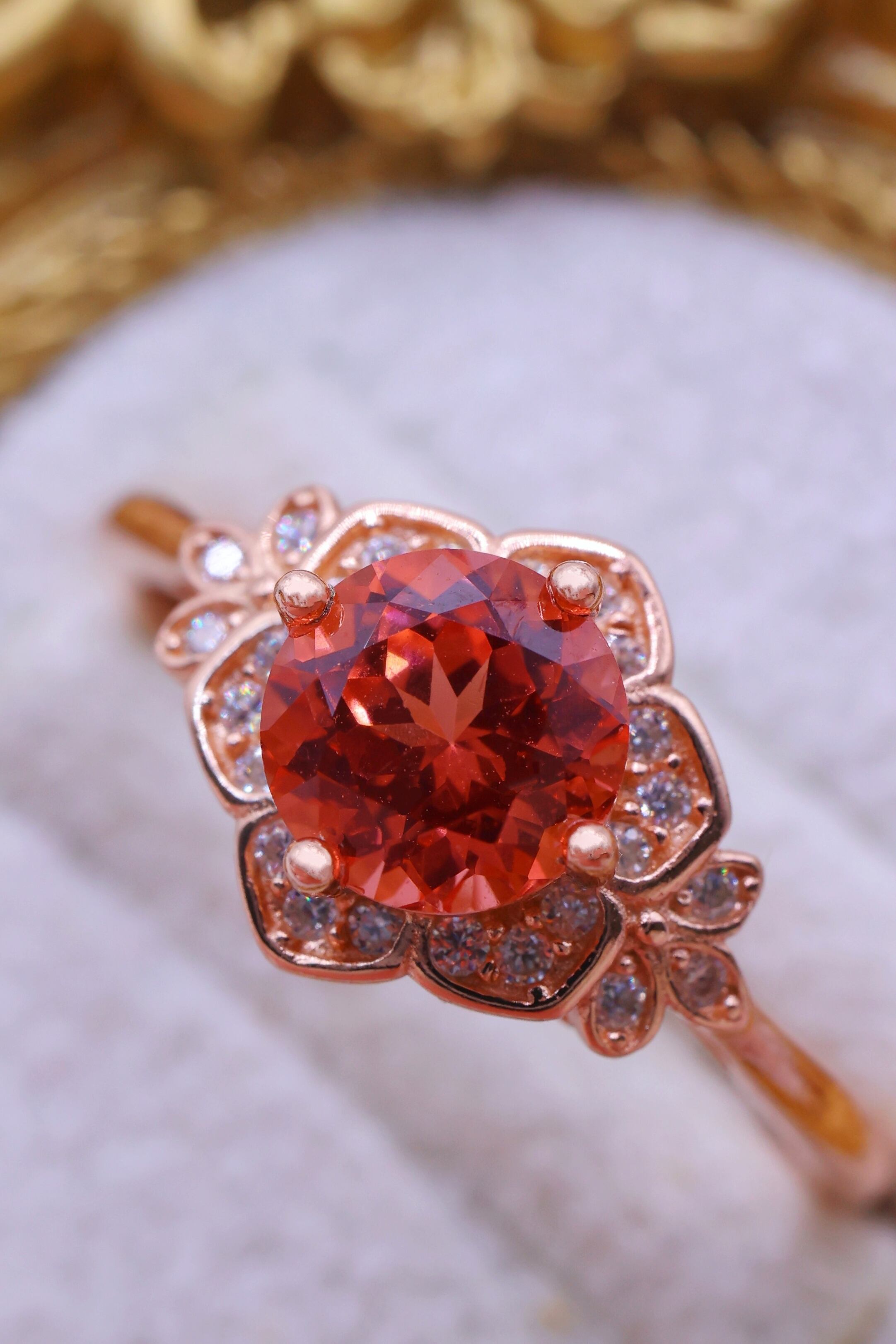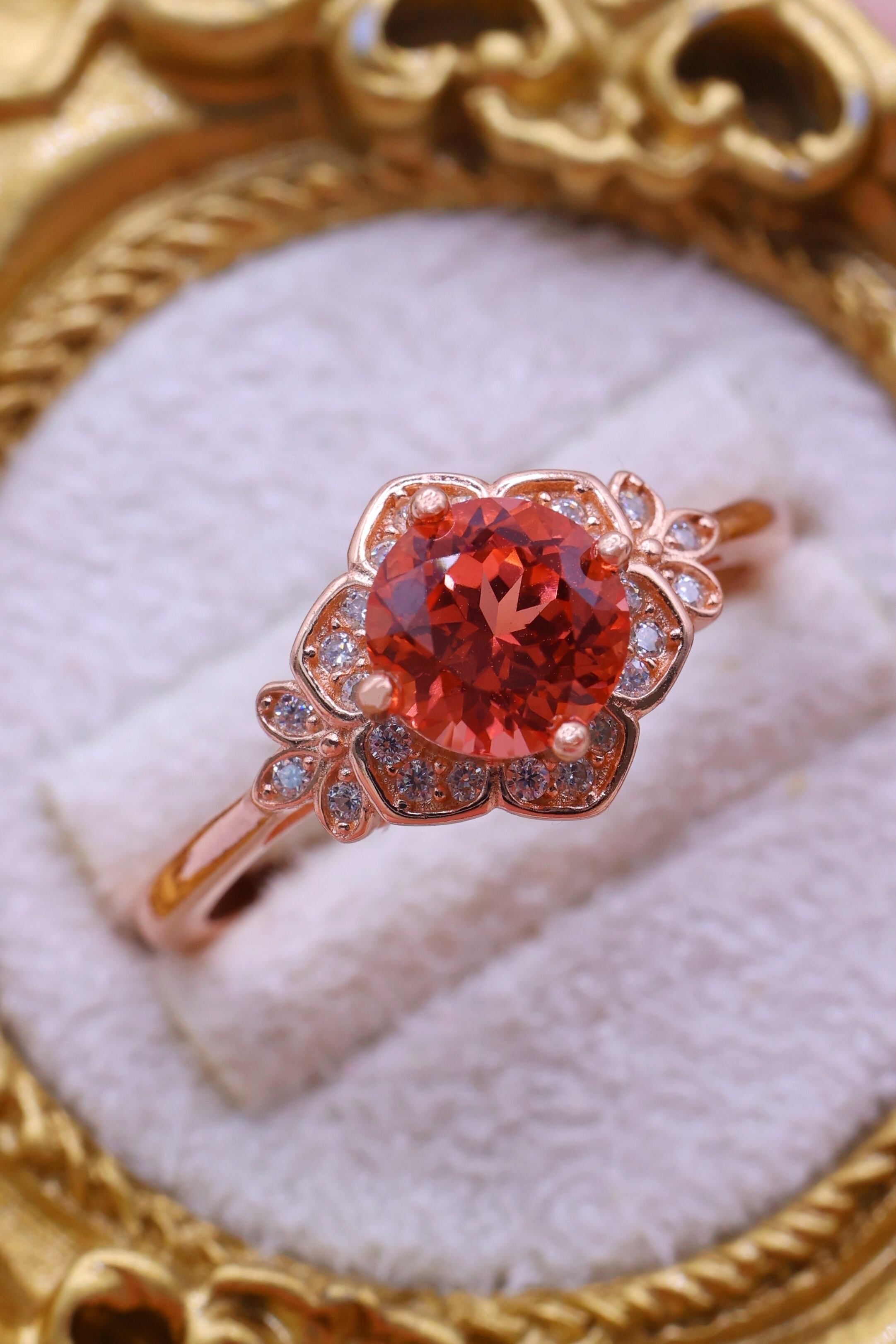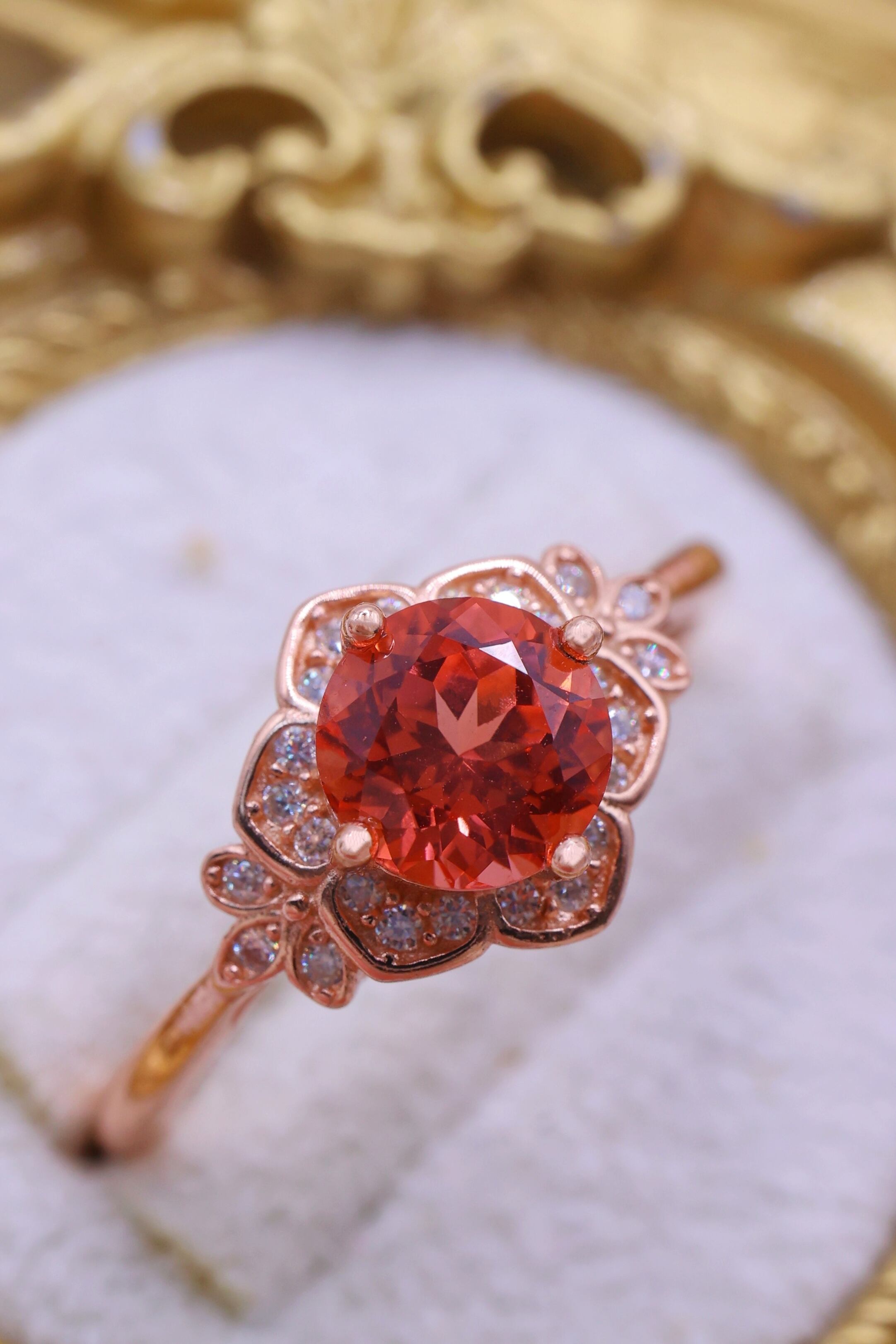 ロシアの宝石研究所より直送された、ラボグロウン・パパラチアサファイアを主石に使用したリングです。