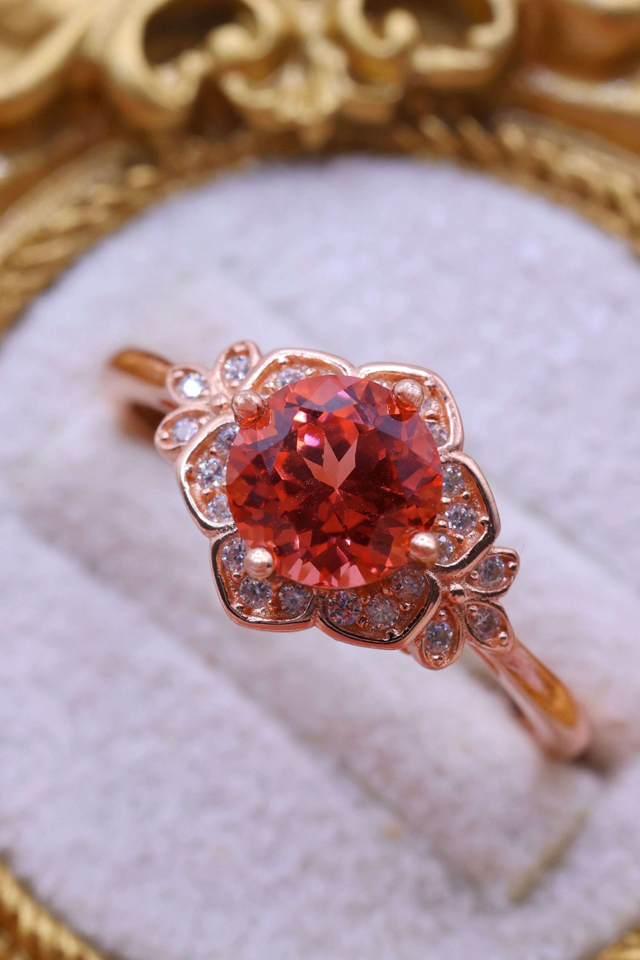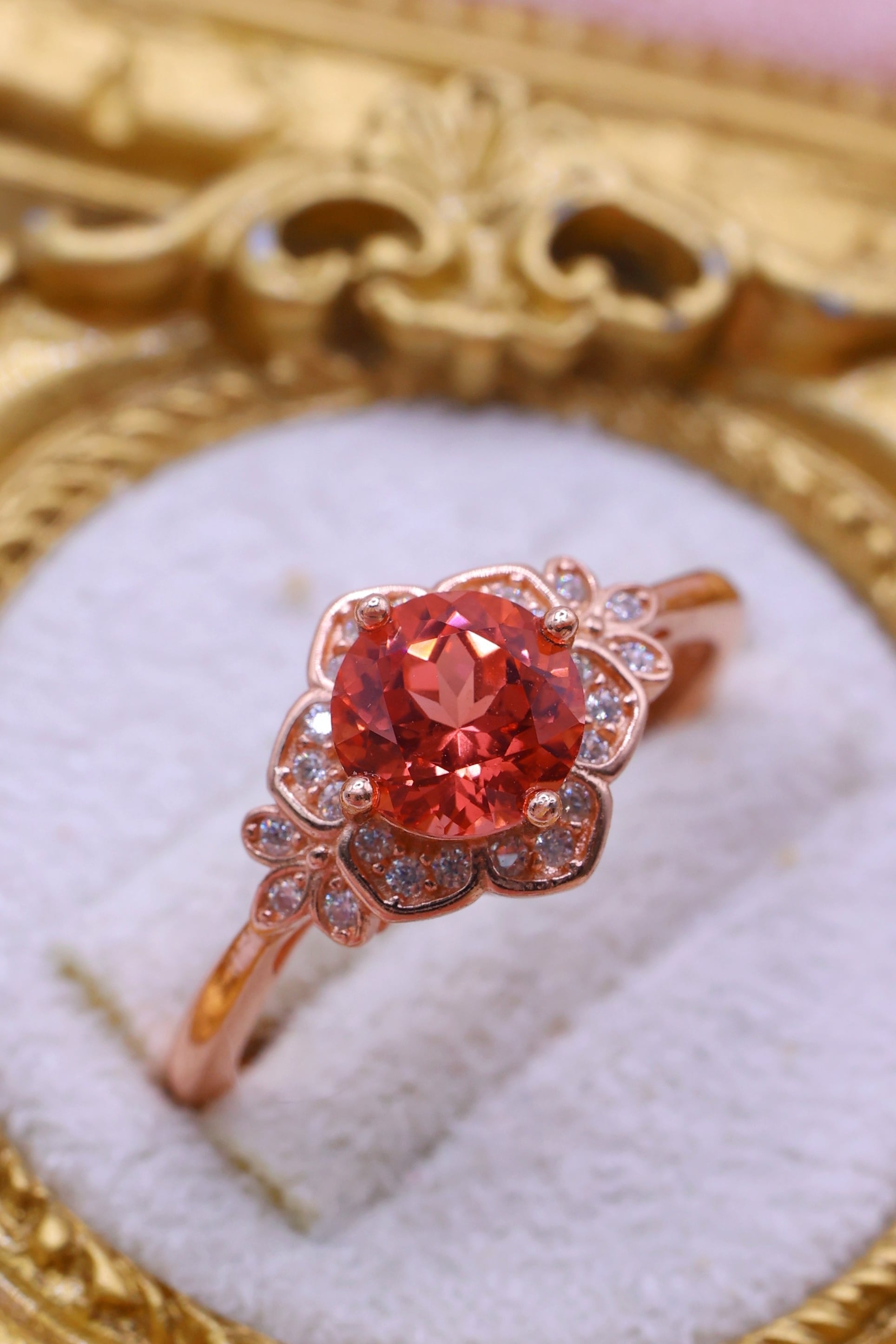 主石の色彩を引き立てながら、繊細なきらめきが花のような輪郭を描き出します。