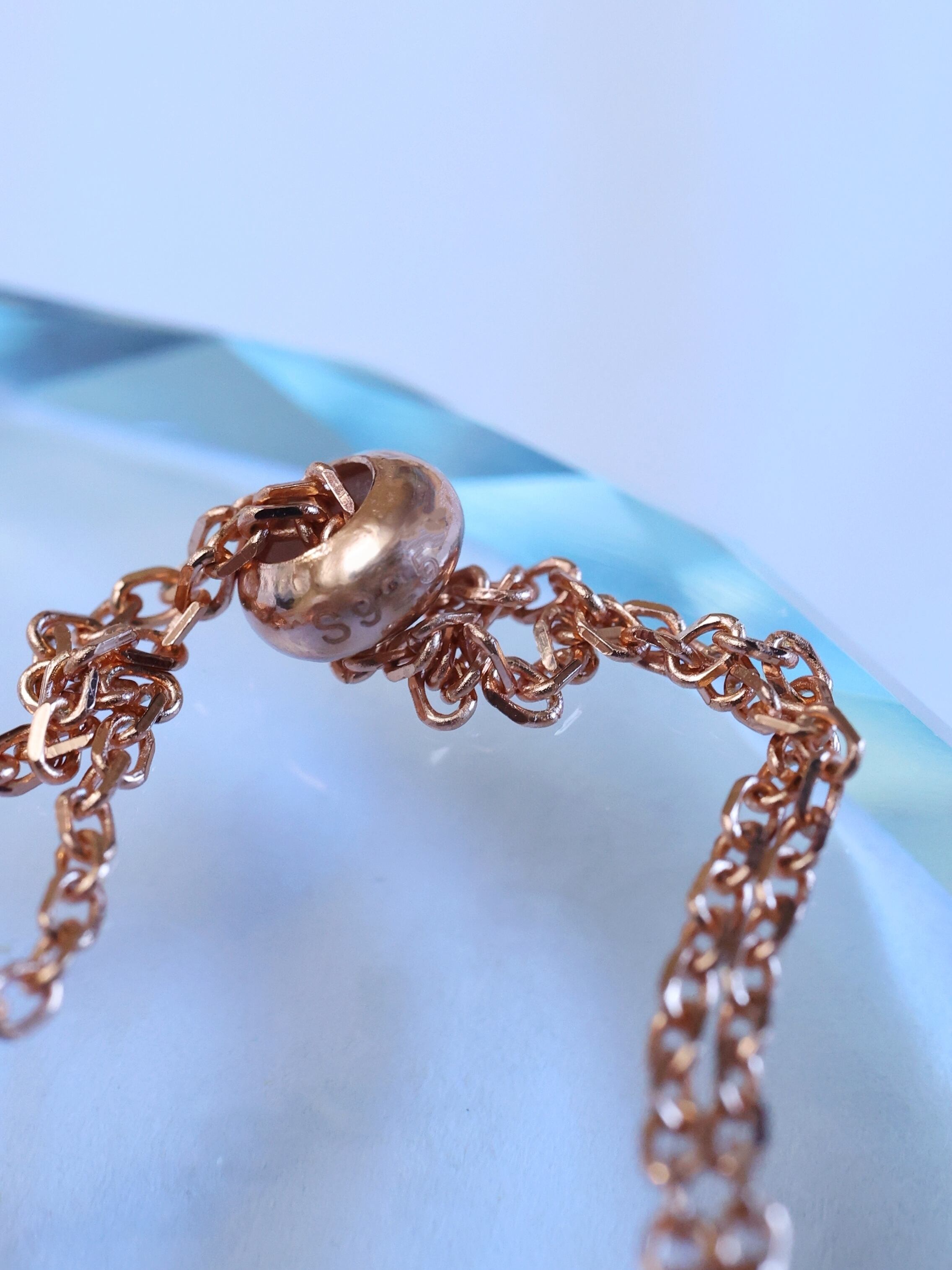 手元の動きに合わせてさりげなく揺れ、ブレスレット全体に統一感のある輝きを添えています。