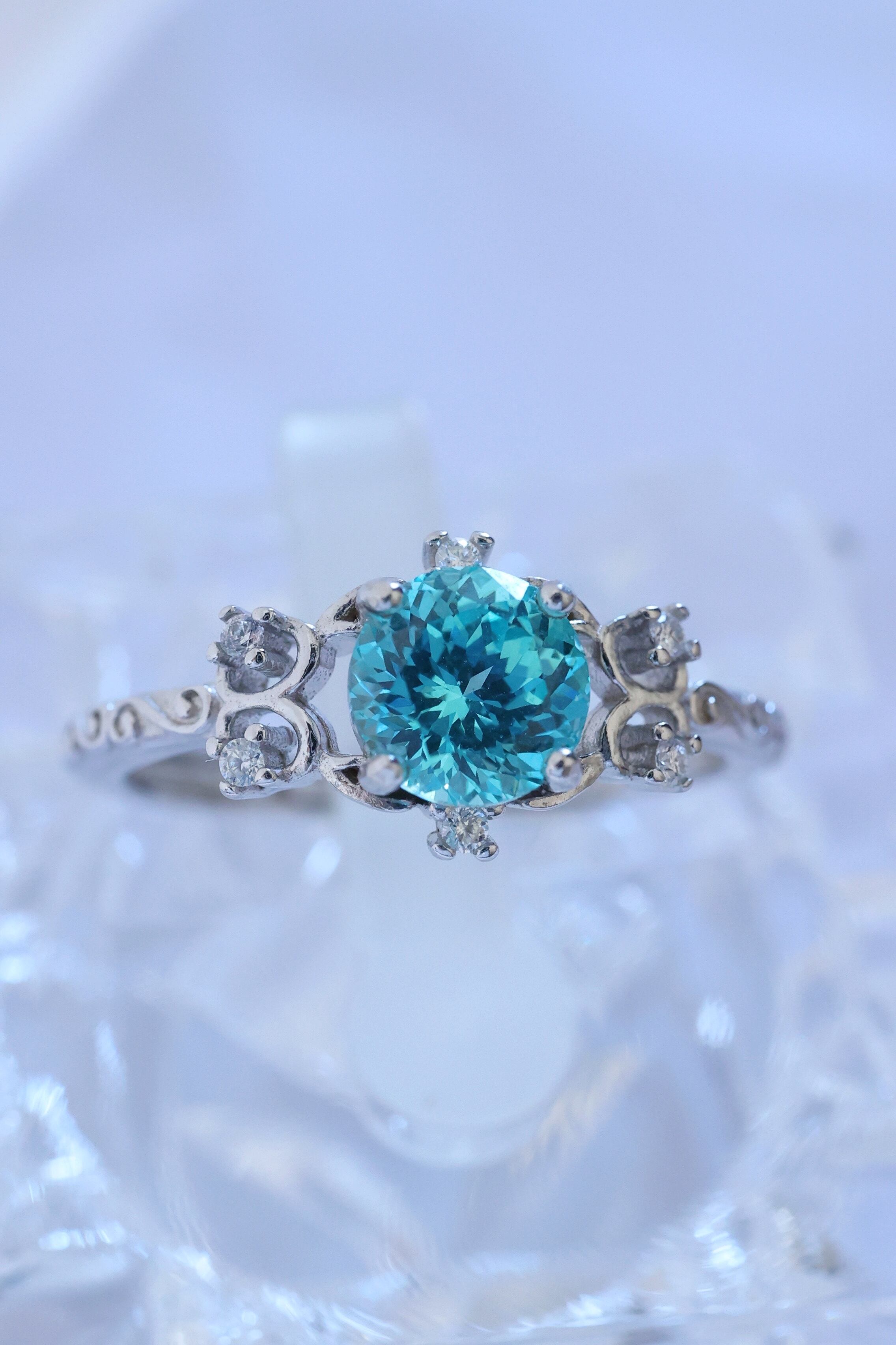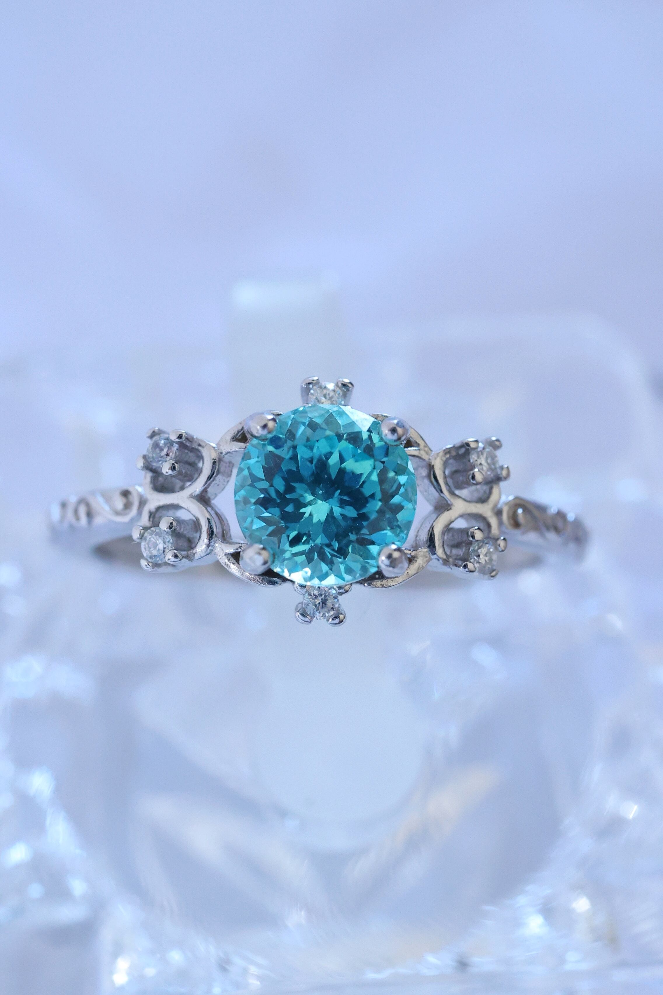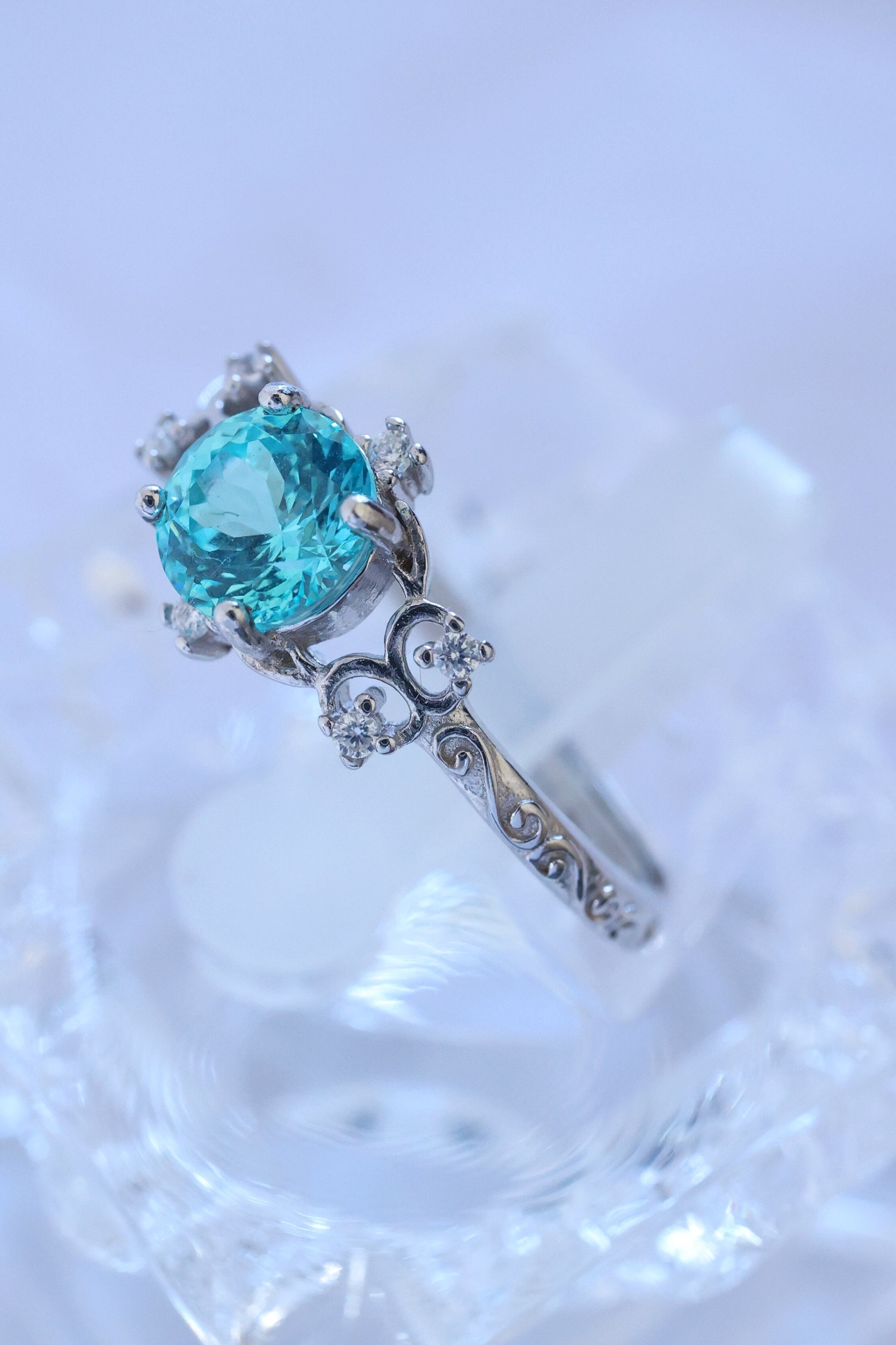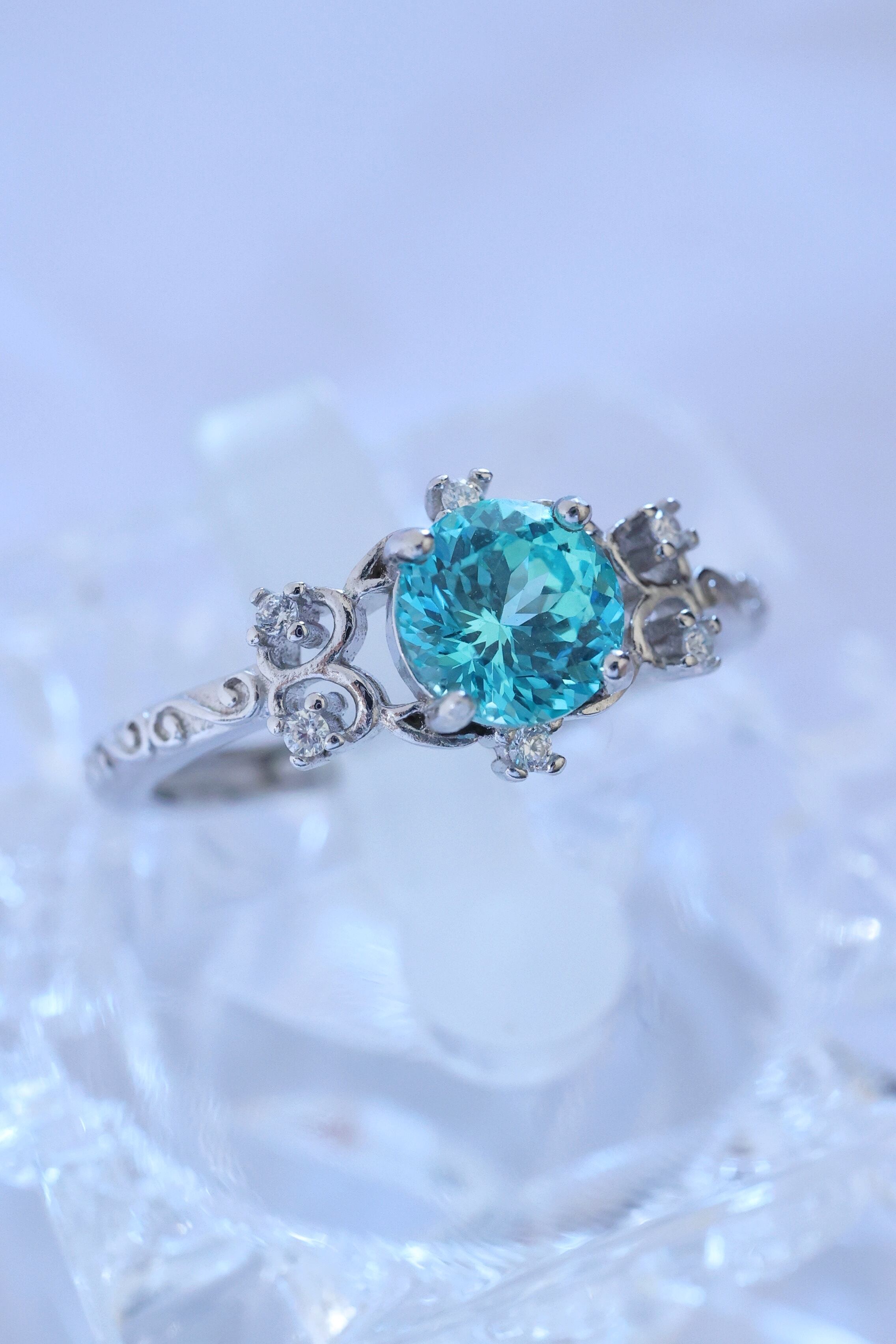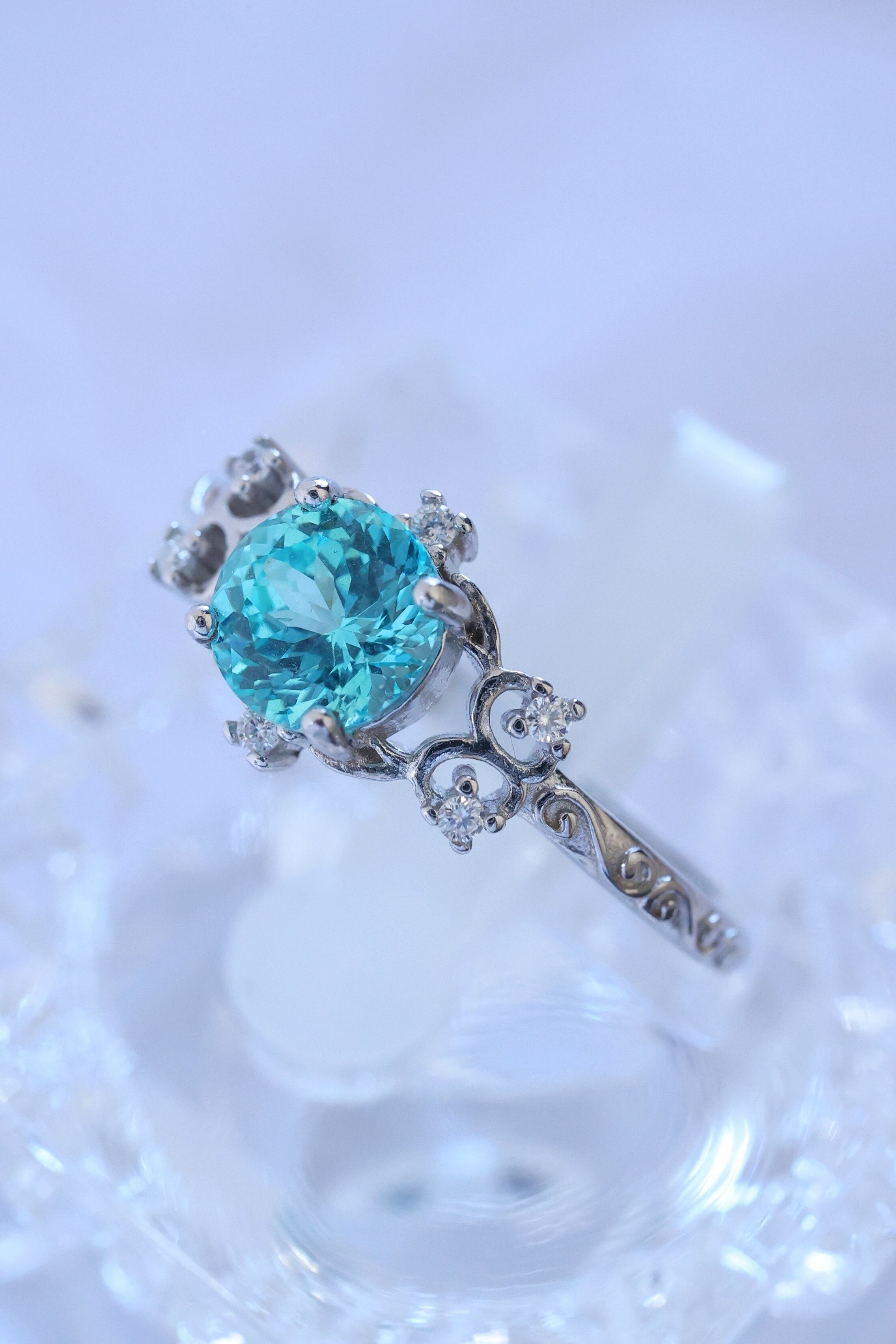 目を惹くネオンブルーのラボグロウンパライバYAGを使用した、洗練されたデザインのリングです。