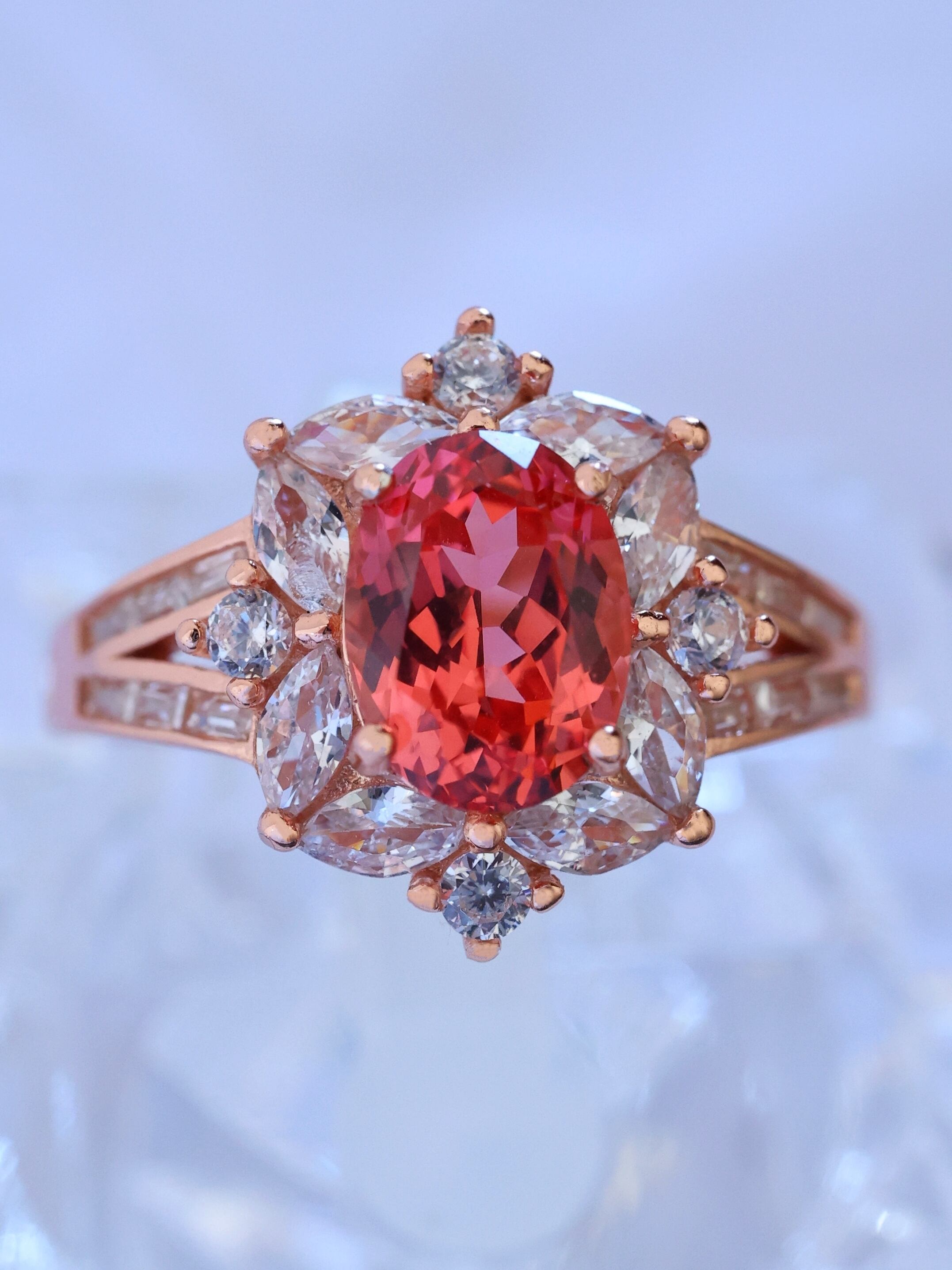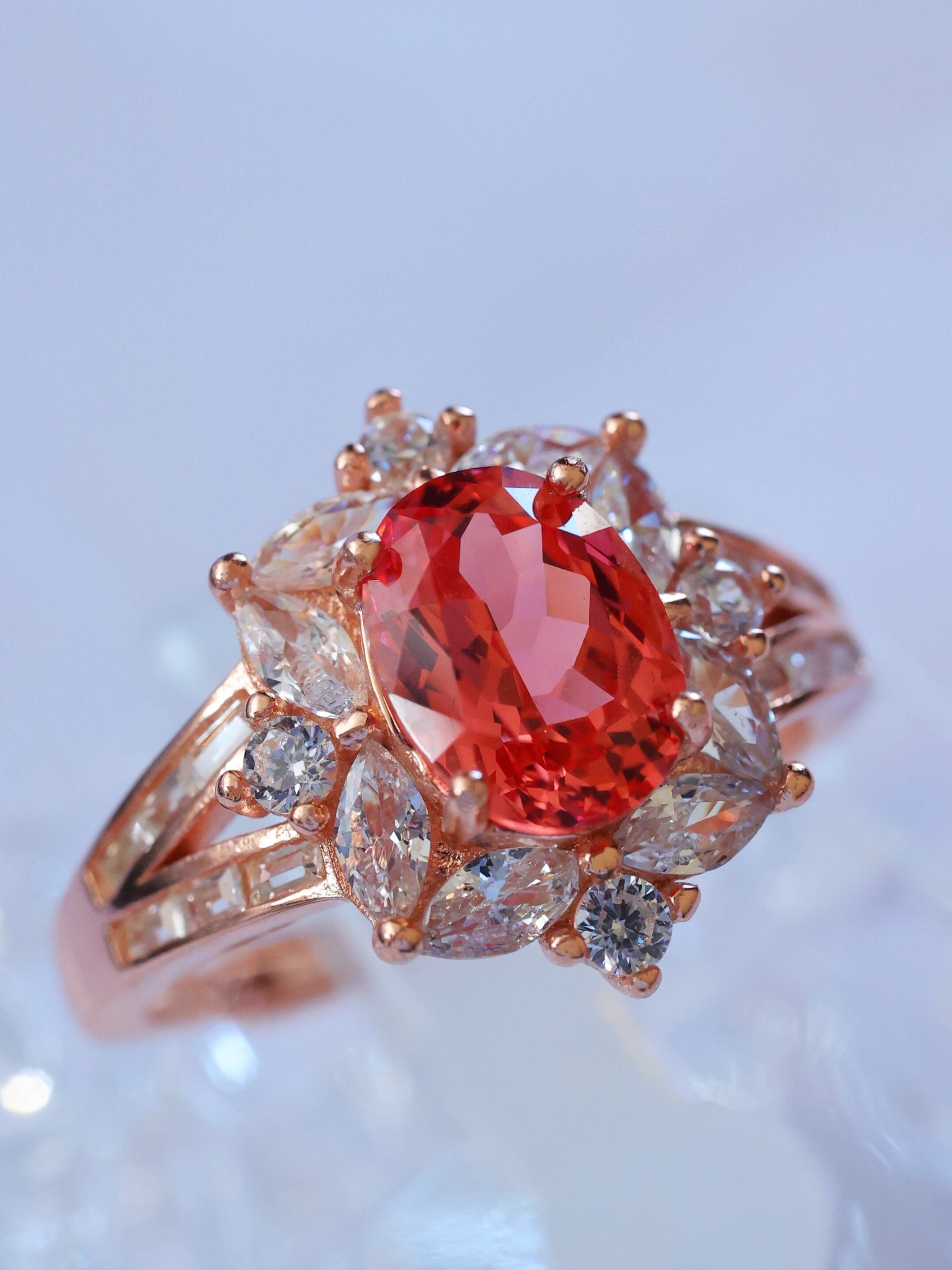 夕焼け時の空が放つ、柔らかなオレンジ色にインスパイアされたパパラチアサファイアを贅沢に使用した美しいリングです。このリングには、温かみのある夕焼けカラーの宝石が、シルバーの華やかな枠に包まれています。まるで夕日の優しい光が、指先でゆらめいているかのような魅力を放っています。