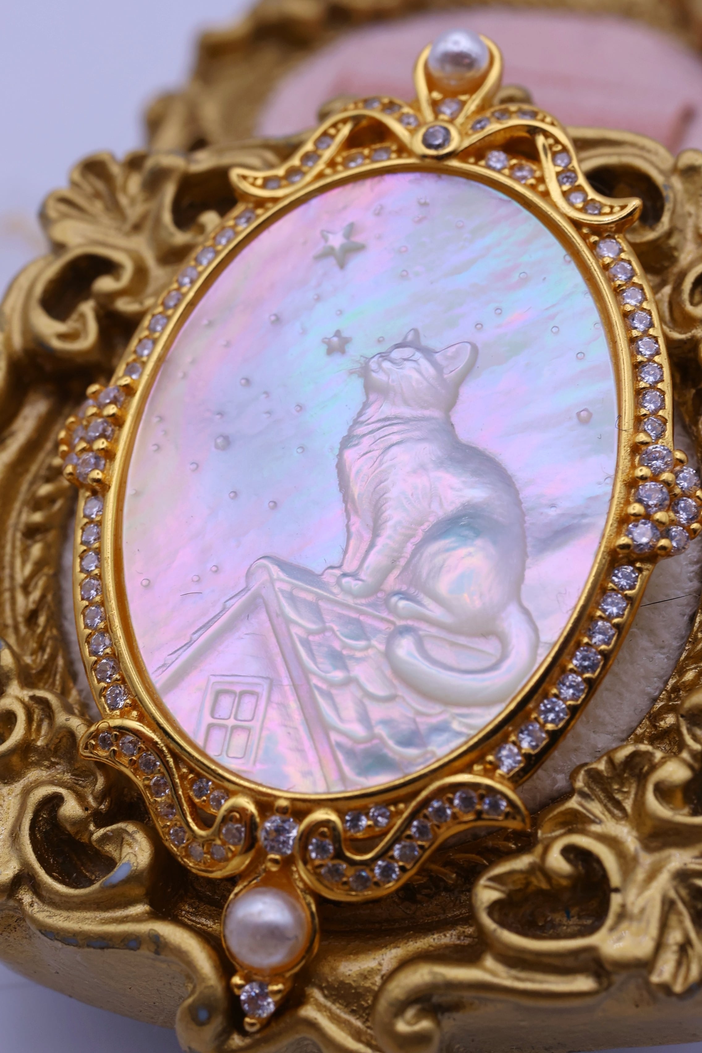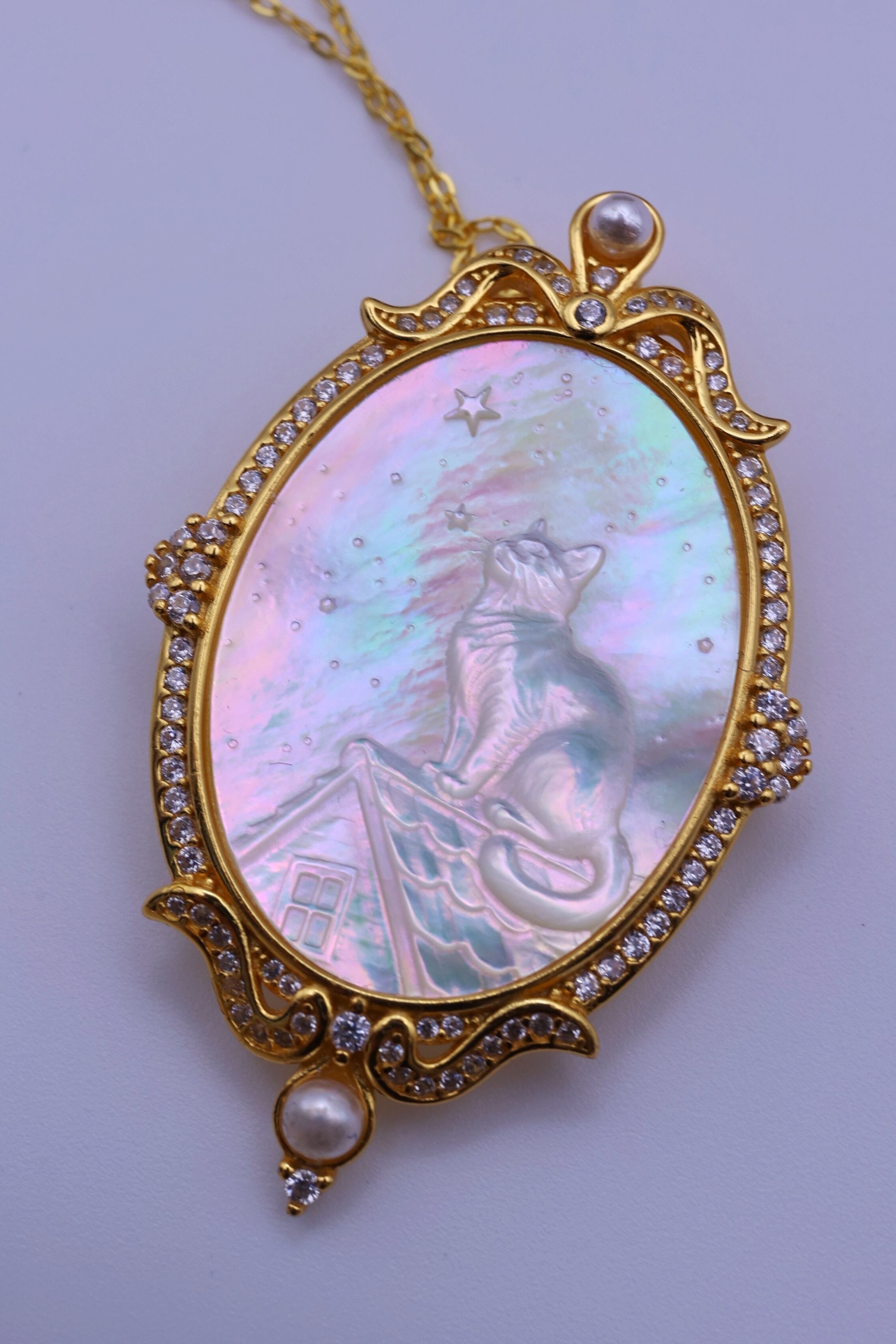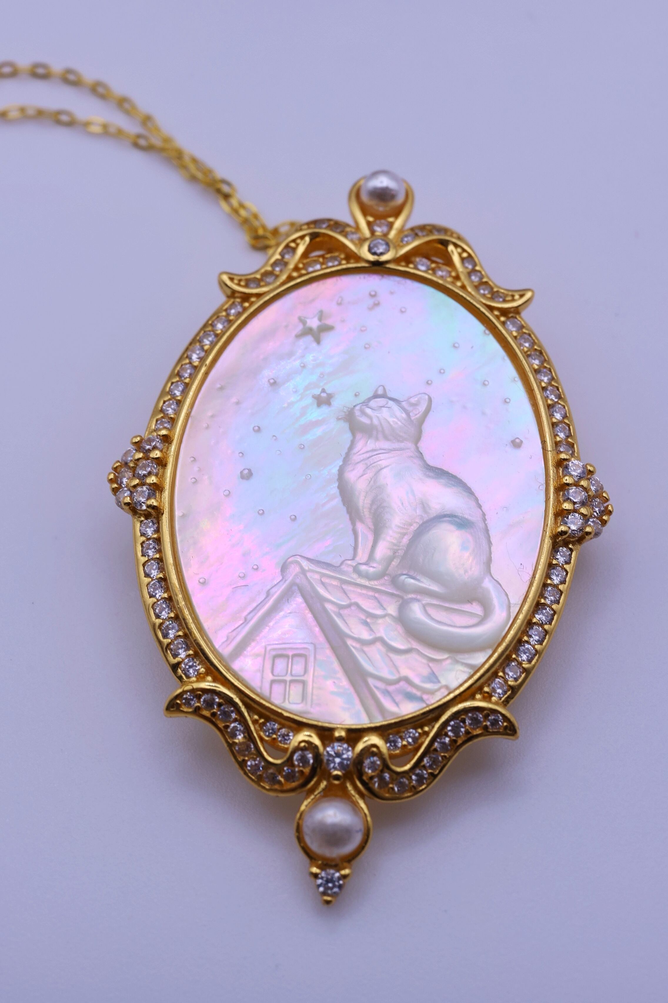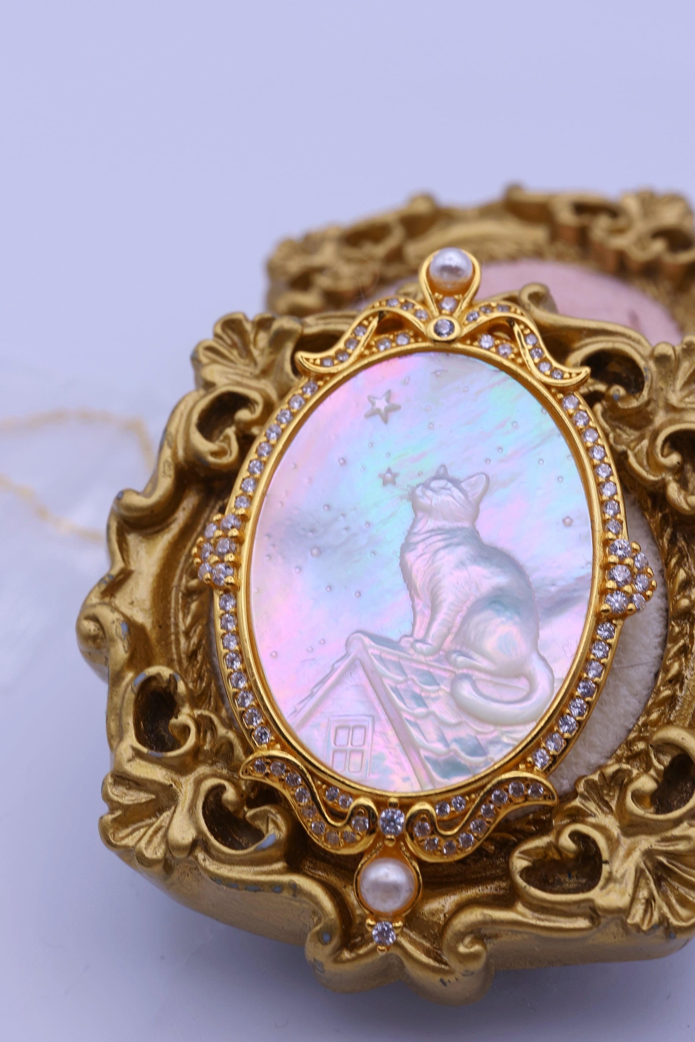 白蝶貝彫刻ペンダント ― 星を見上げる猫 ―
