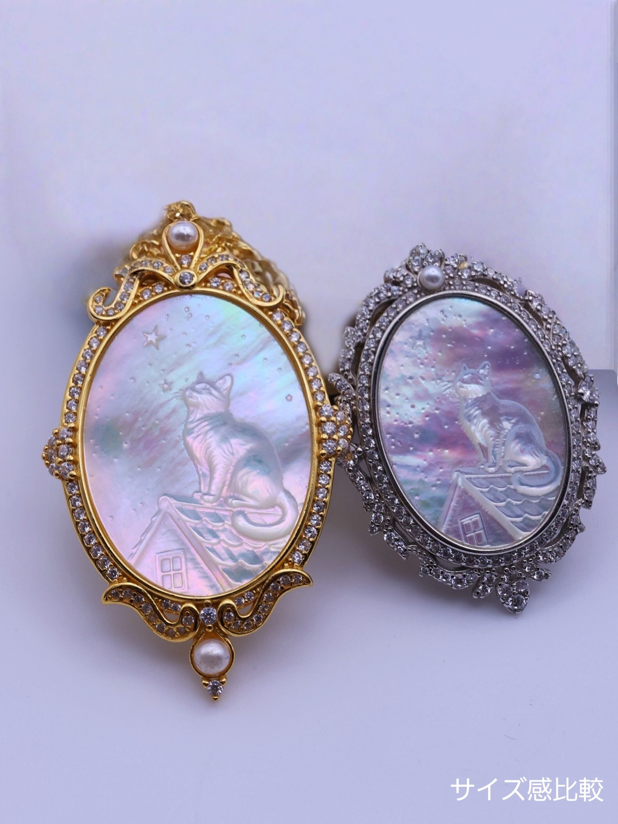 白蝶貝のオーロラの輝きと、夜空を見つめる猫。身に着けるたび、胸元に小さな星空と流星群を連れて歩くような、幻想的な一本です。