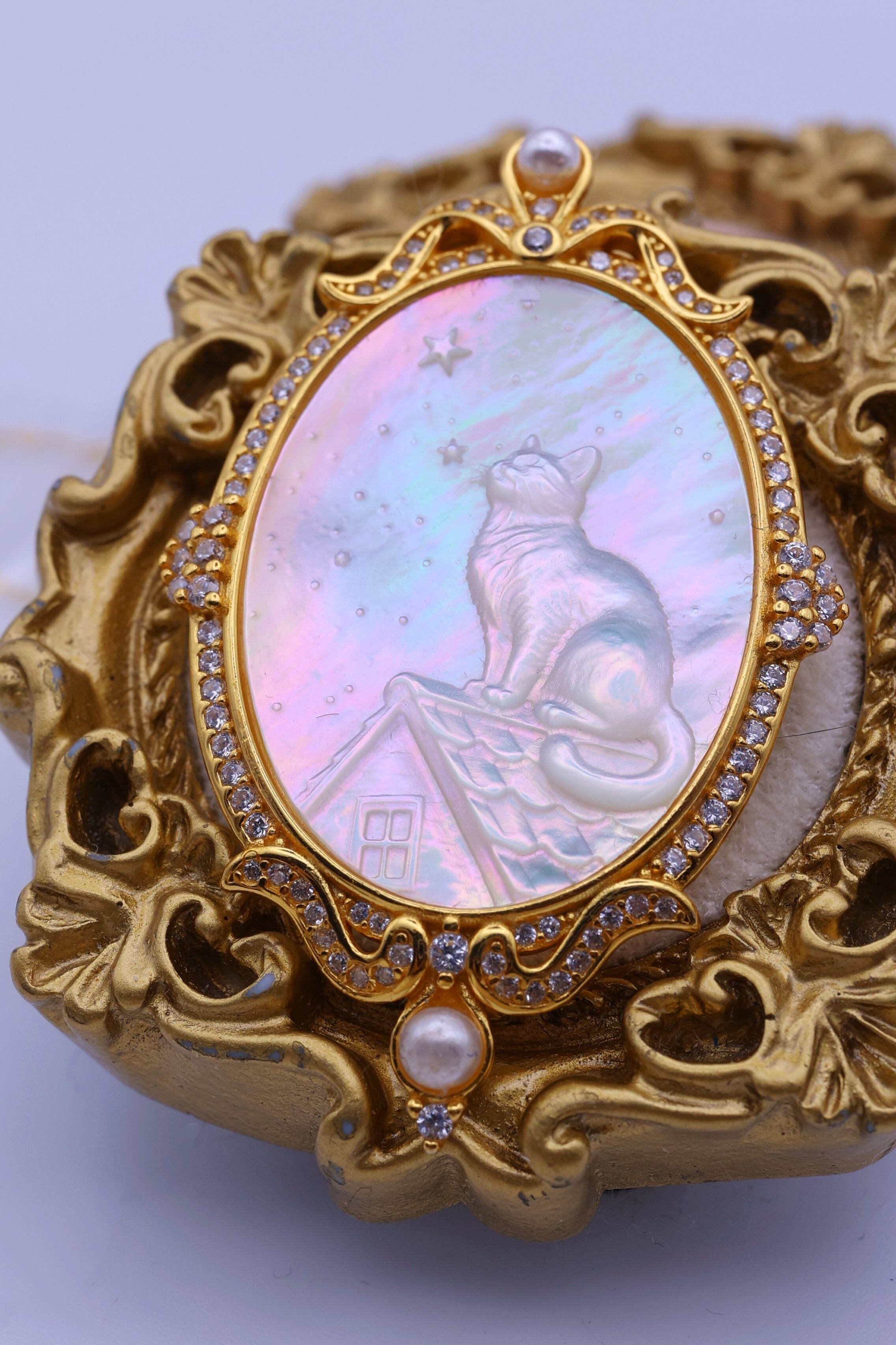 【白蝶貝彫刻シリーズ】星空を見上げる猫(大) 2WAYペンダント・ブローチ オーロラ 天然石 シルバー S925