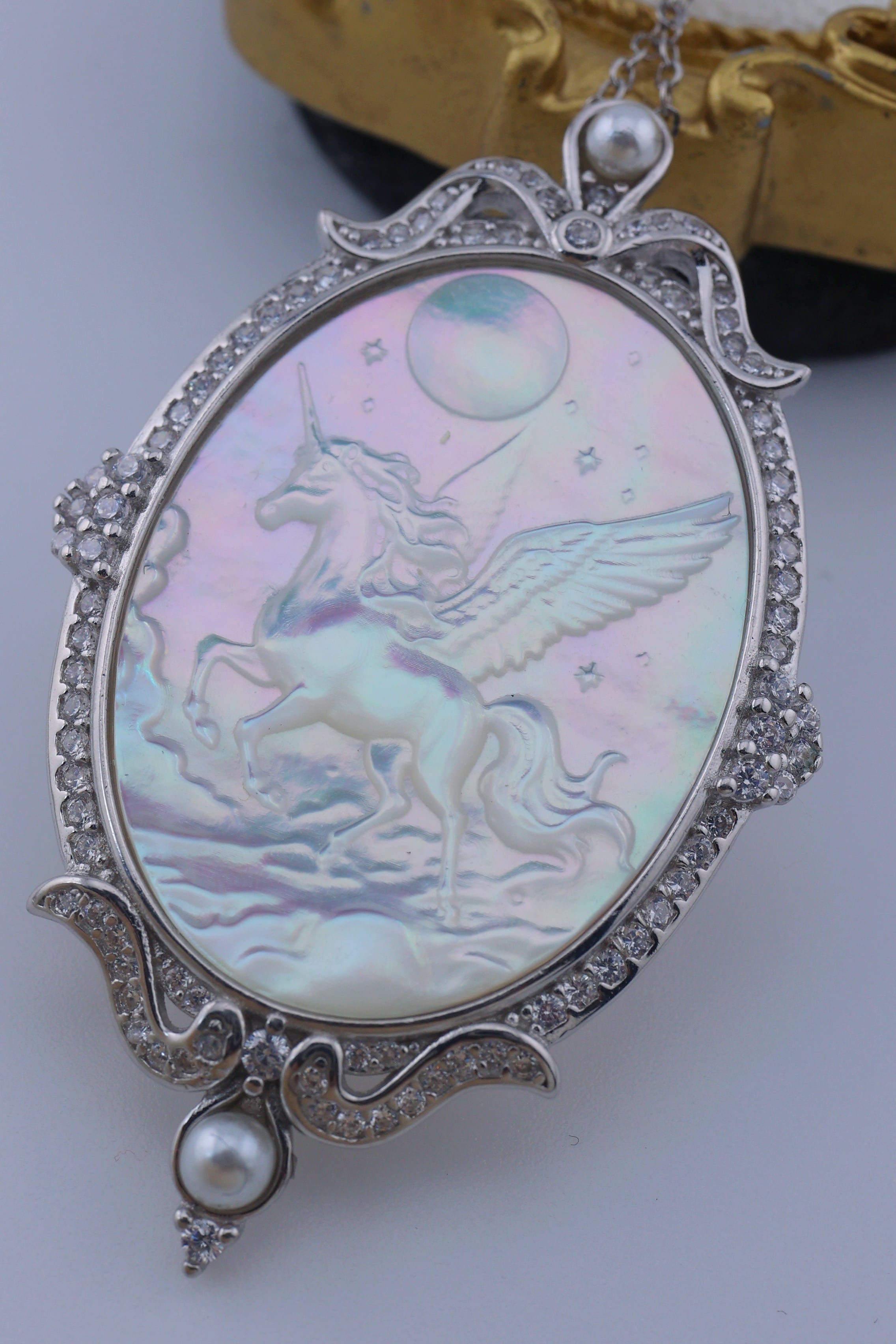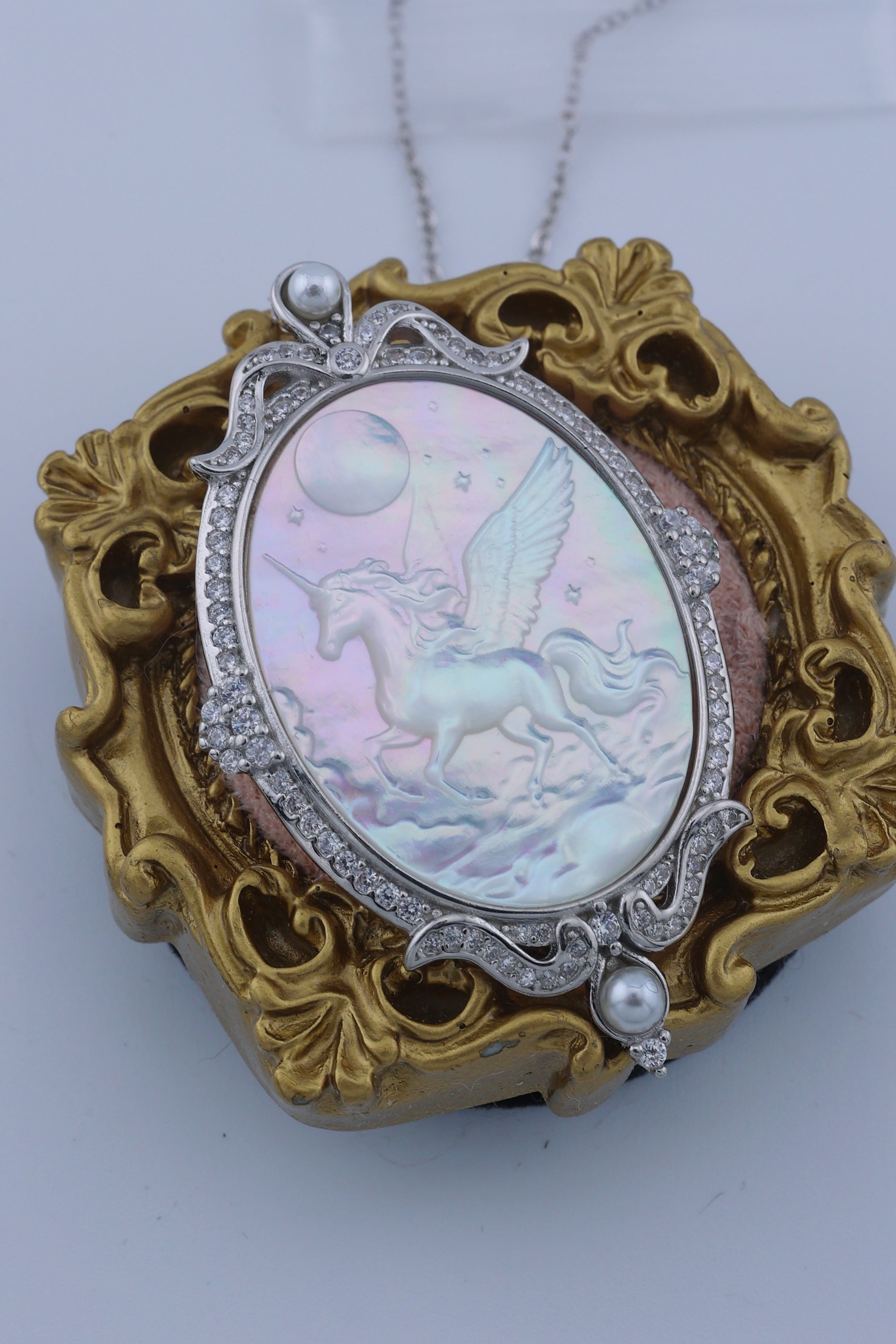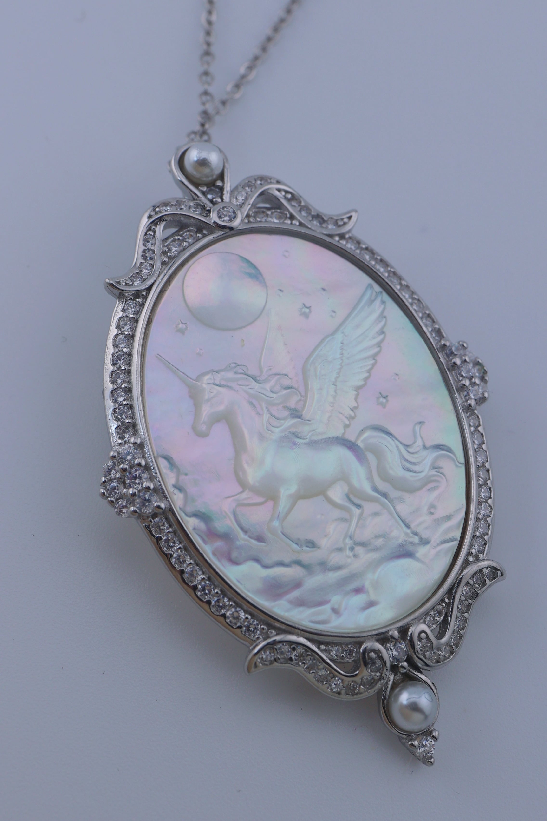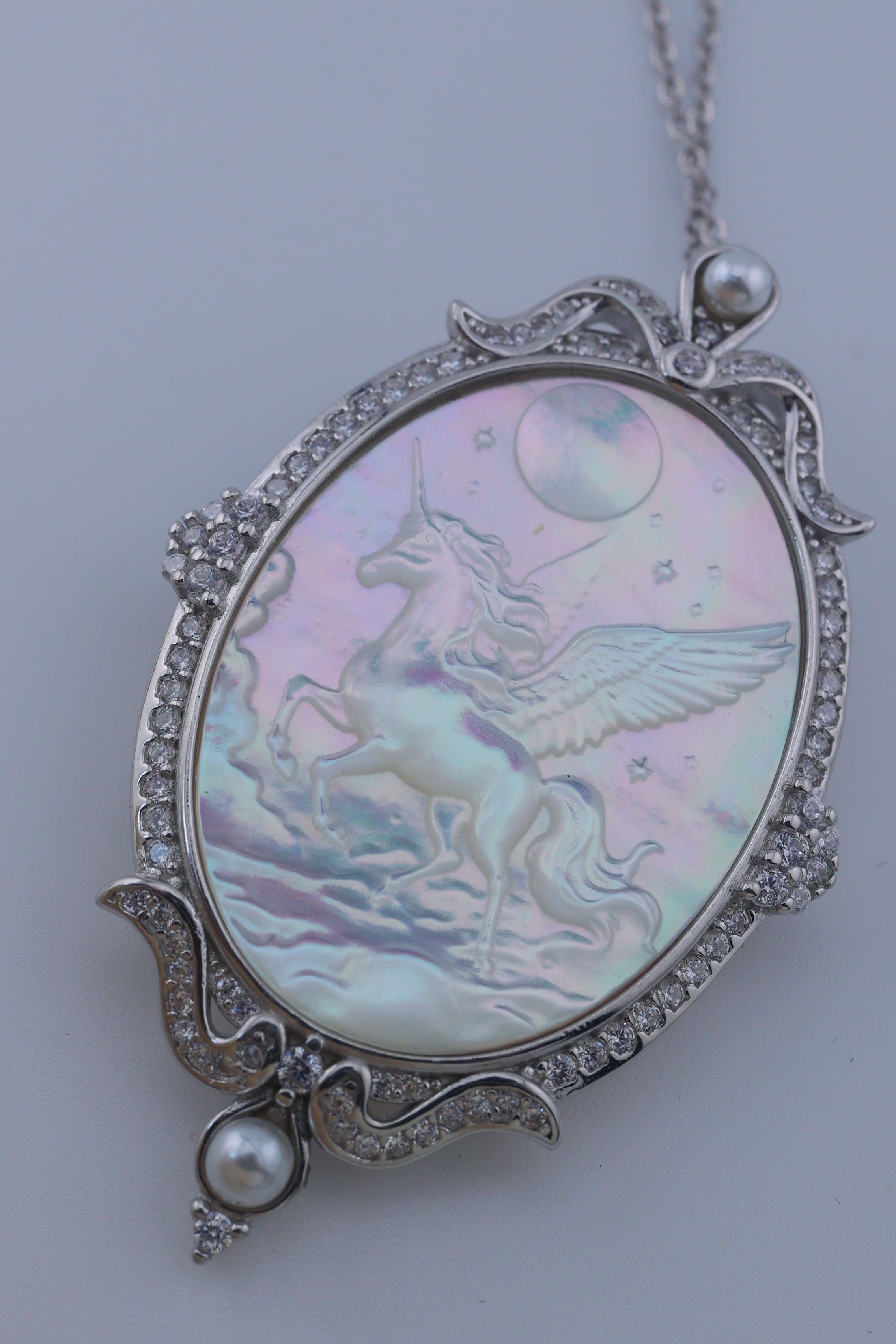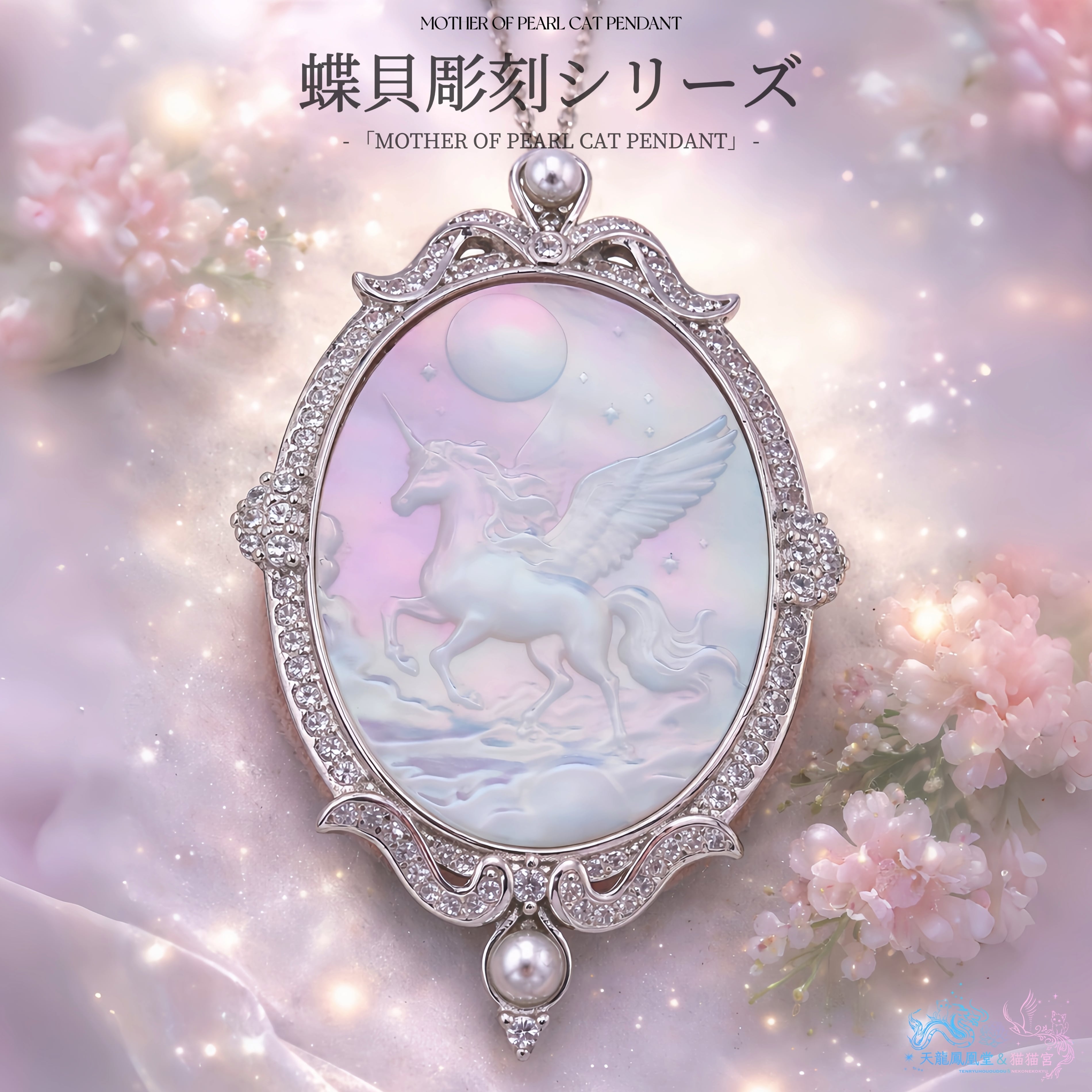 月光のように澄んだ輝きを湛えた白蝶貝に、夜空を駆けるペガサスの姿を繊細に彫刻した、幻想的なペンダント。