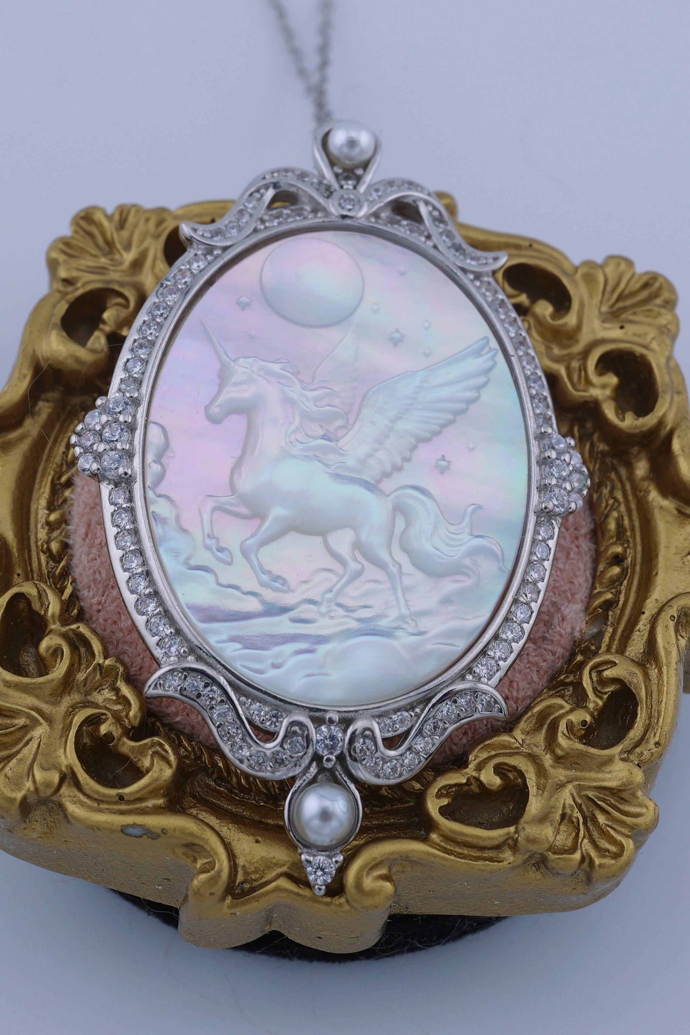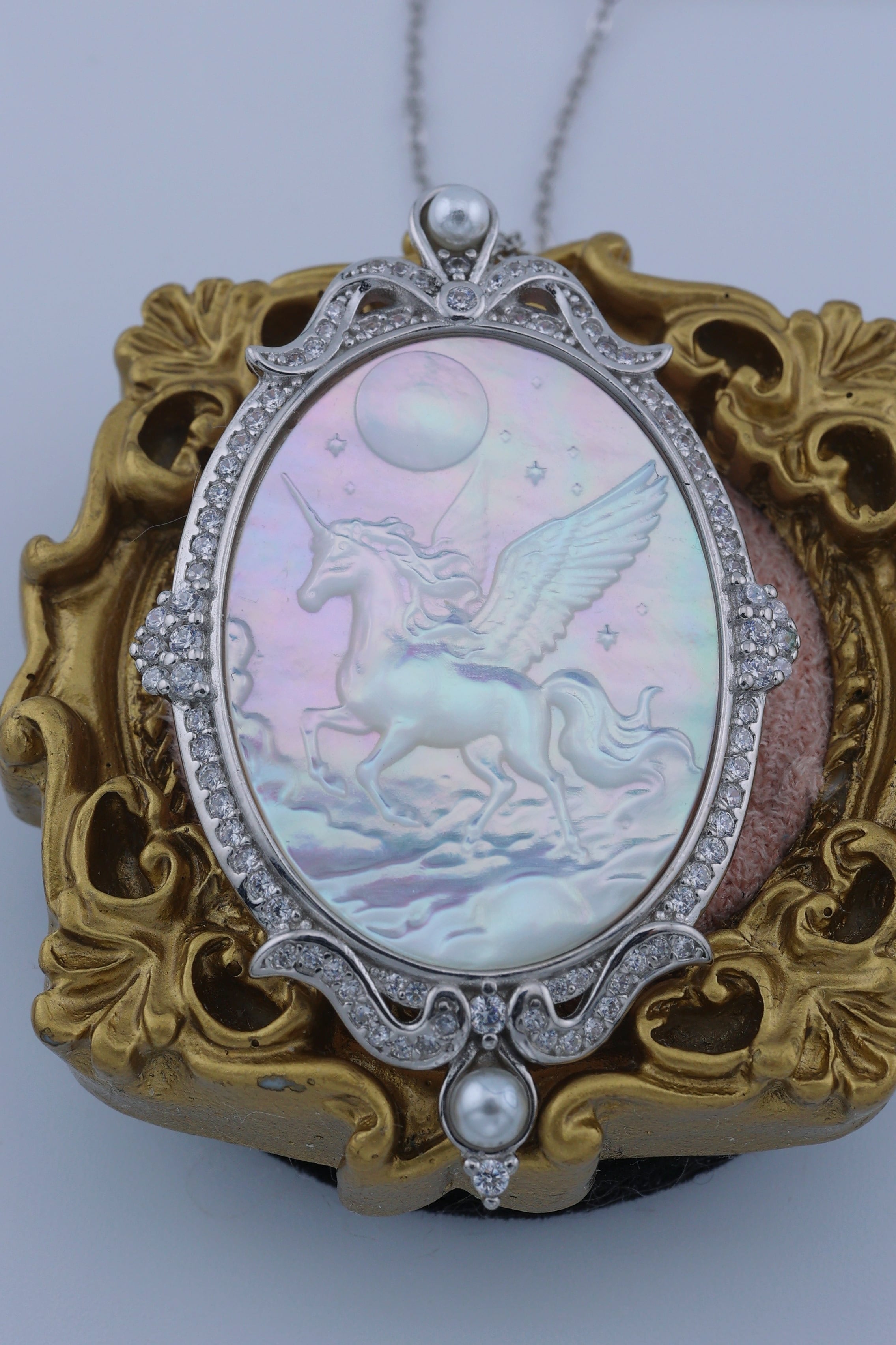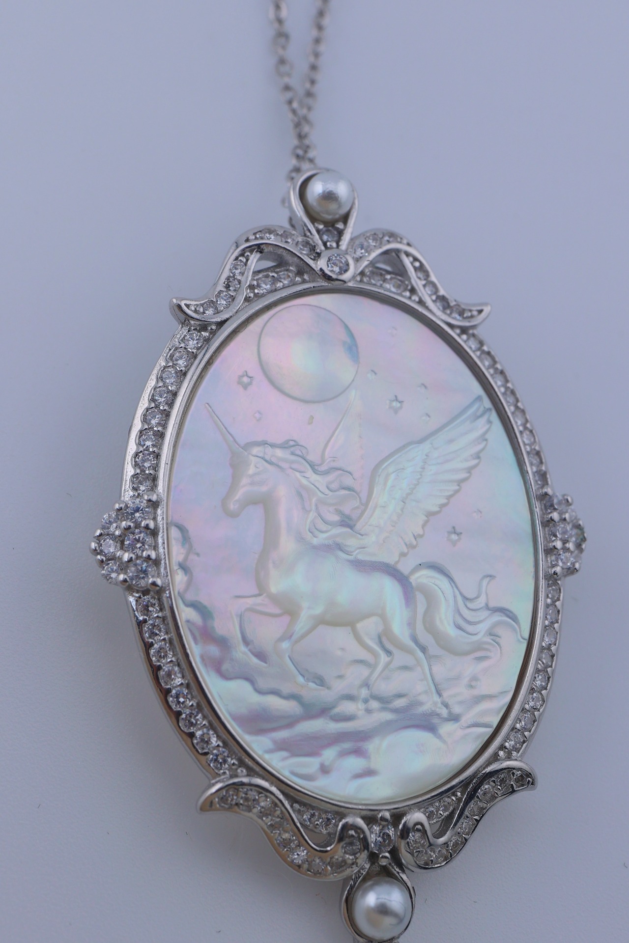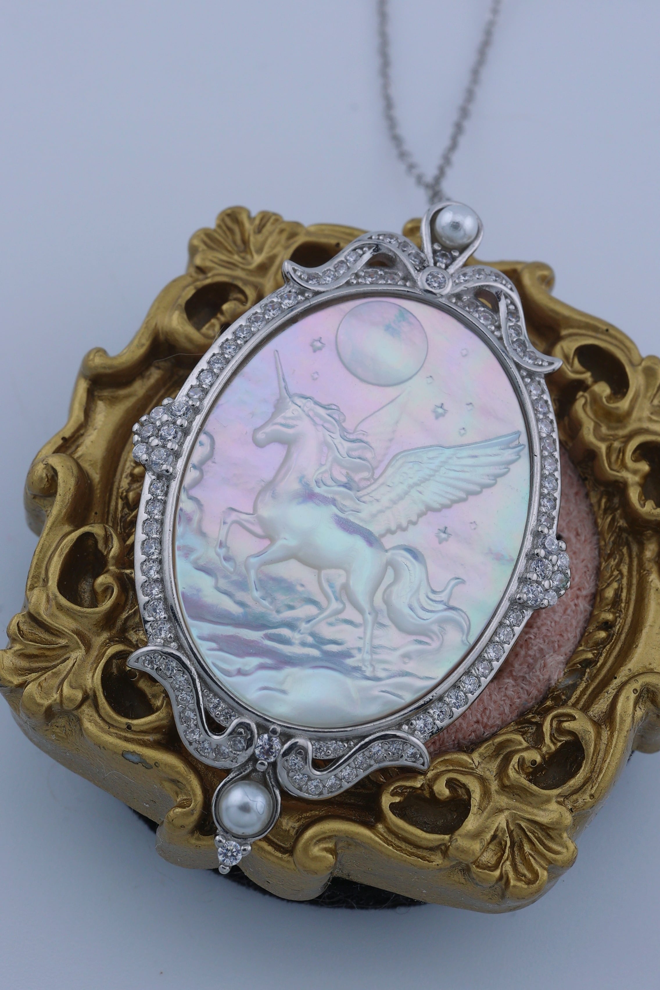 月光のように澄んだ輝きを湛えた白蝶貝に、夜空を駆けるペガサスの姿を繊細に彫刻した、幻想的なペンダント。