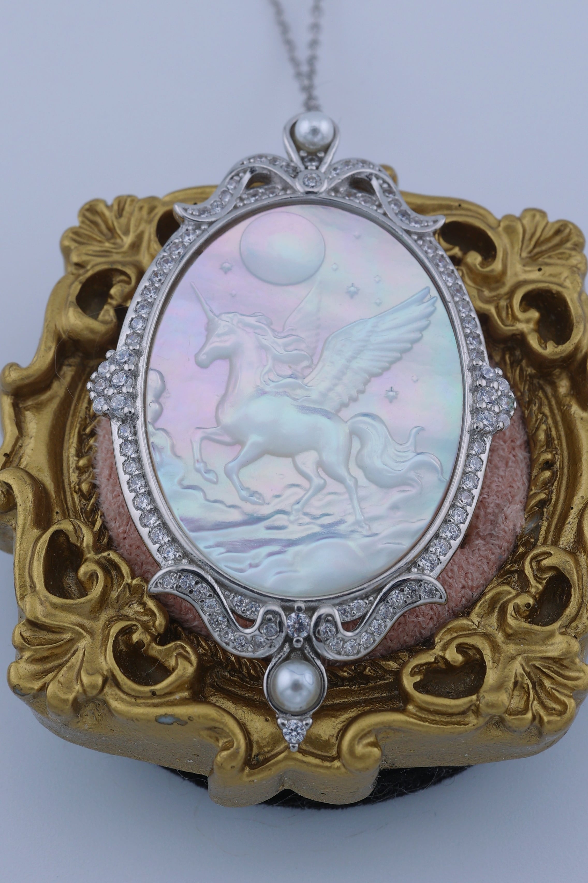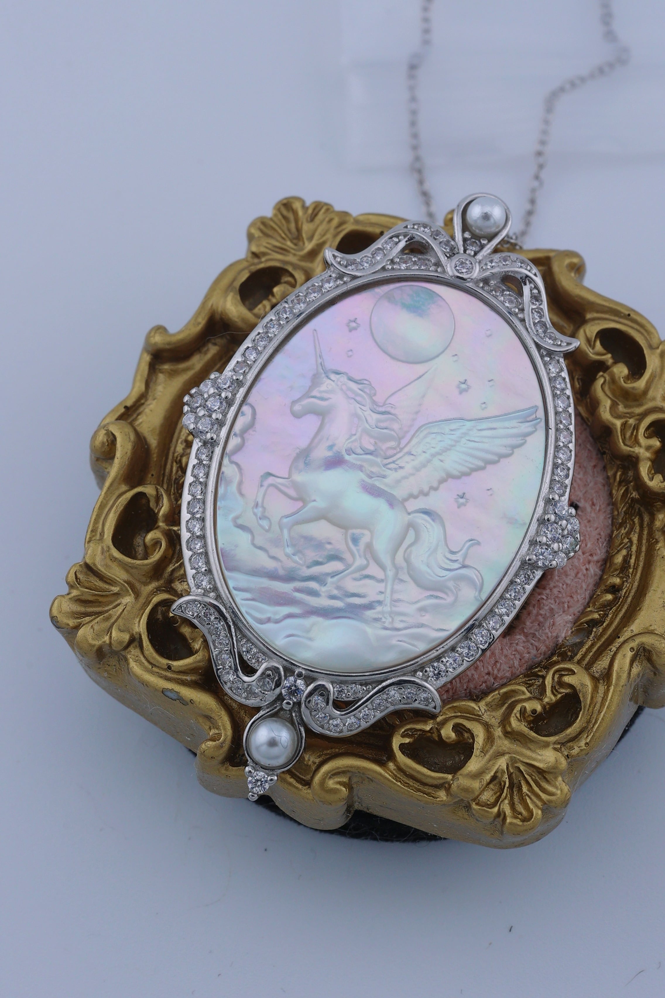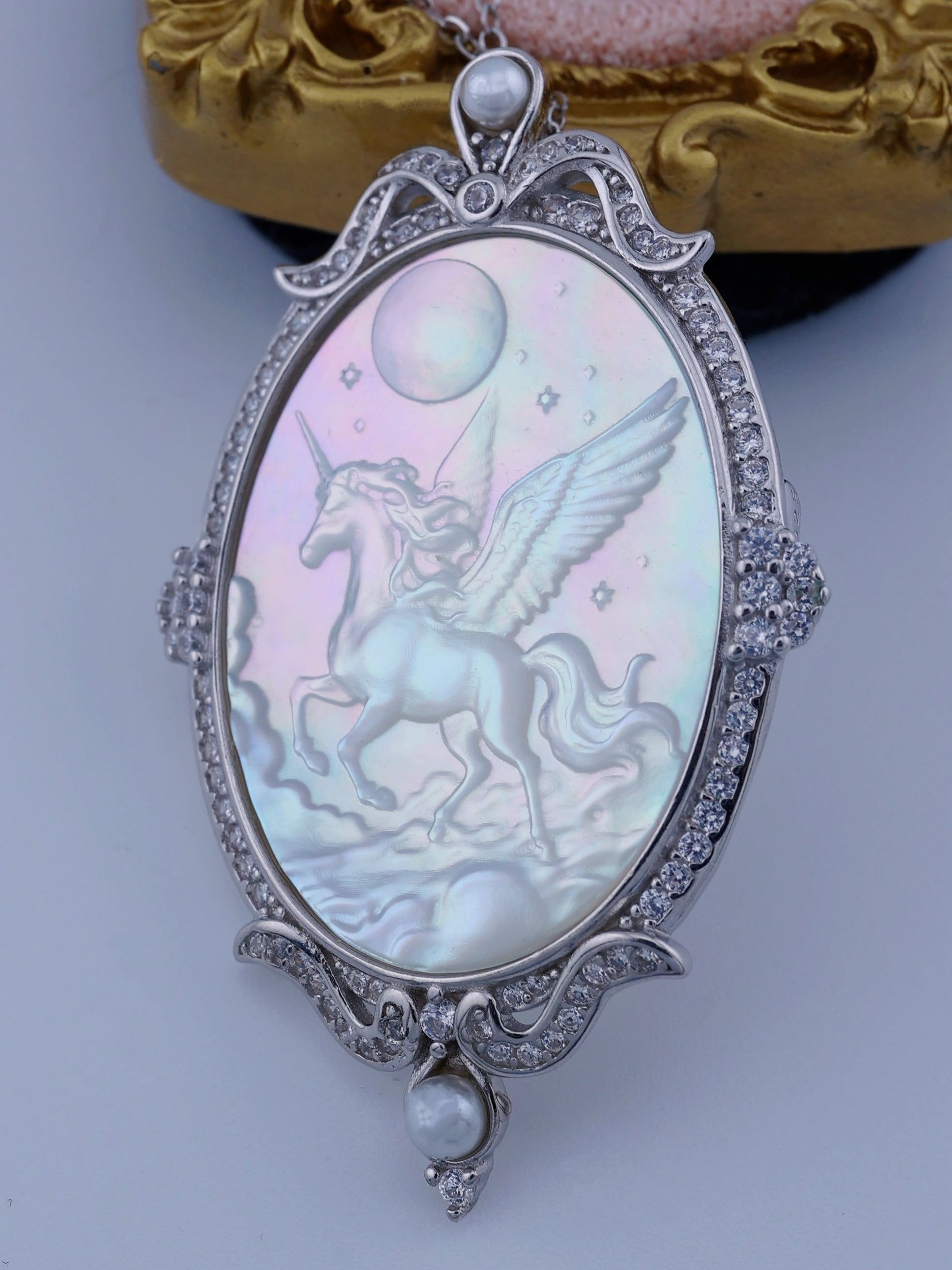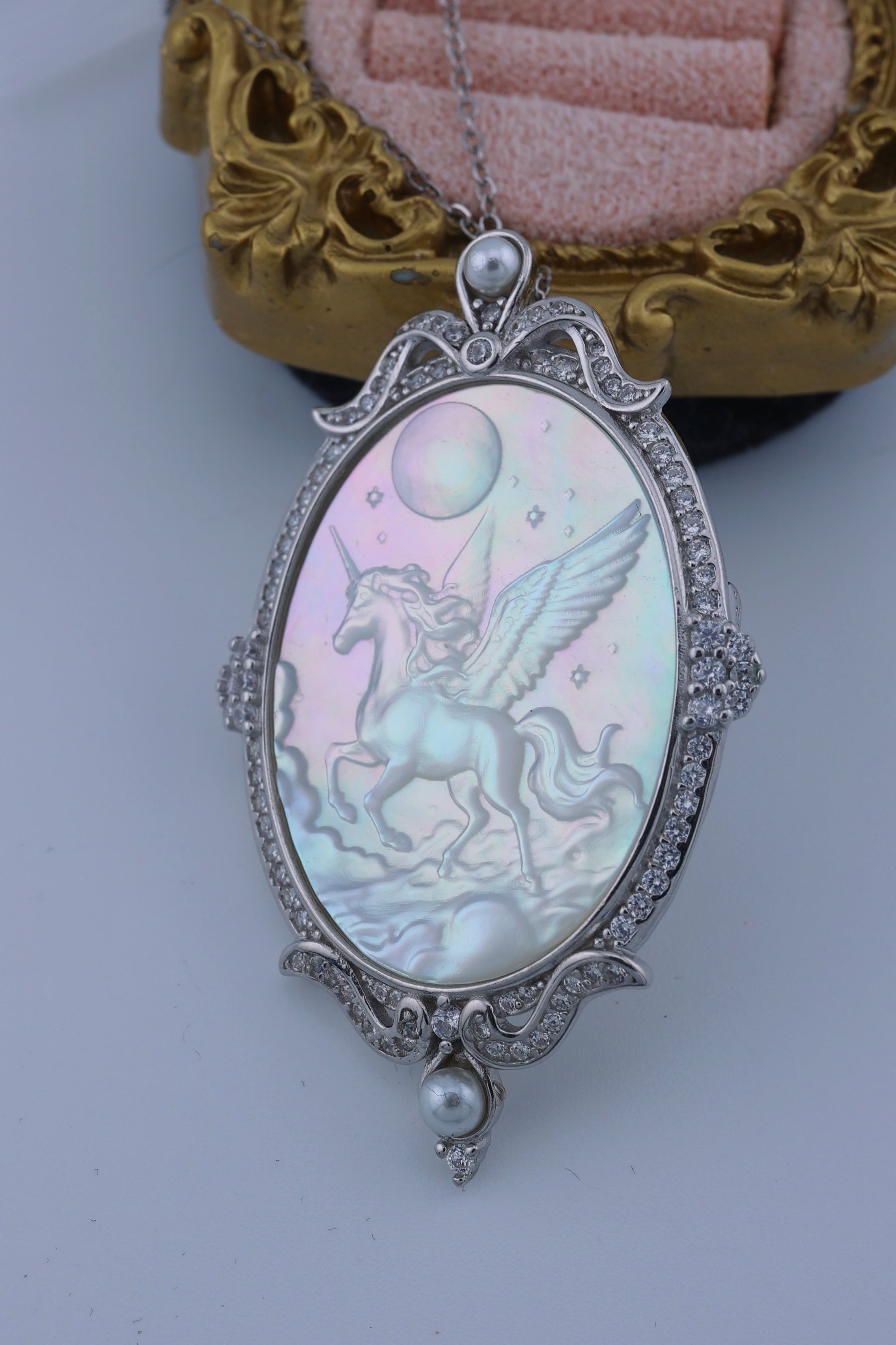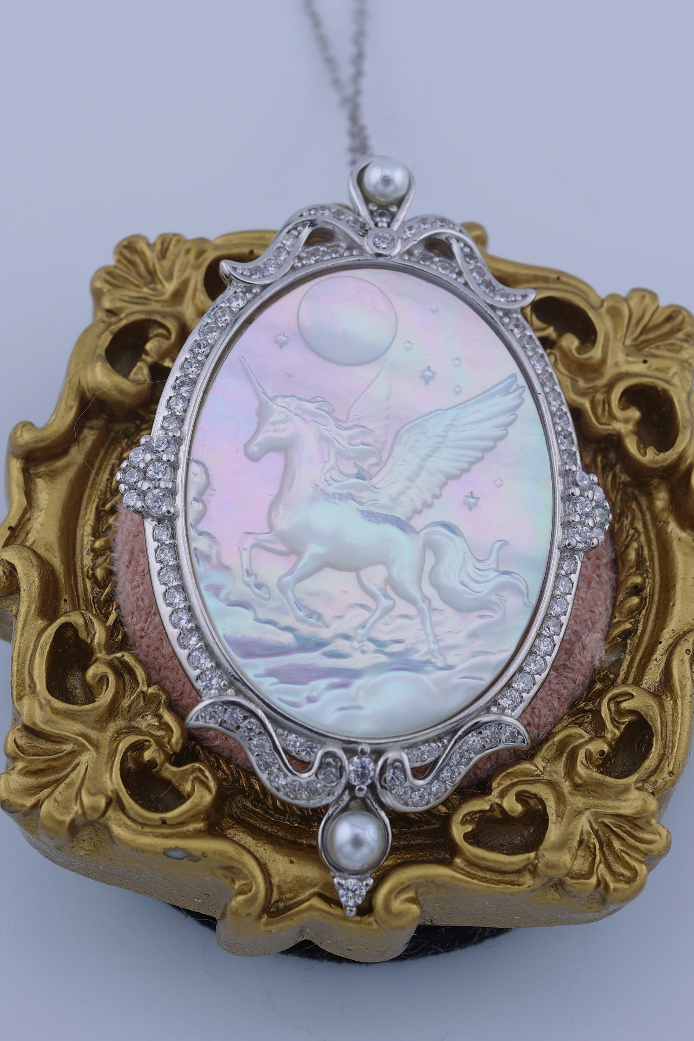 月光のように澄んだ輝きを湛えた白蝶貝に、夜空を駆けるペガサスの姿を繊細に彫刻した、幻想的なペンダント。
