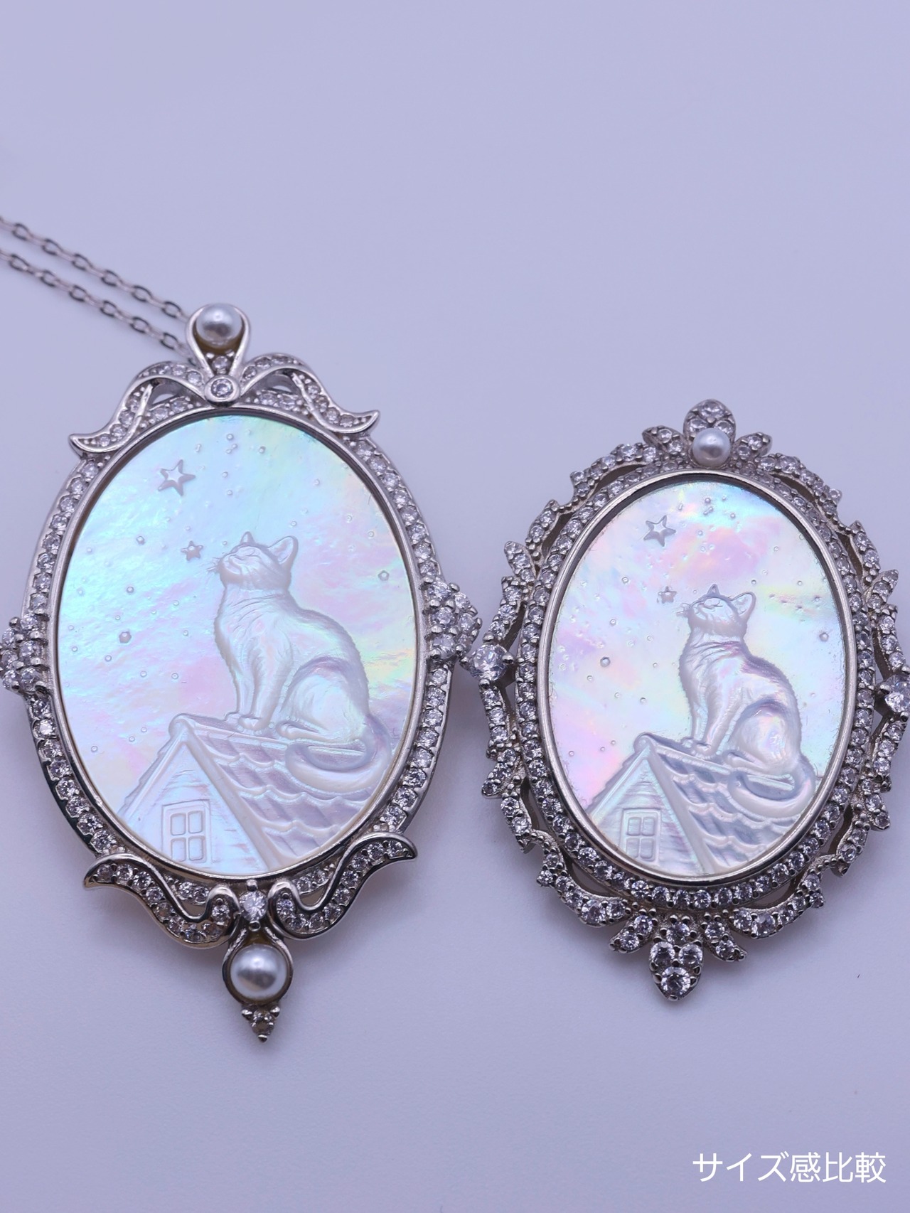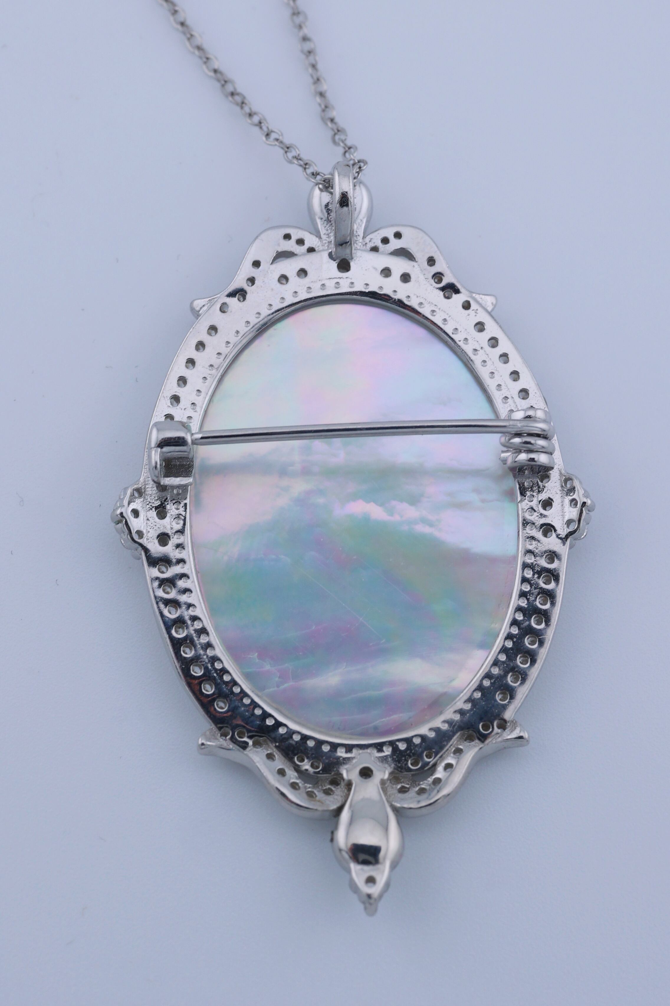透かしの装飾と小粒ストーンが、白蝶貝の清らかな輝きを引き立て、クラシカルで上品な雰囲気を添えています。