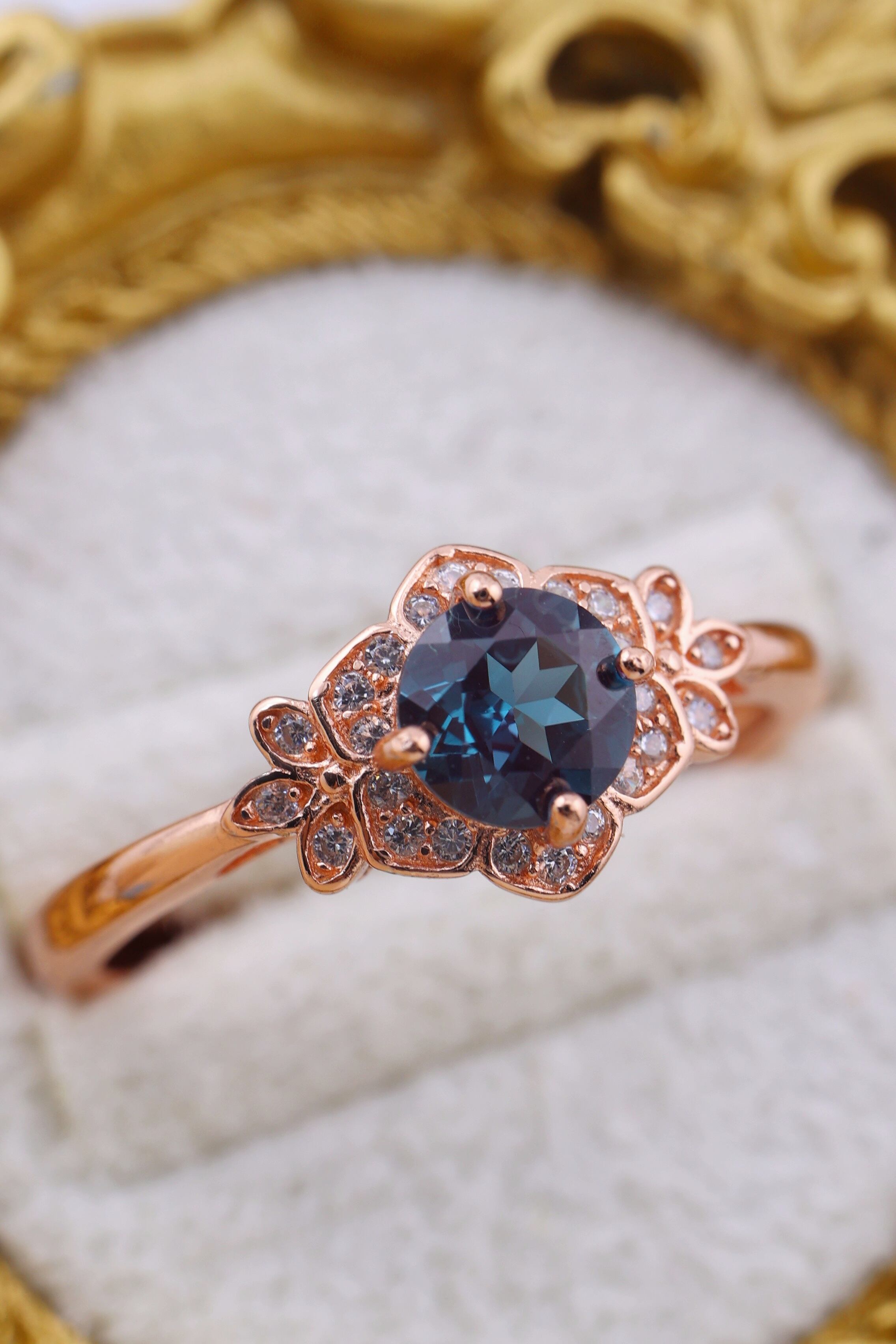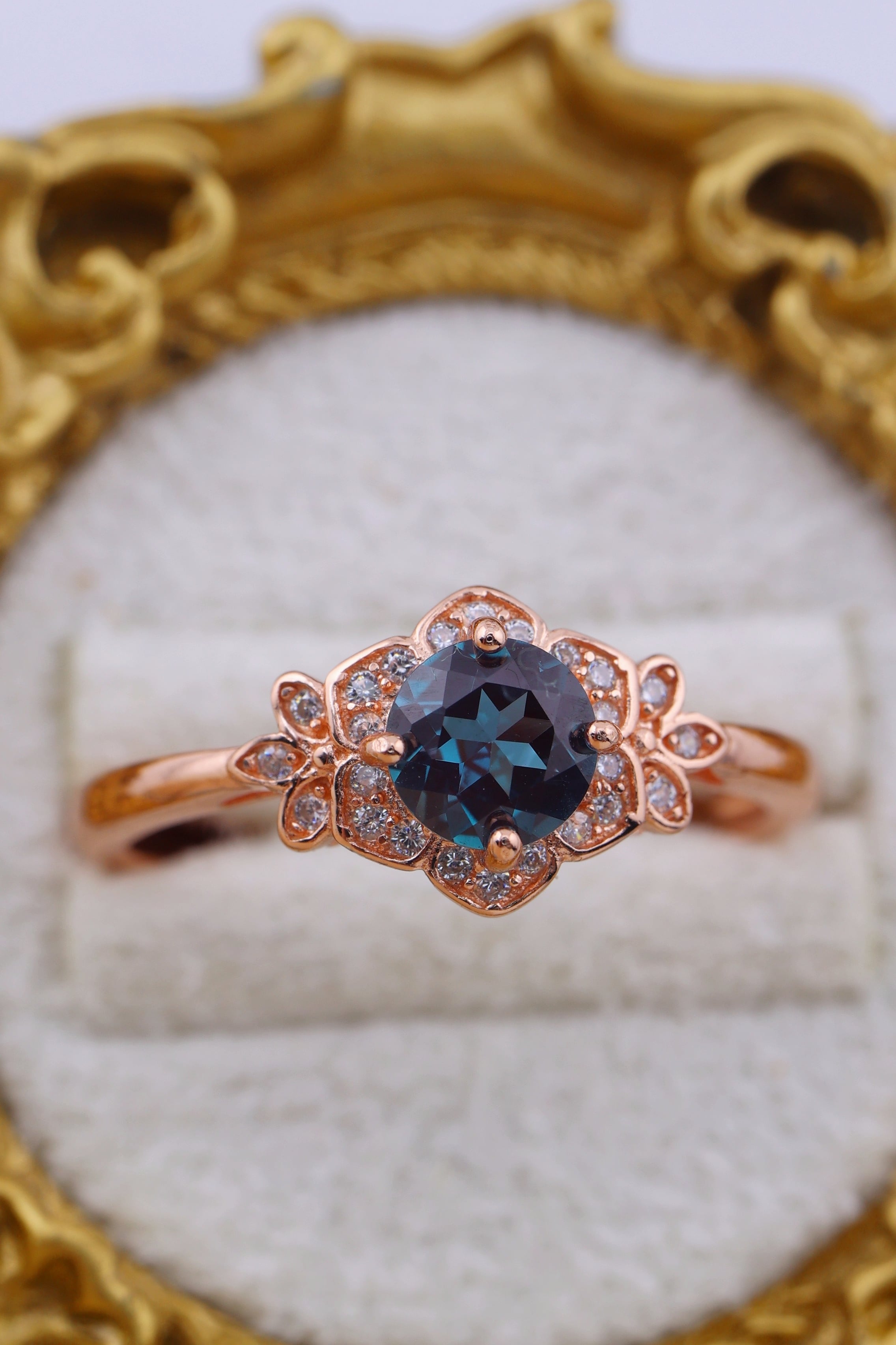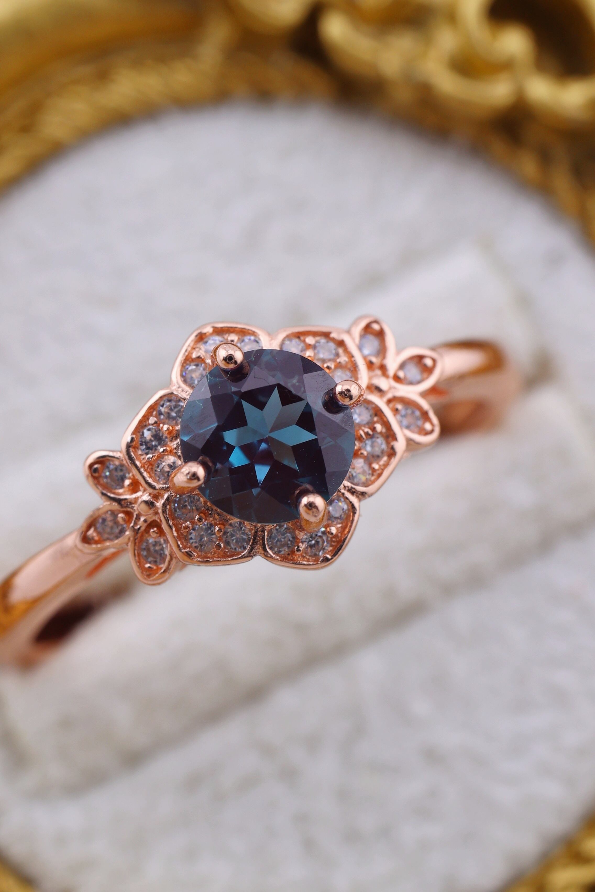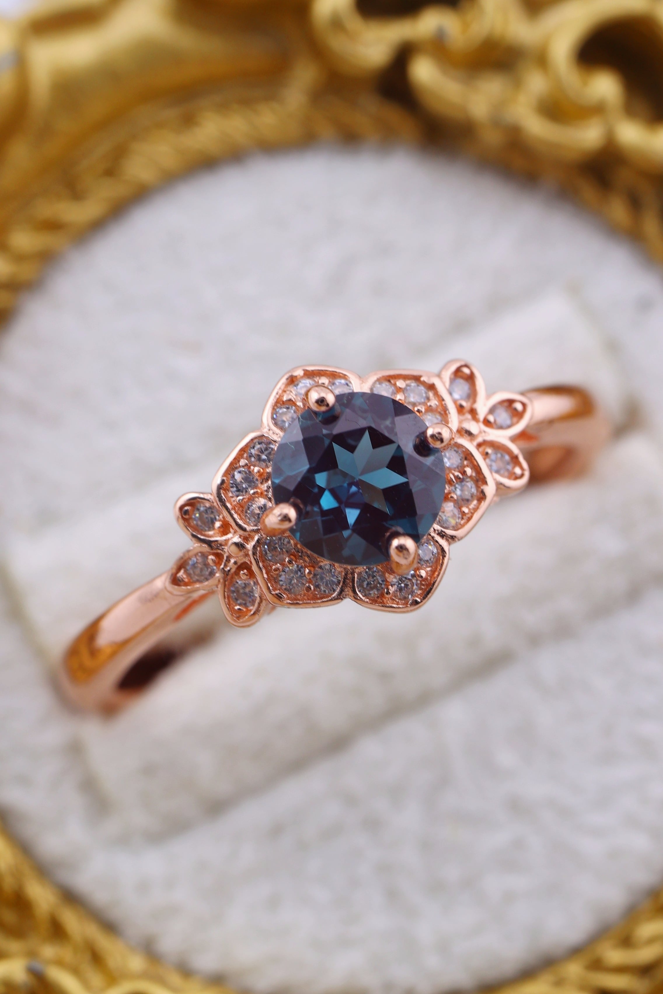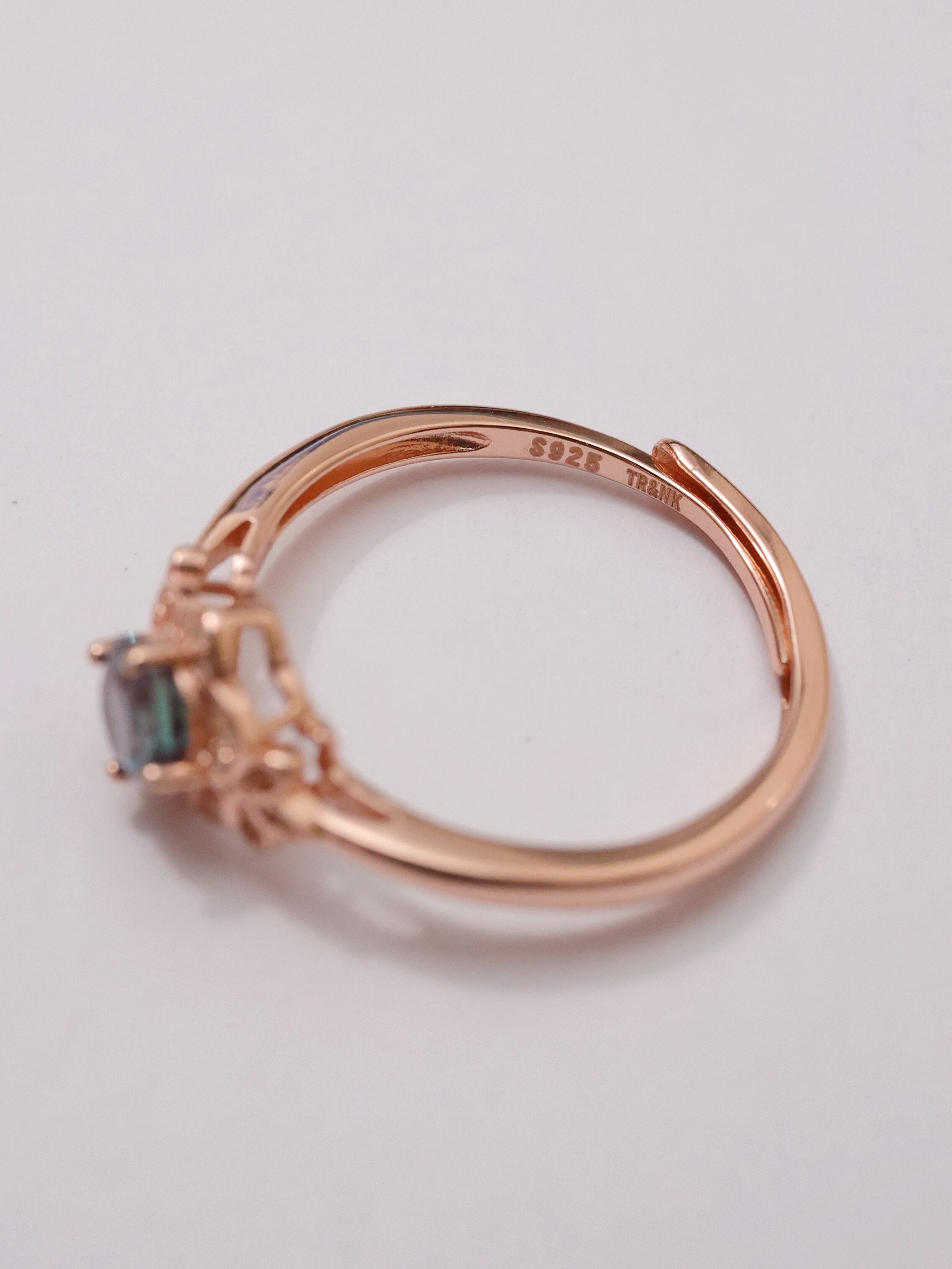 リングの中央にはラボグロウンアレキサンドライトがセットされ、華やかな花びらをイメージしたデザインが周囲を囲みます。シルバー925をベースにK18ピンクゴールドコーティングを施し、さらに7Aランクのジルコニアをアクセントとしてあしらうことで、気品あふれる仕上がりになっています。花のように優雅なフォルムは、着ける人の指先をまるで光の輪で包み込むかのようです。