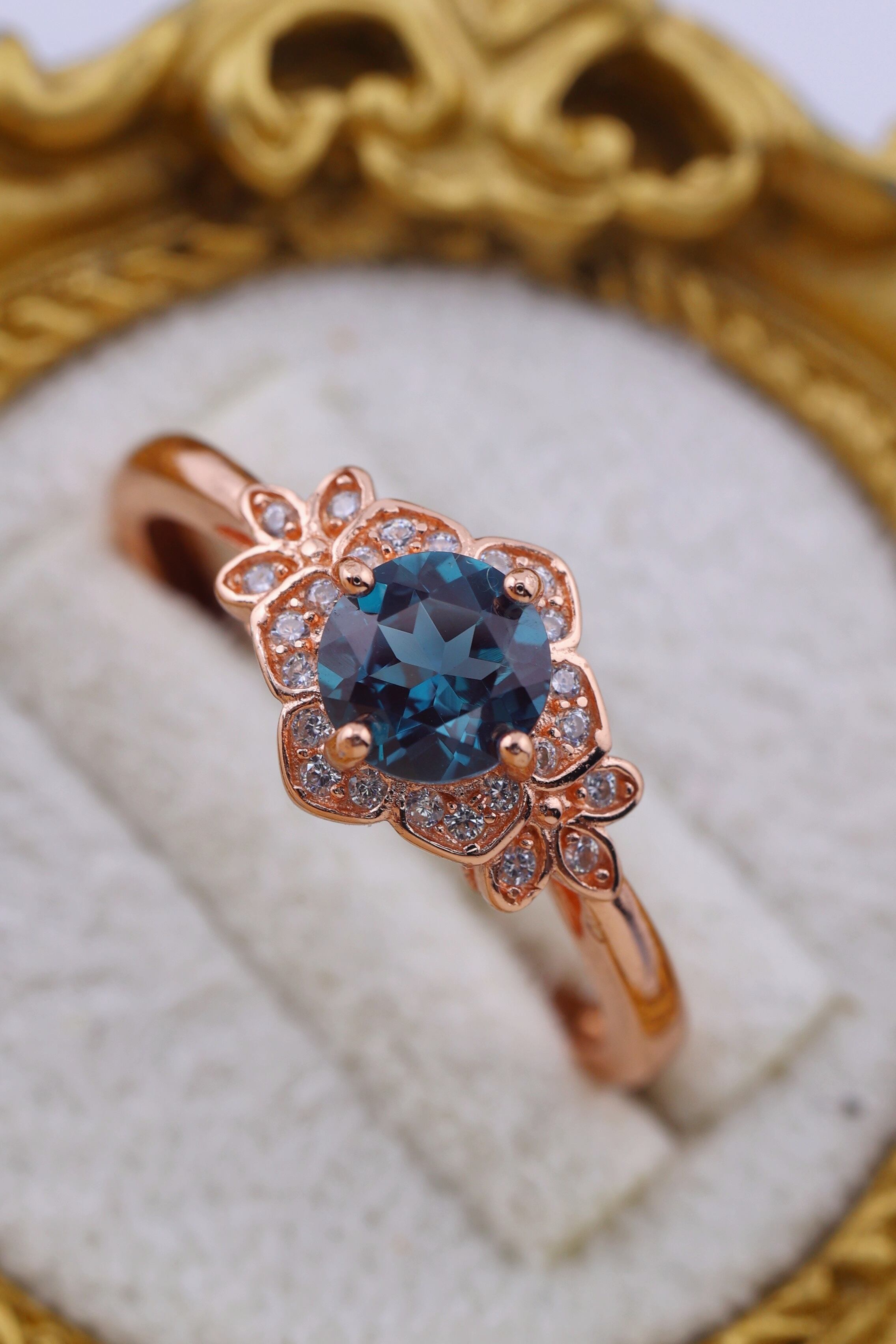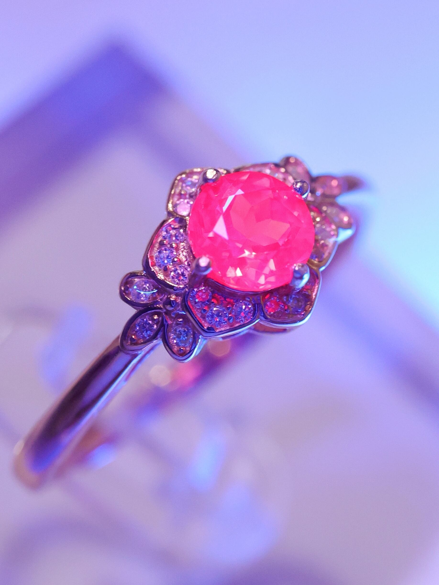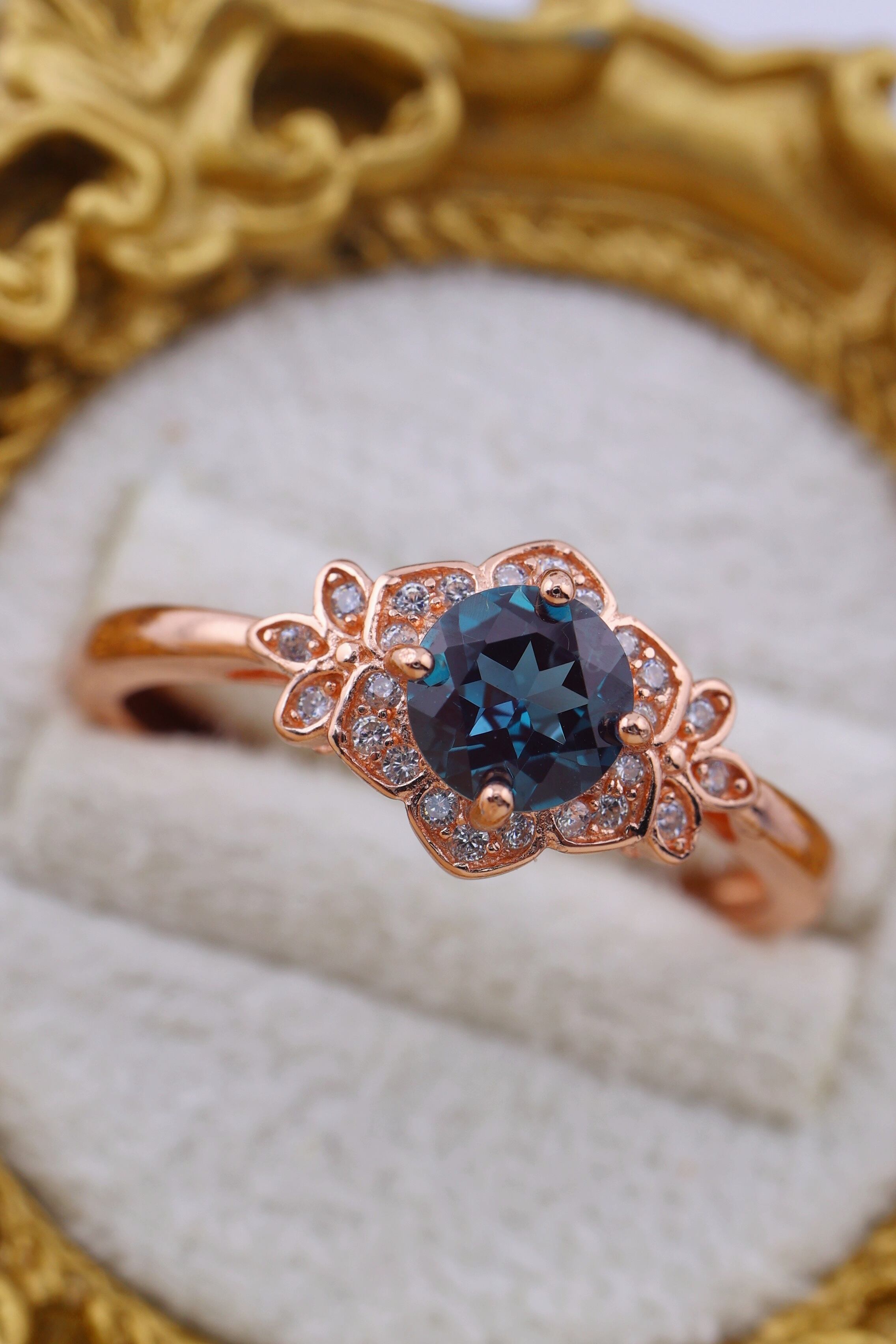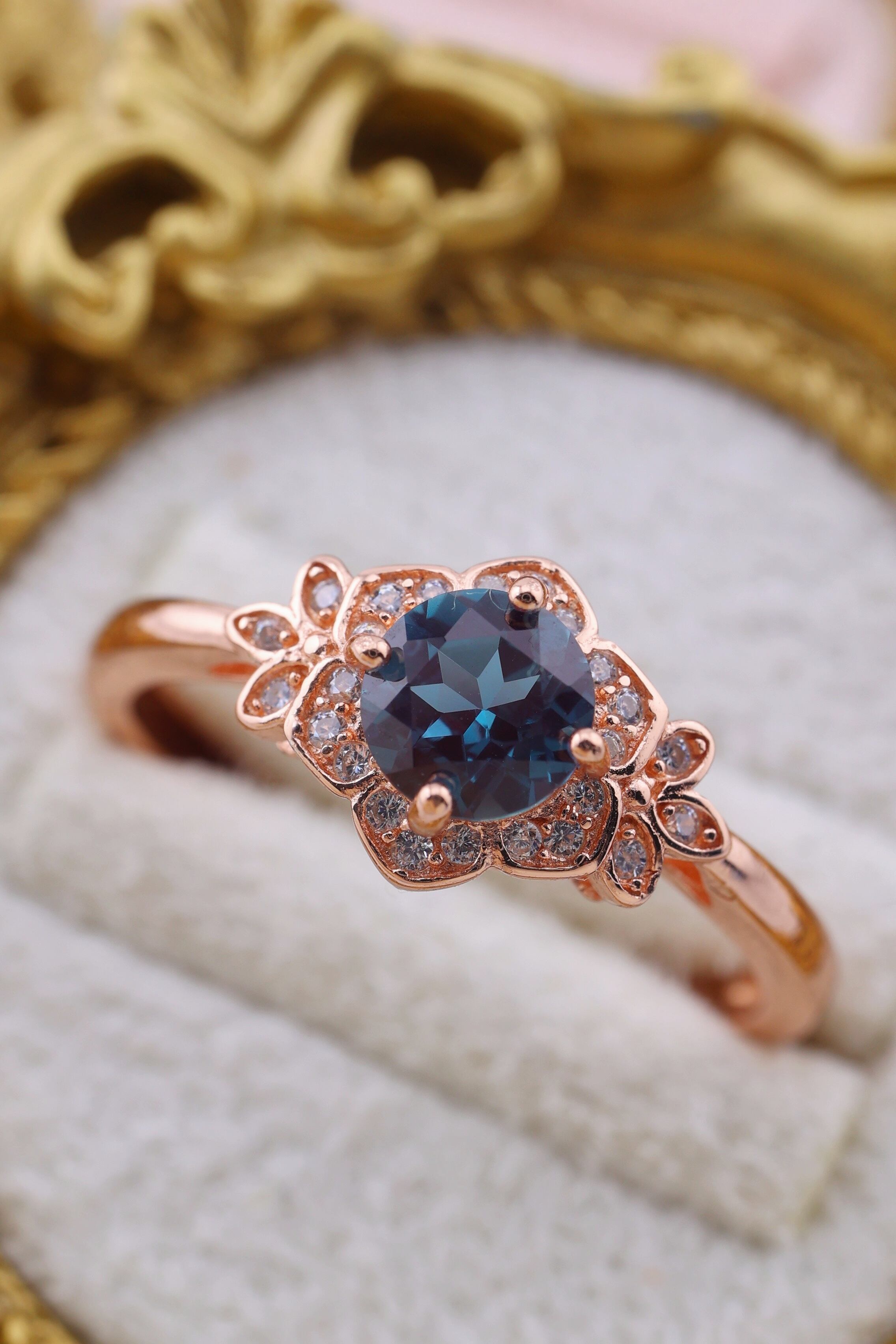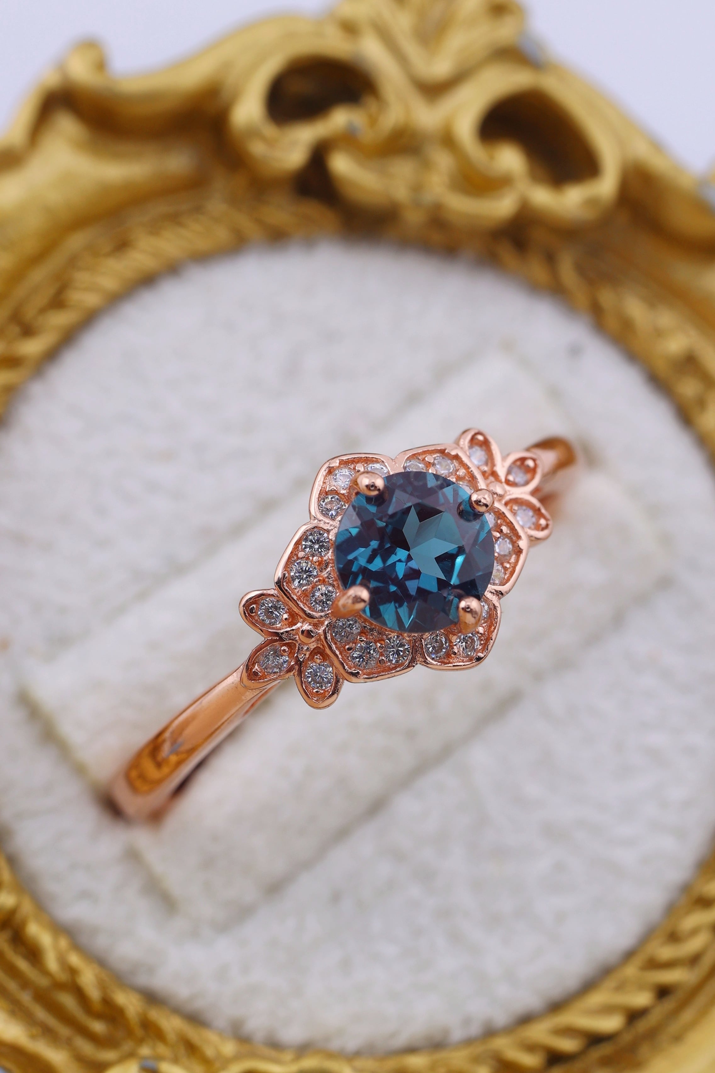 リングの中央にはラボグロウンアレキサンドライトがセットされ、華やかな花びらをイメージしたデザインが周囲を囲みます。シルバー925をベースにK18ピンクゴールドコーティングを施し、さらに7Aランクのジルコニアをアクセントとしてあしらうことで、気品あふれる仕上がりになっています。花のように優雅なフォルムは、着ける人の指先をまるで光の輪で包み込むかのようです。