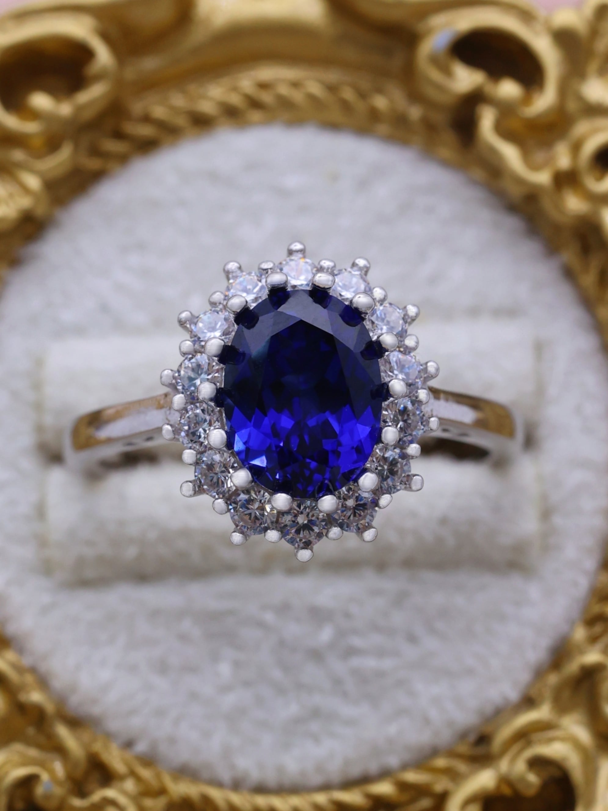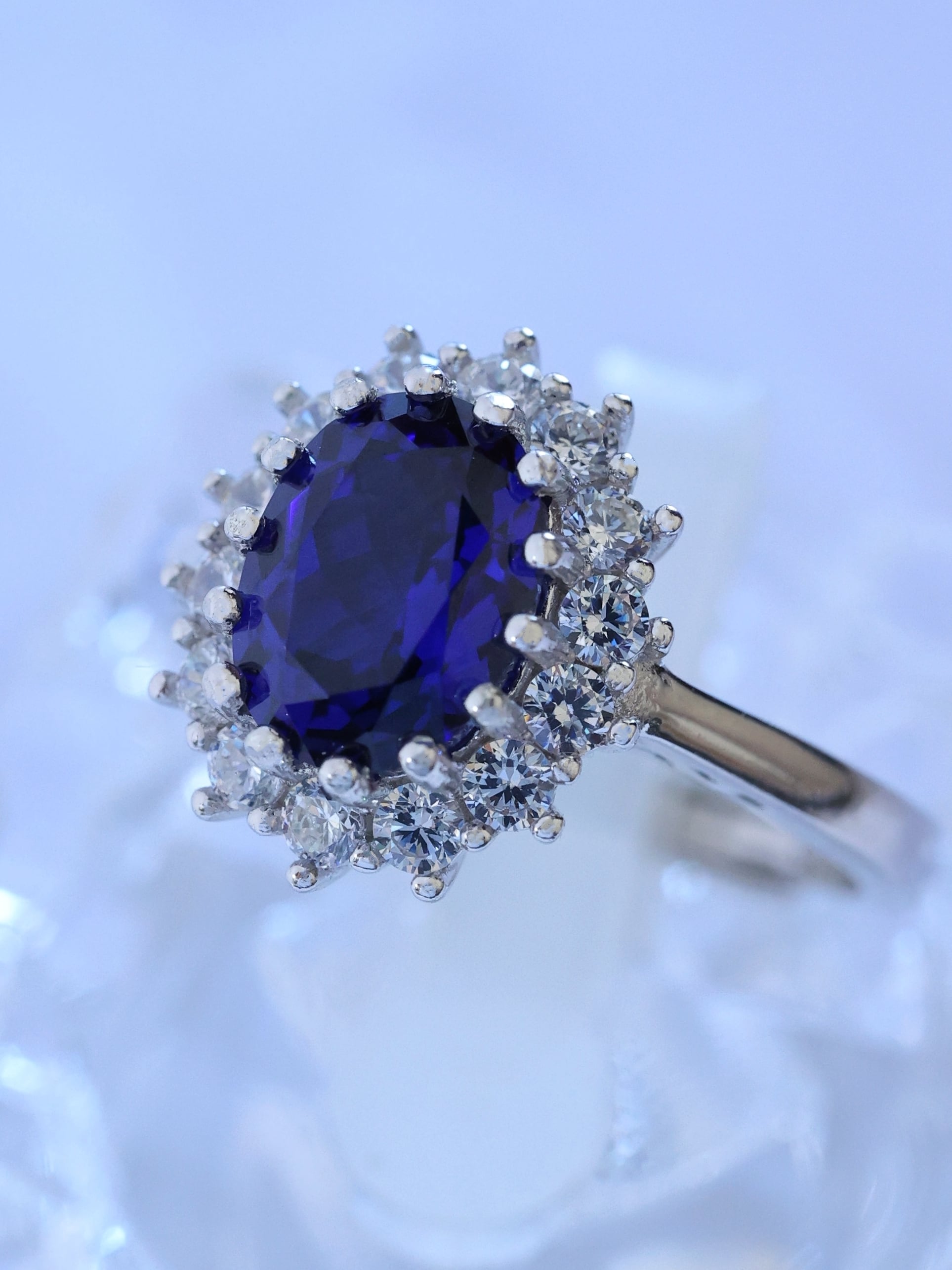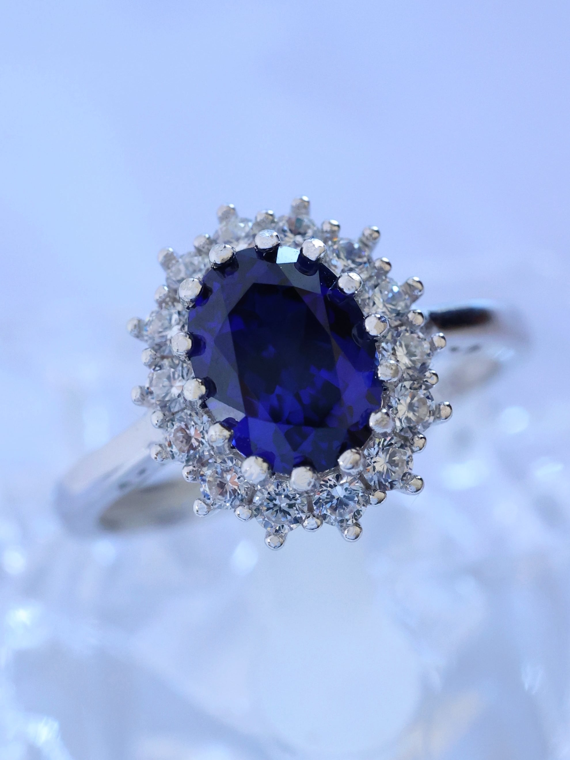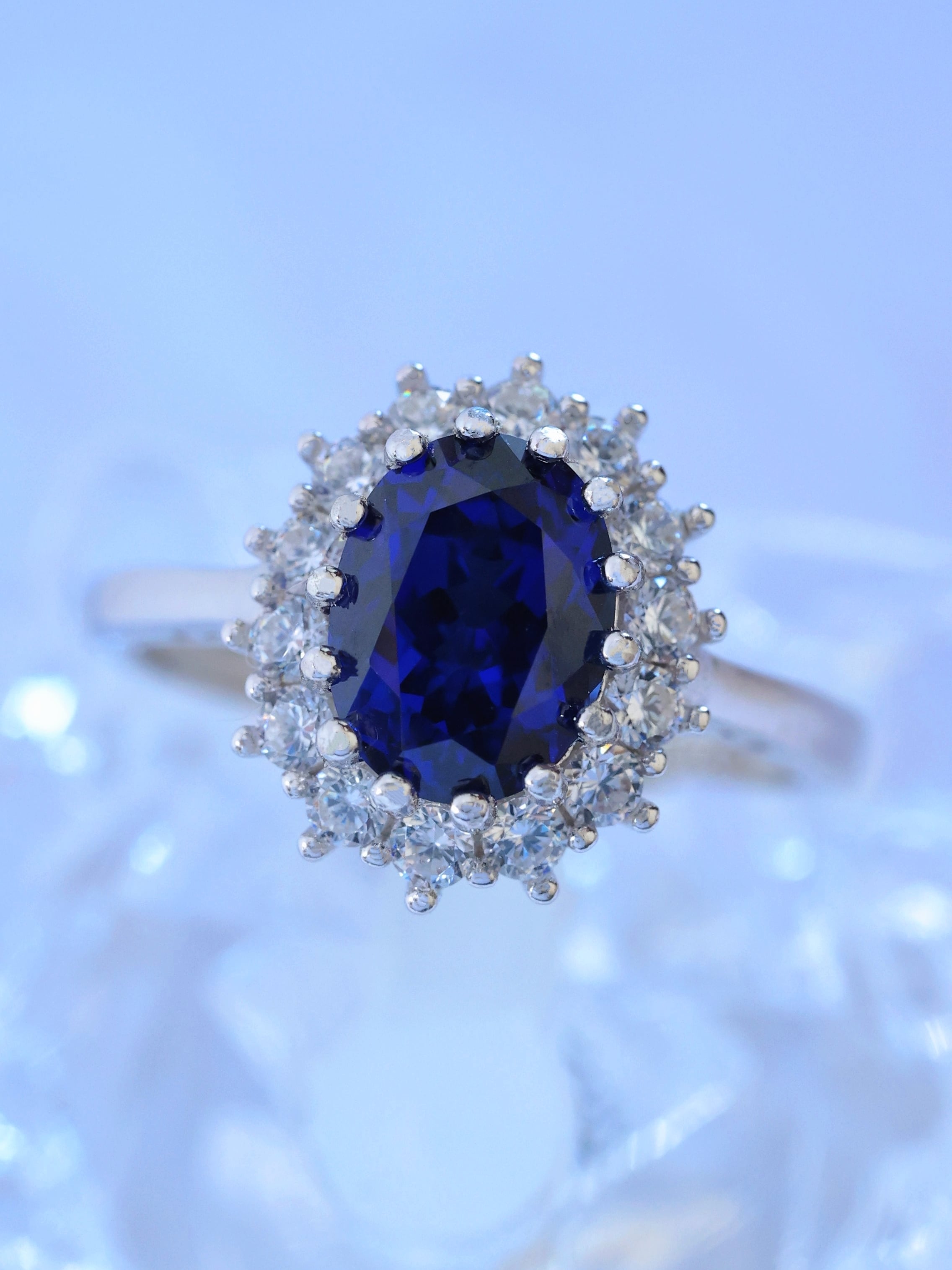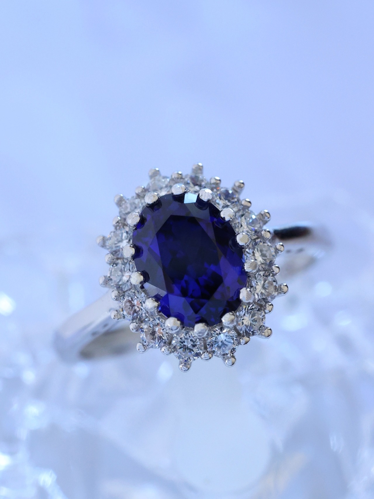 中央のロイヤルブルーサファイアを、きらめくクリアストーンが優雅に囲み、まるで気高い花が咲いたような華やかさを演出しています。