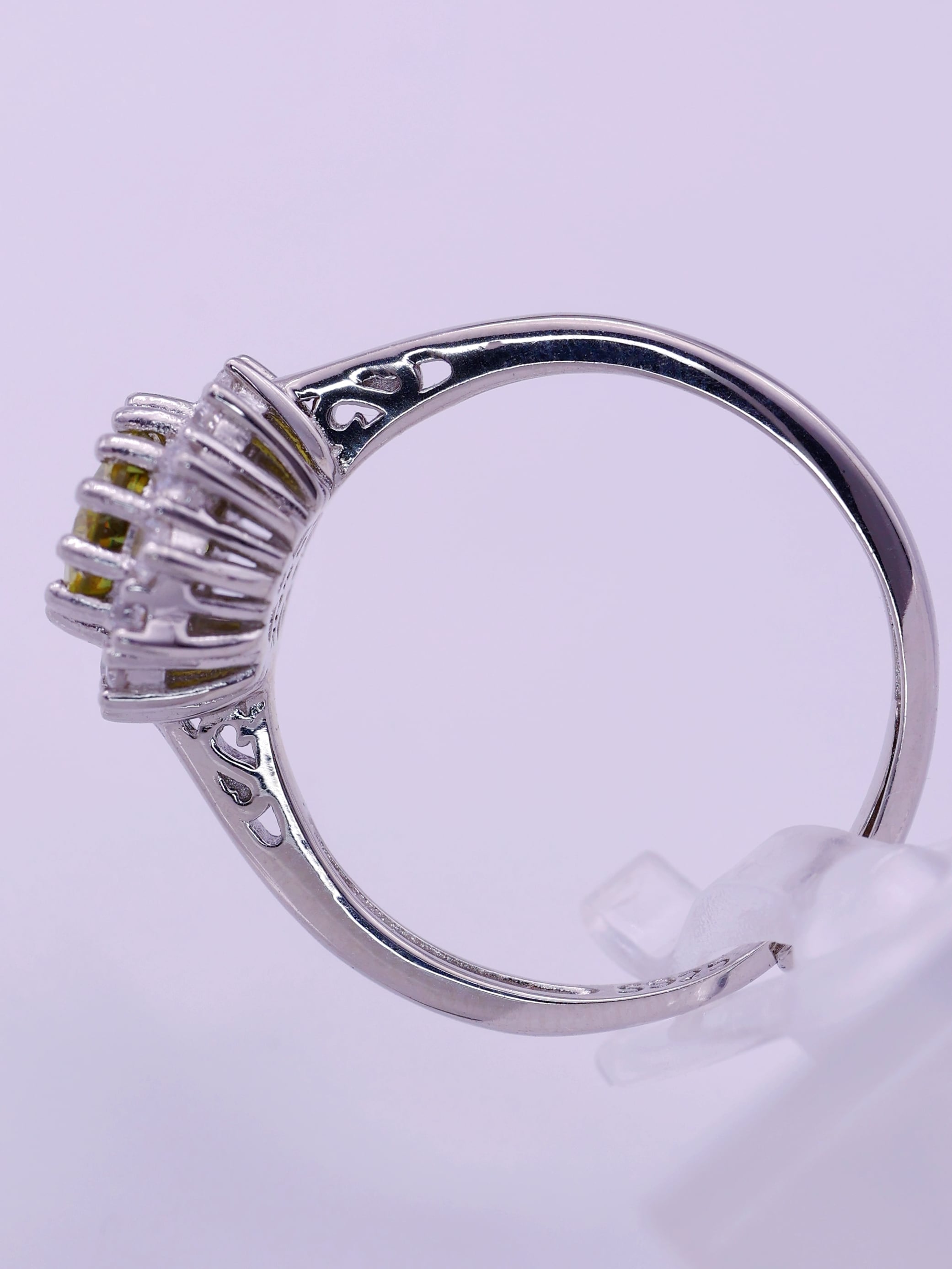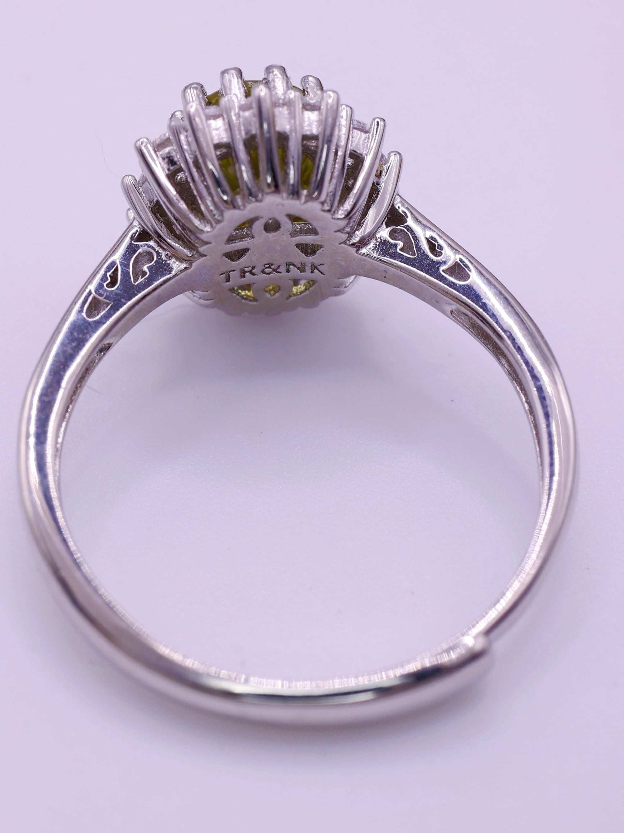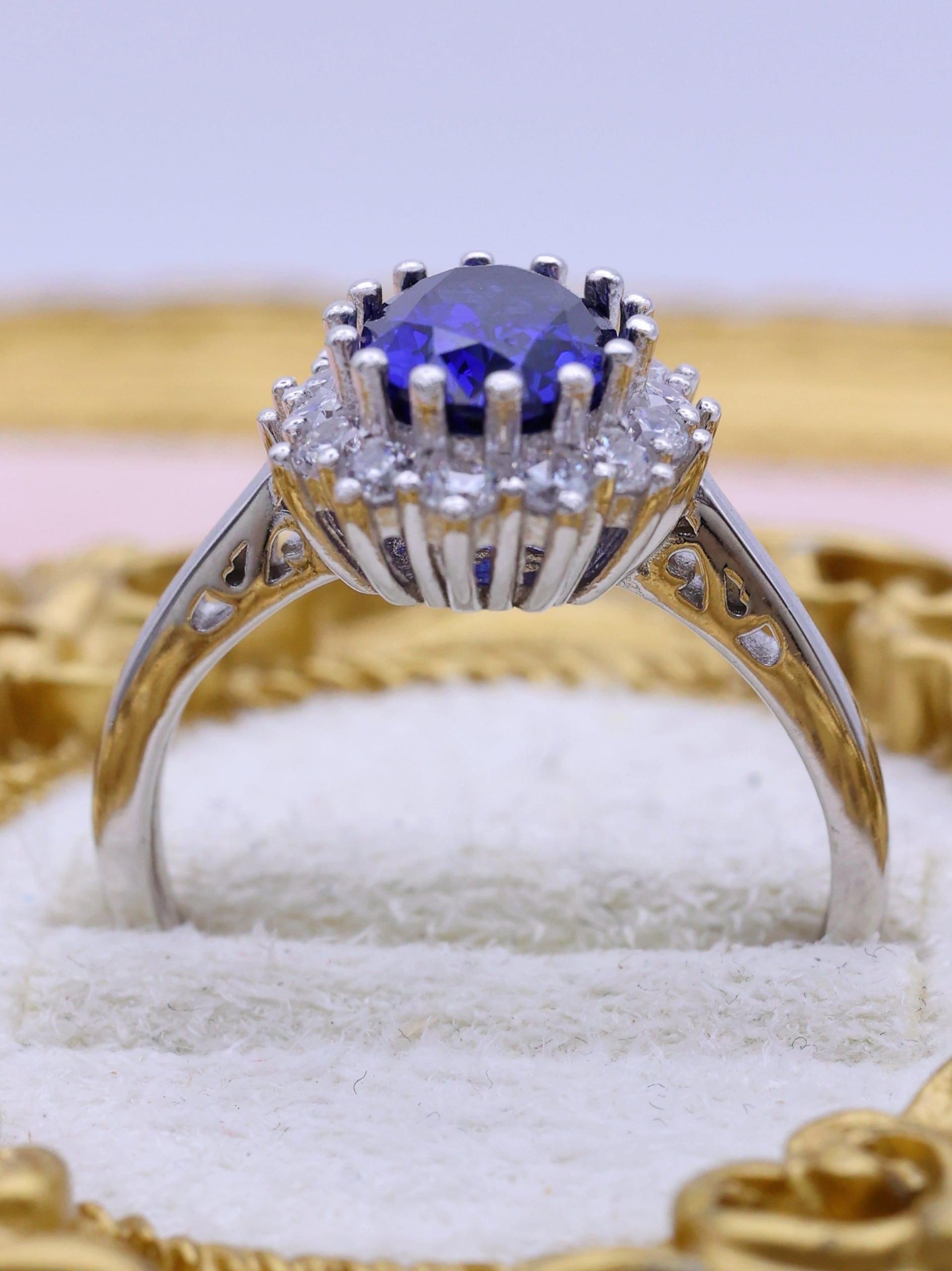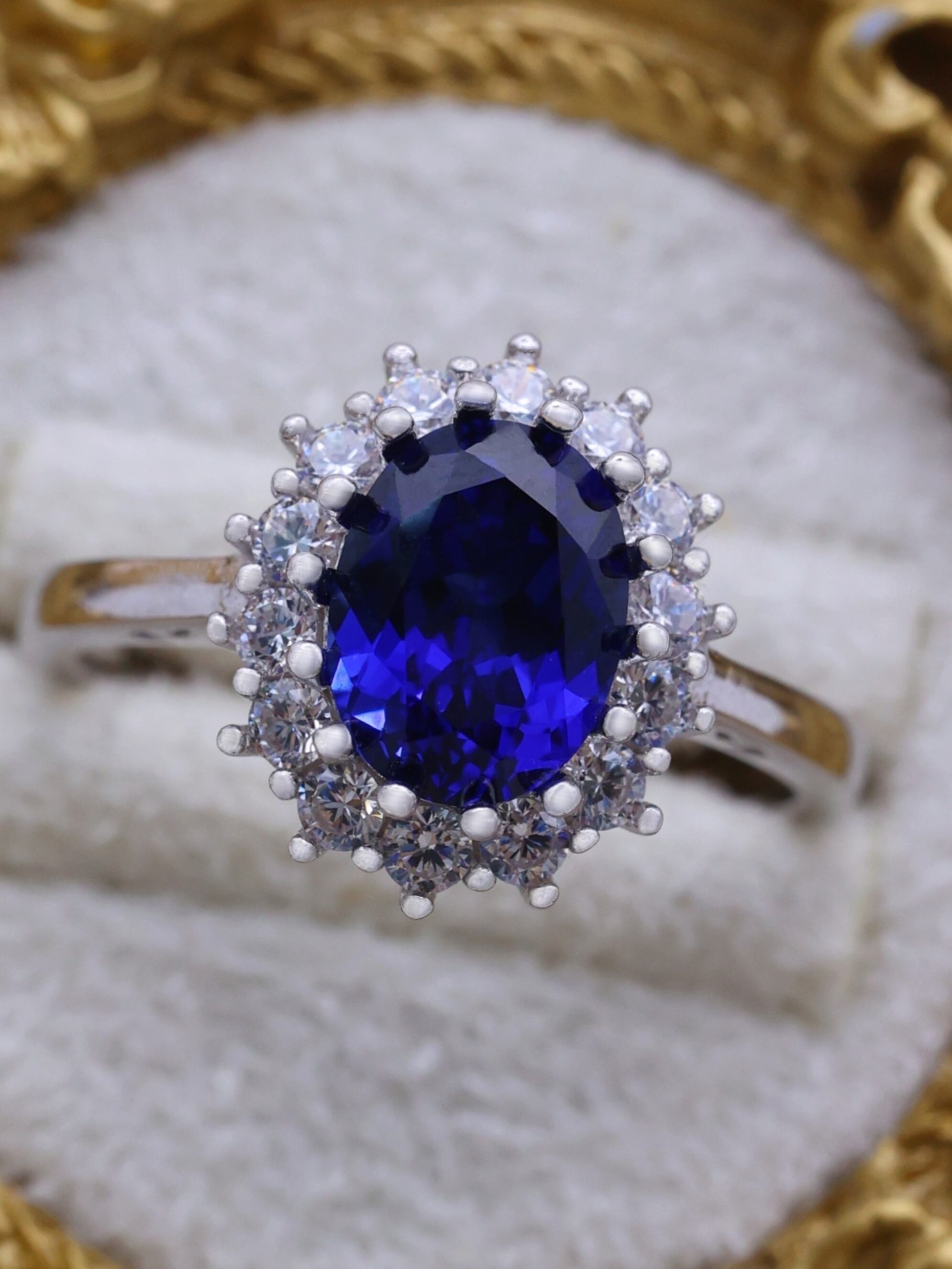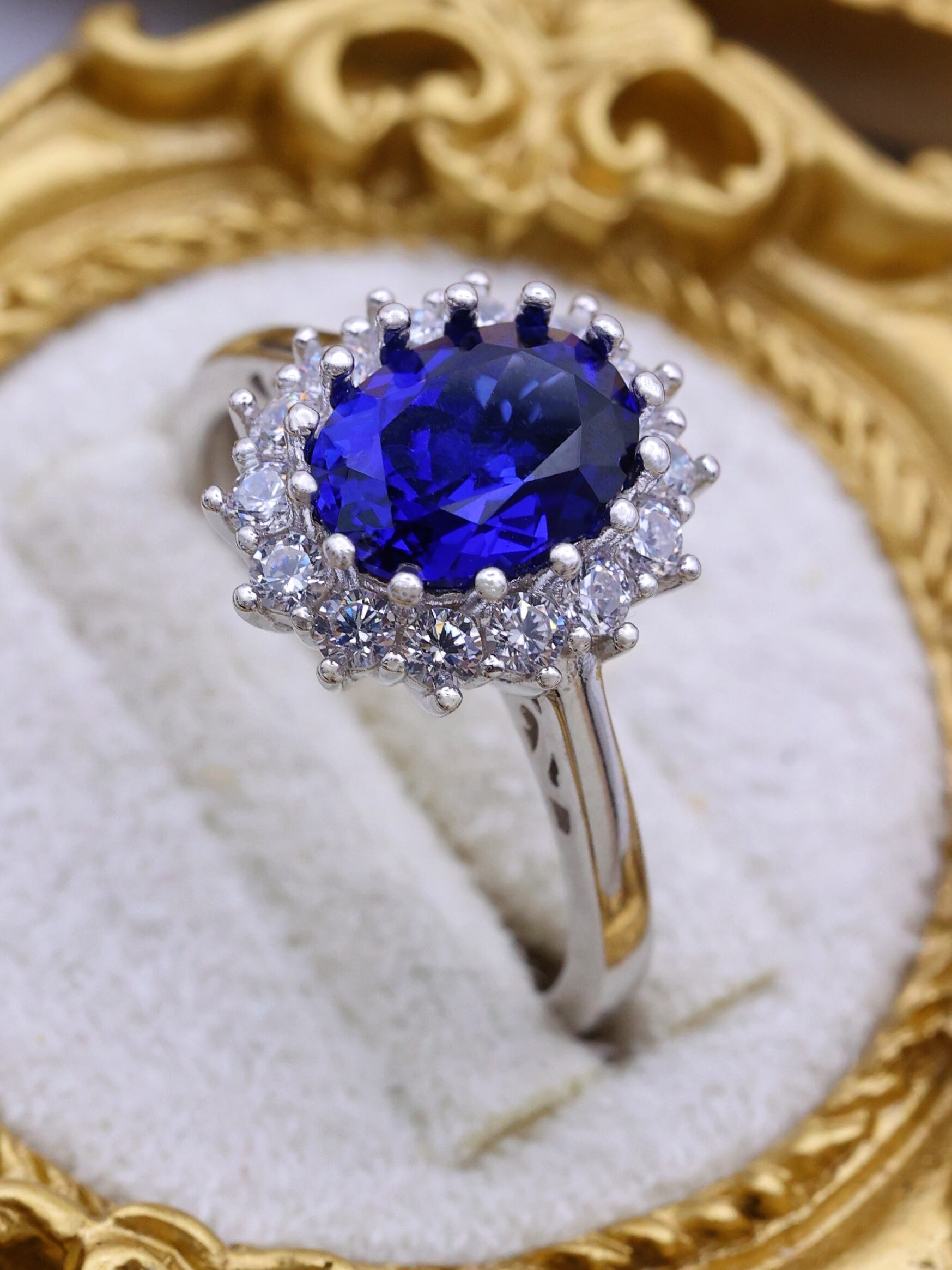 中央のロイヤルブルーサファイアを、きらめくクリアストーンが優雅に囲み、まるで気高い花が咲いたような華やかさを演出しています。
