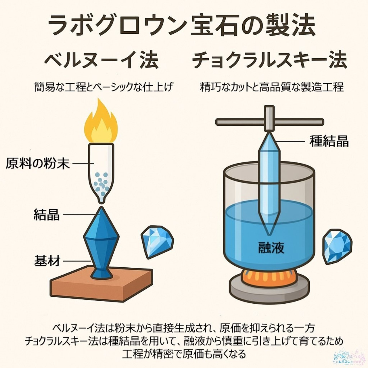 ただし、「合成サファイア」と一括りにされる従来の合成石(炎融法=ベルヌーイ法)とは大きく異なります。