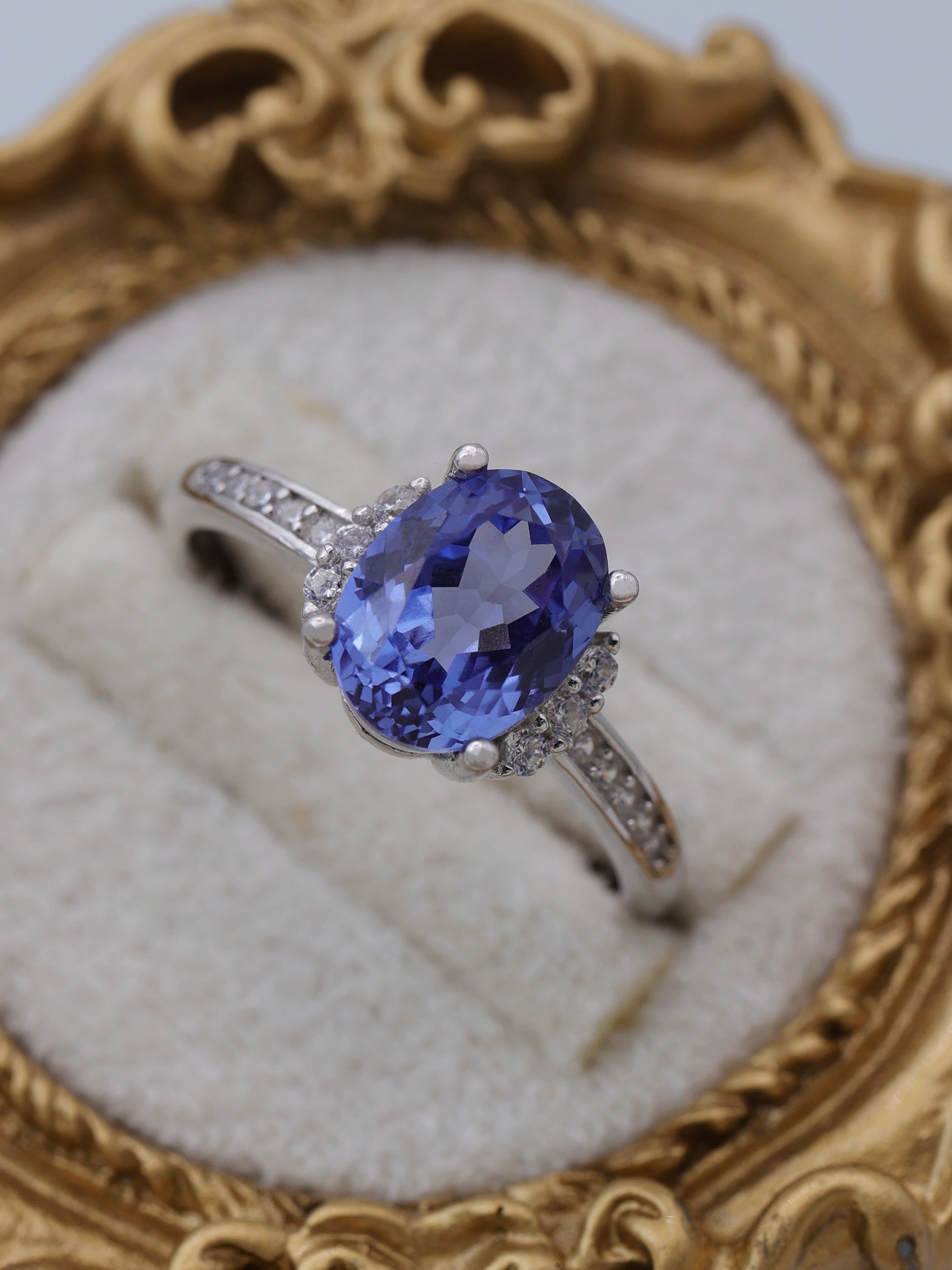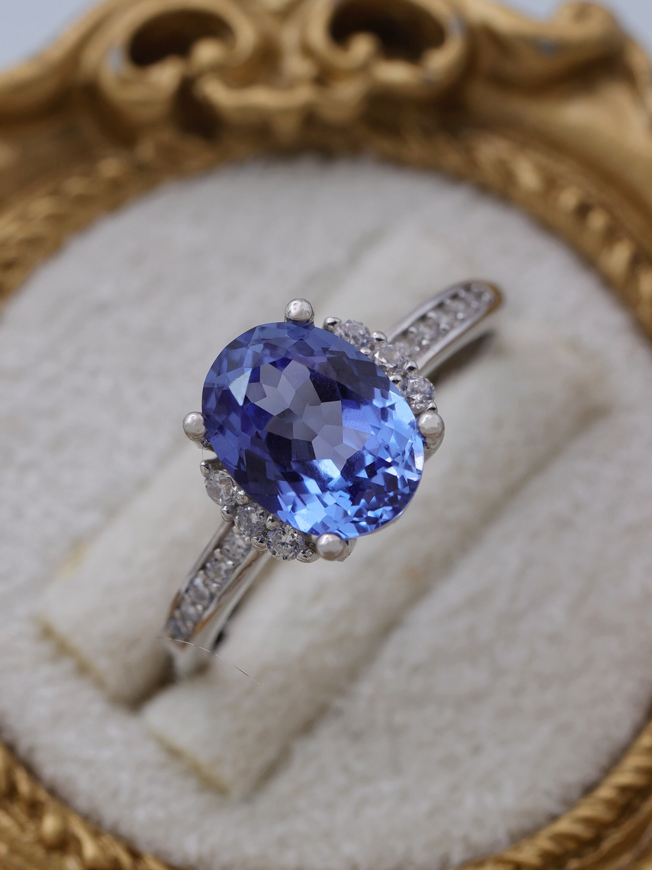 リングのデザインは、すっきりとしたオーバルカットの主石を中心に、サイドへ小粒のキュービックジルコニアを添えた上品なスタイル。