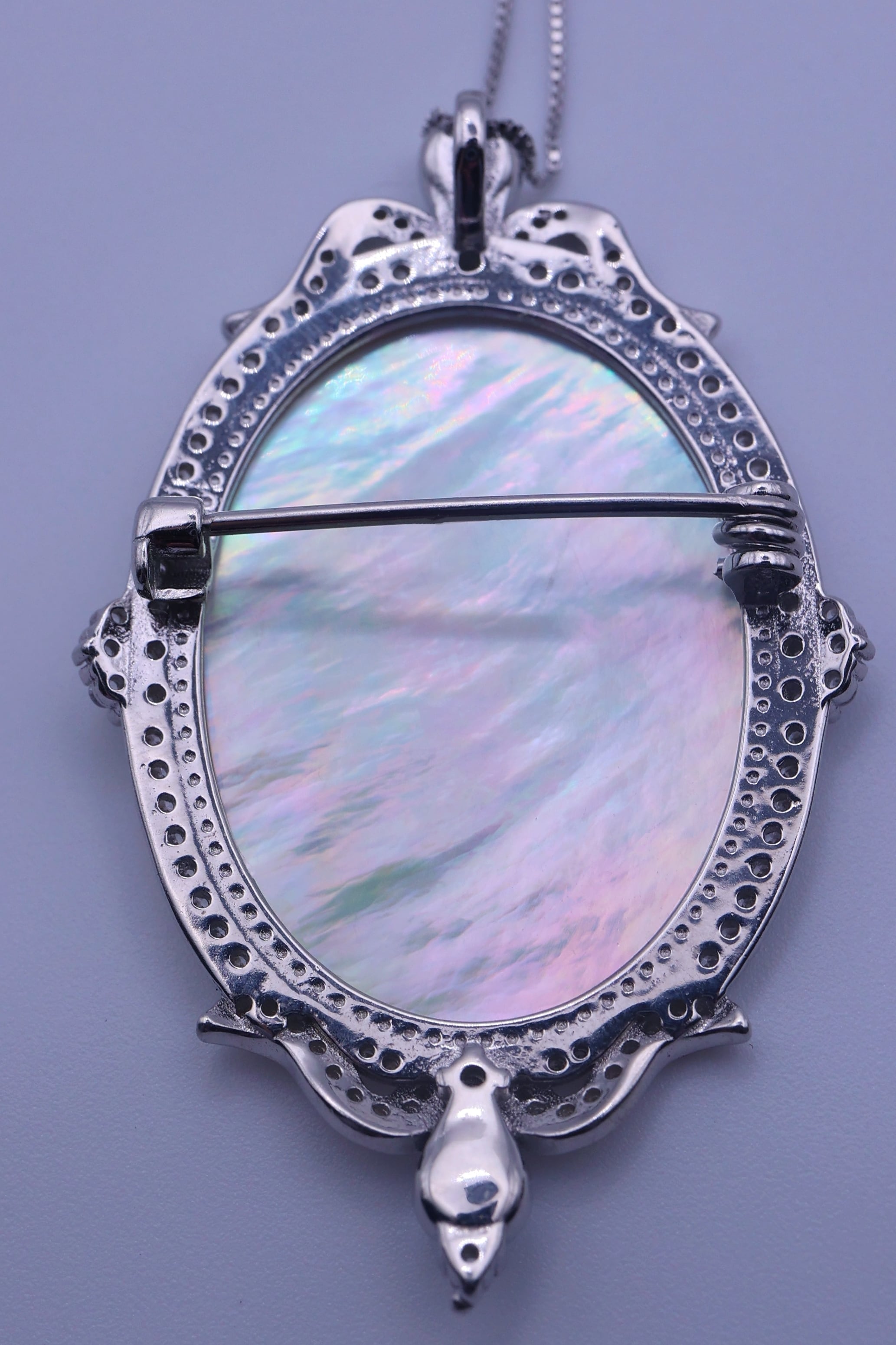 裏面にはブローチ金具を備え、チェーンを通せばペンダントとして、装いに合わせて ペンダント/ブローチの2WAY でお楽しみいただけます。