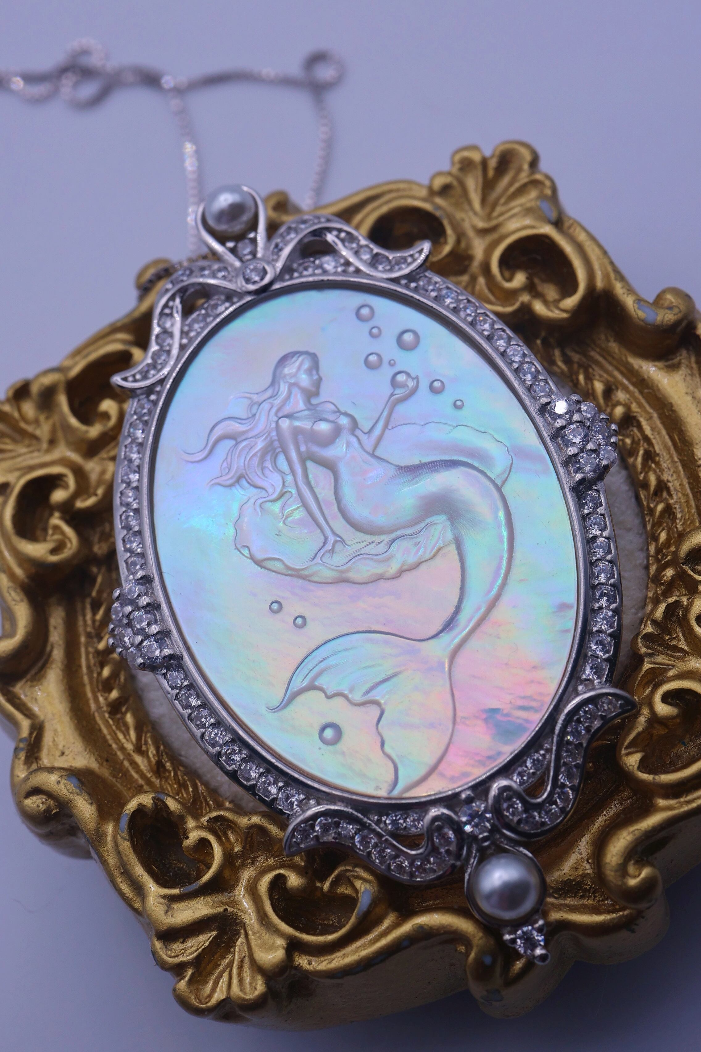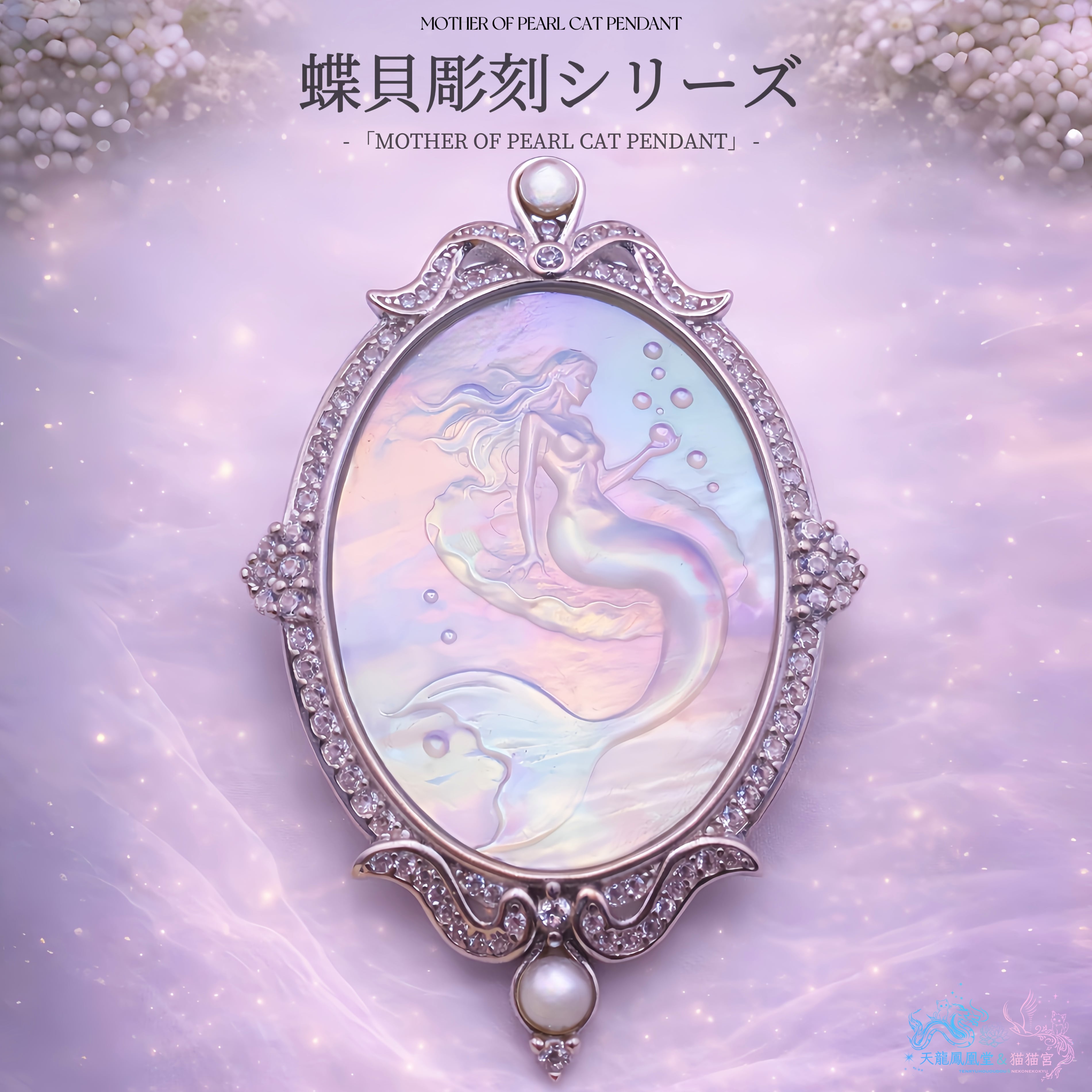 本作は、オーストラリア産の白蝶貝(マザーオブパール)を使用した、幻想的なマーメイドモチーフのペンダントです。