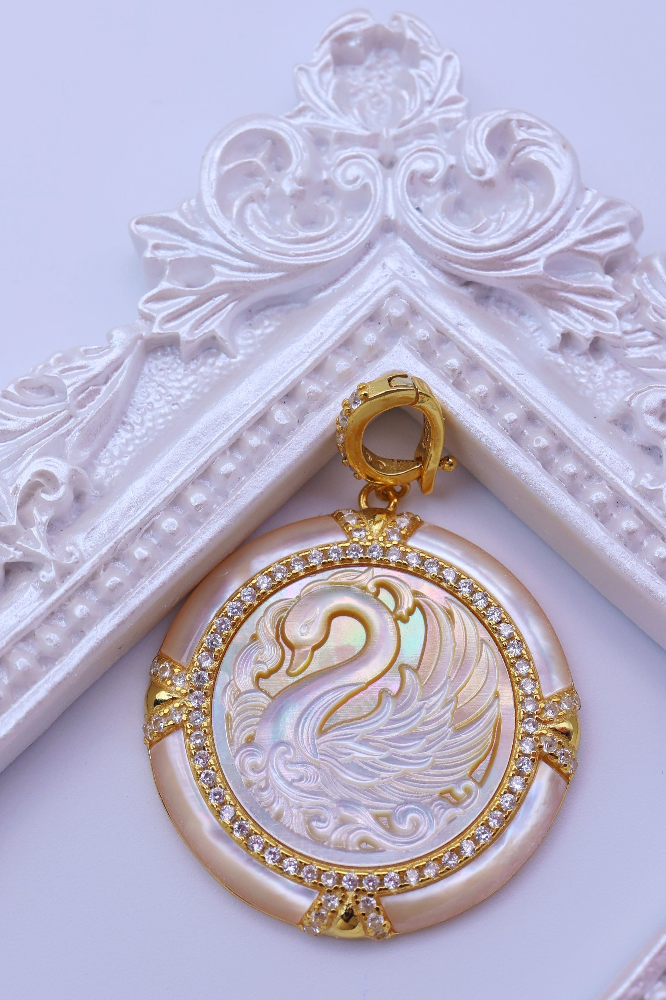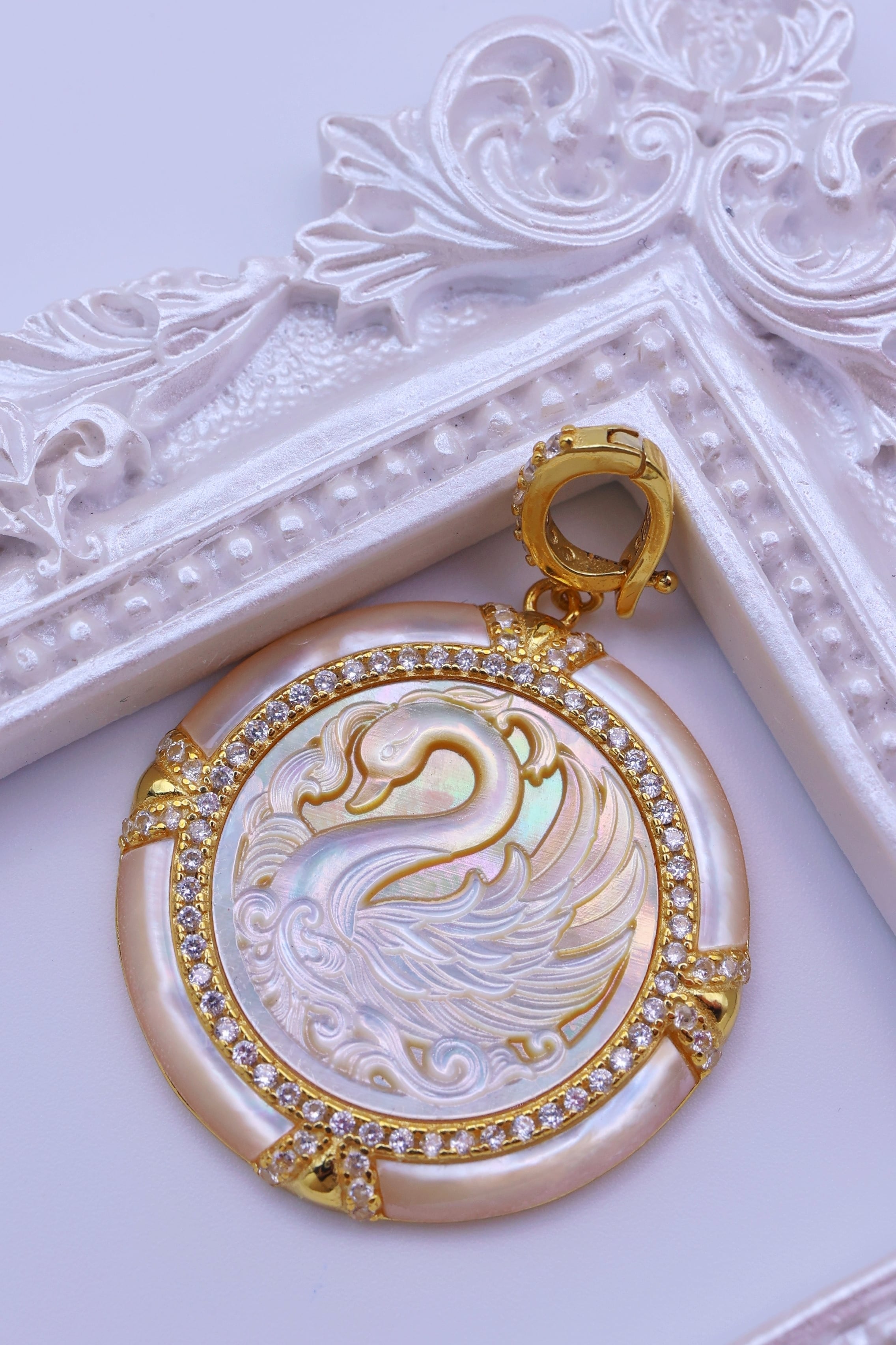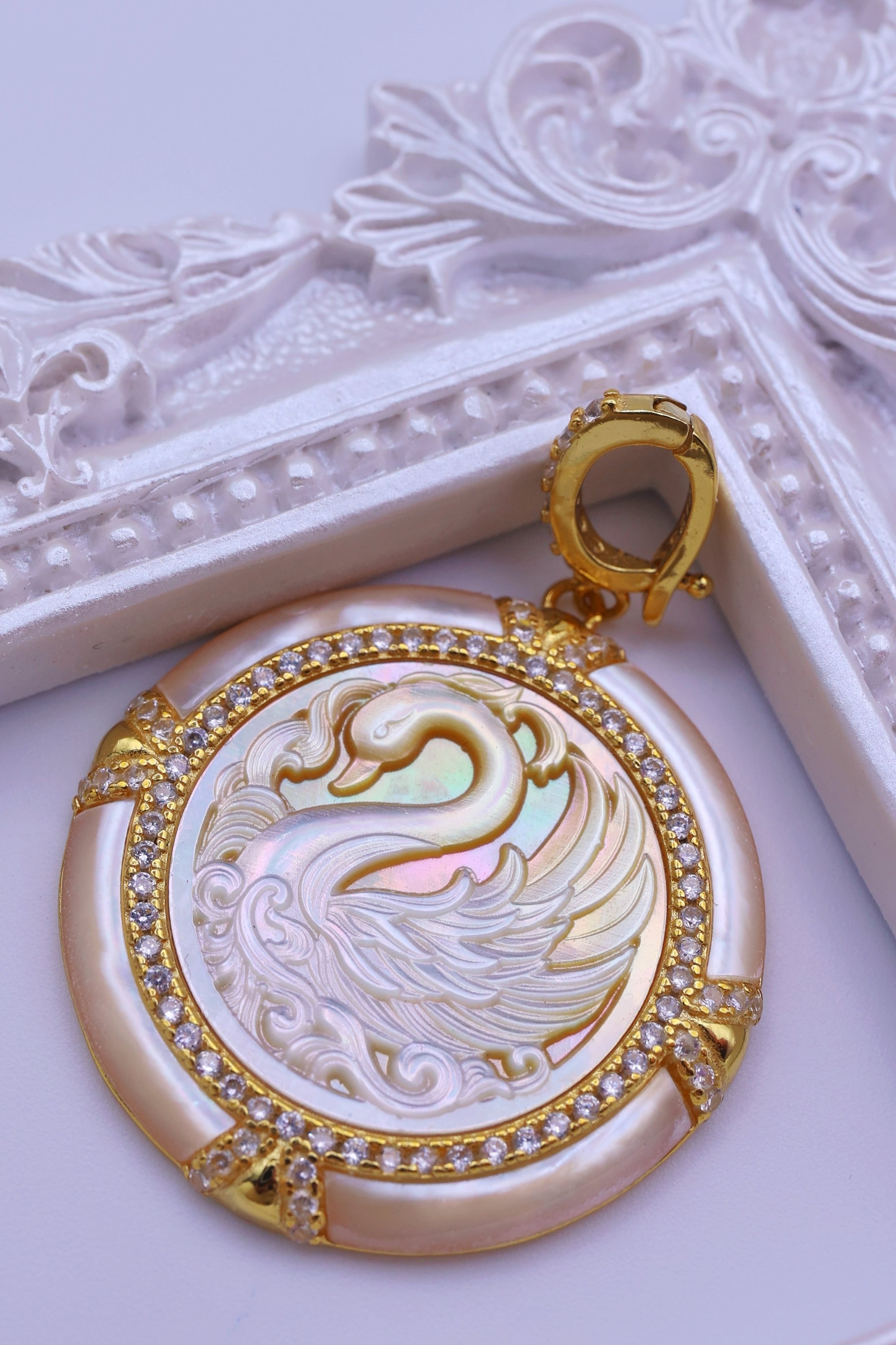 虹色の光を帯びた白蝶貝に、優雅に佇む白鳥の姿を繊細に彫刻した、幻想的なペンダント。しなやかに弧を描く首元や、幾重にも重なる羽の流れ、水面にたゆたうような優美な気配まで丁寧に表現されており、白鳥ならではの気品と静かな存在感が感じられる意匠に仕上がっています。