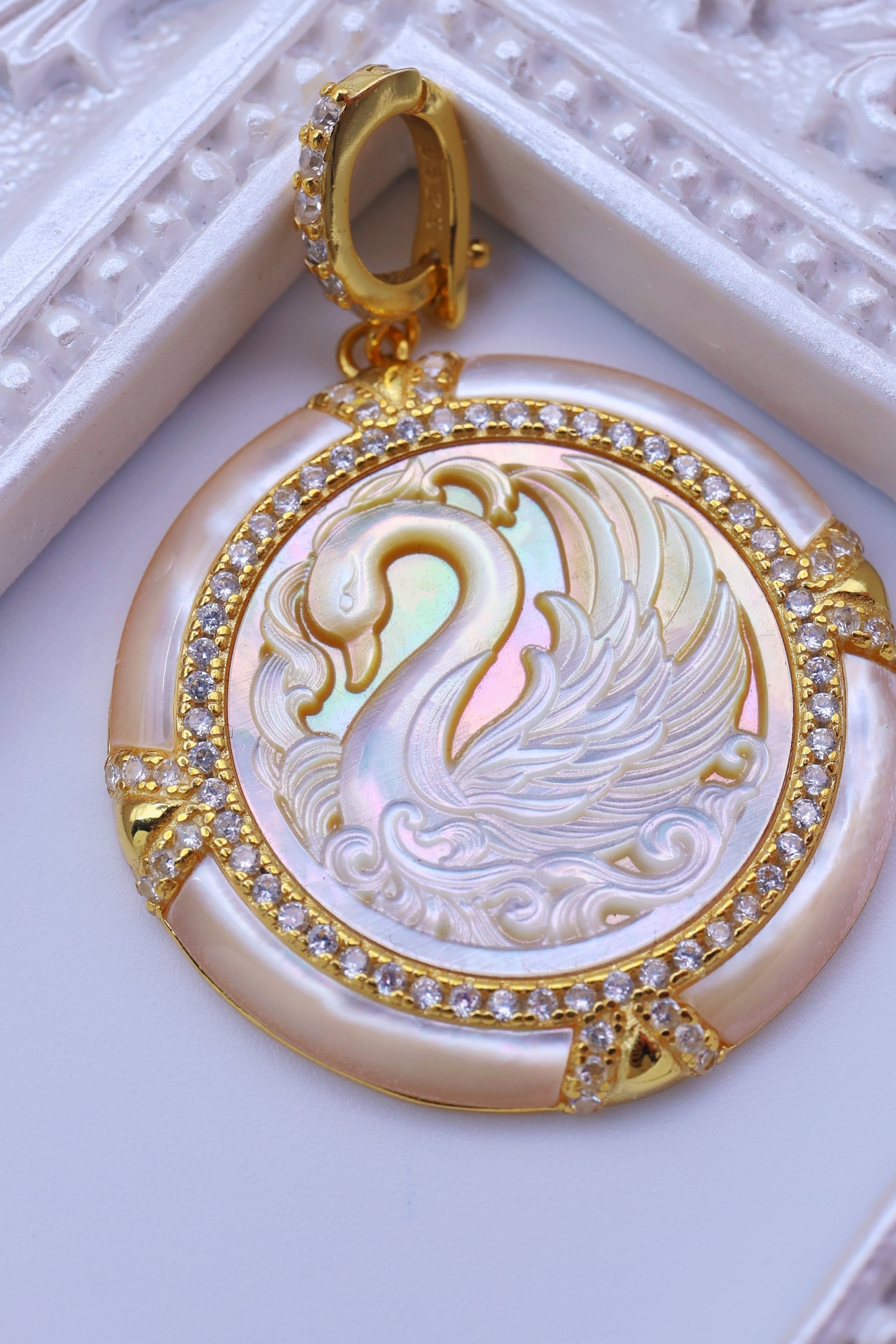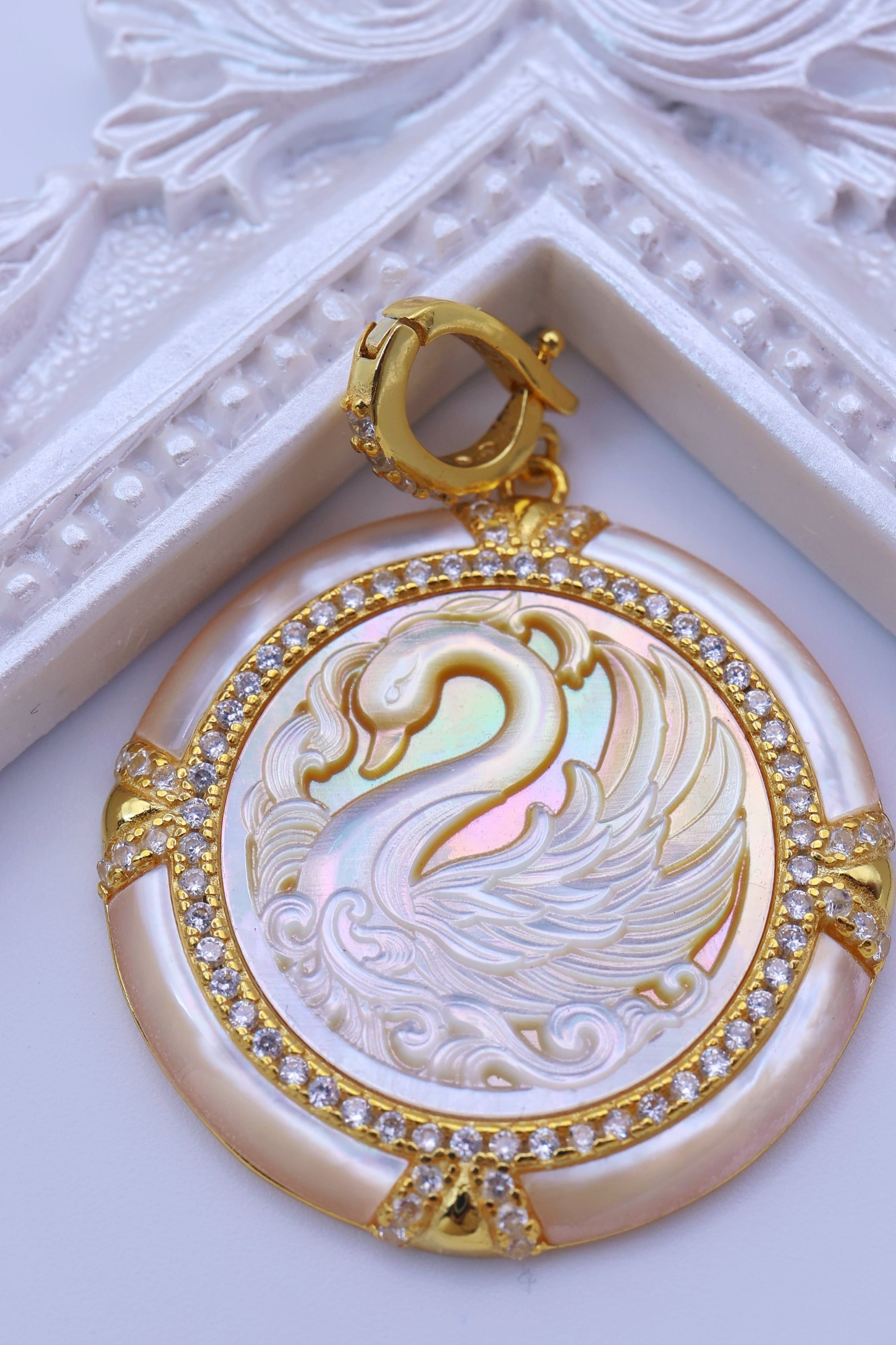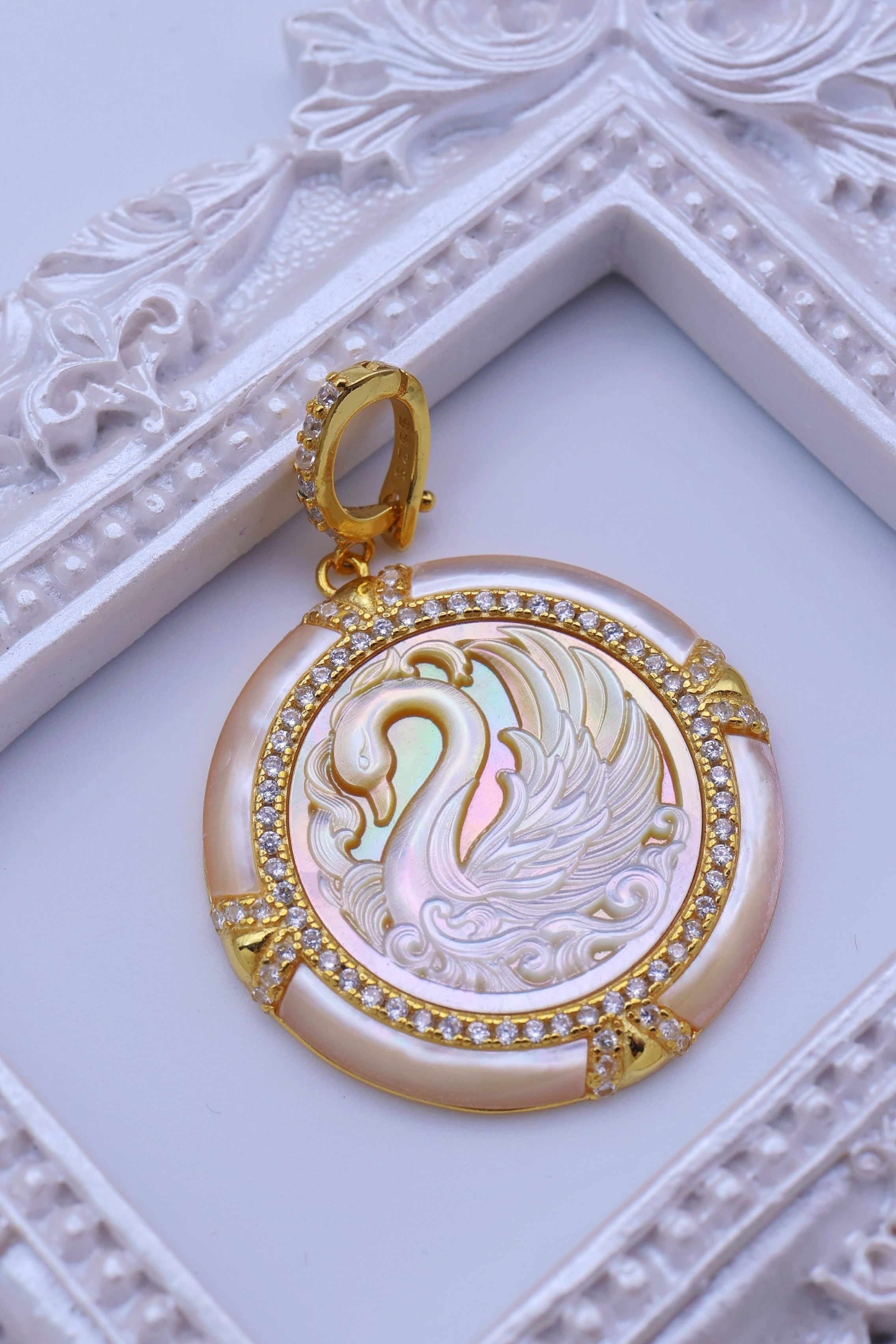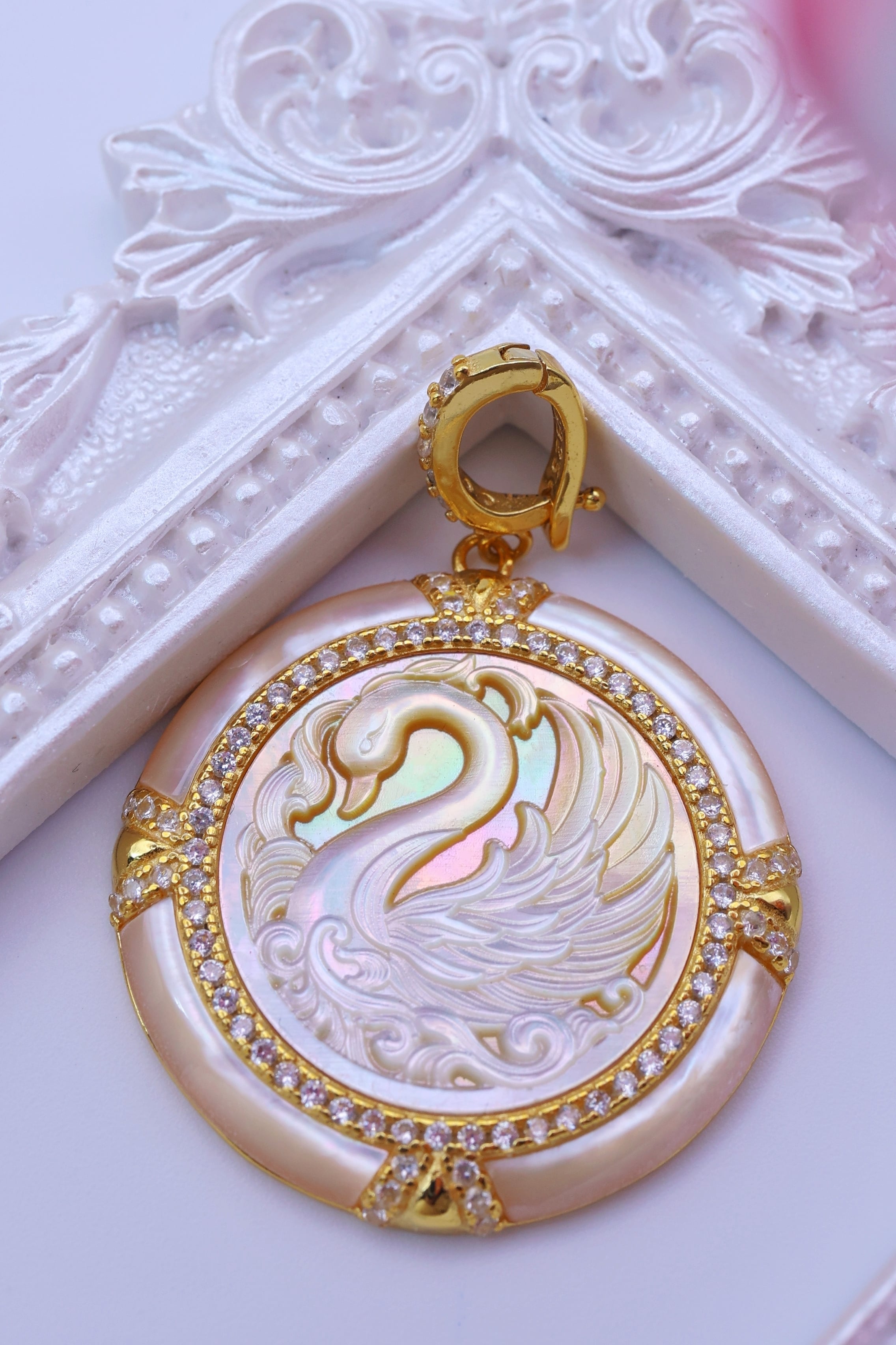 虹色の光を帯びた白蝶貝に、優雅に佇む白鳥の姿を繊細に彫刻した、幻想的なペンダント。しなやかに弧を描く首元や、幾重にも重なる羽の流れ、水面にたゆたうような優美な気配まで丁寧に表現されており、白鳥ならではの気品と静かな存在感が感じられる意匠に仕上がっています。
