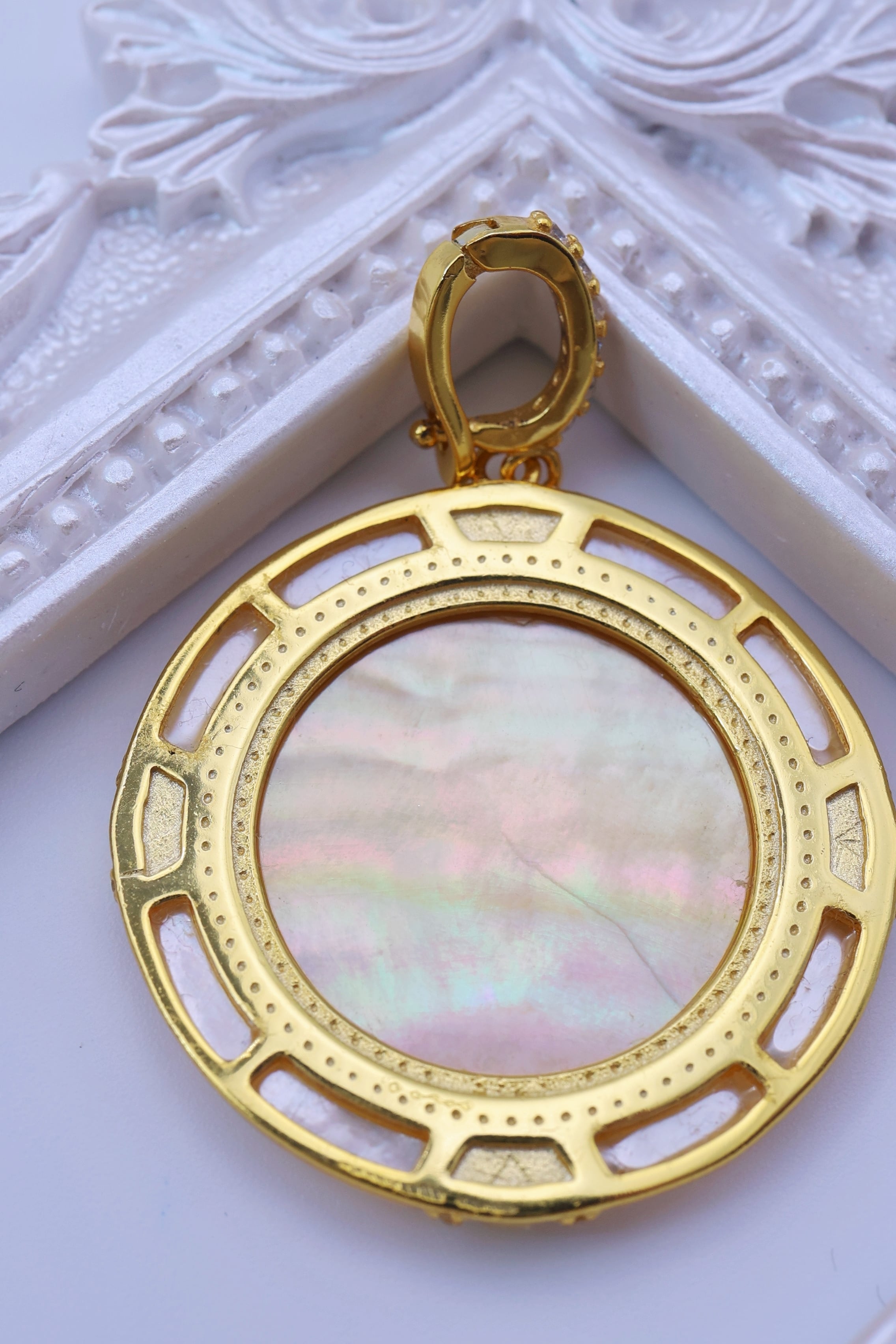 キュービックジルコニアをあしらったクラシカルな装飾が、白蝶貝の輝きを引き立て、優美で洗練された雰囲気を添えています。