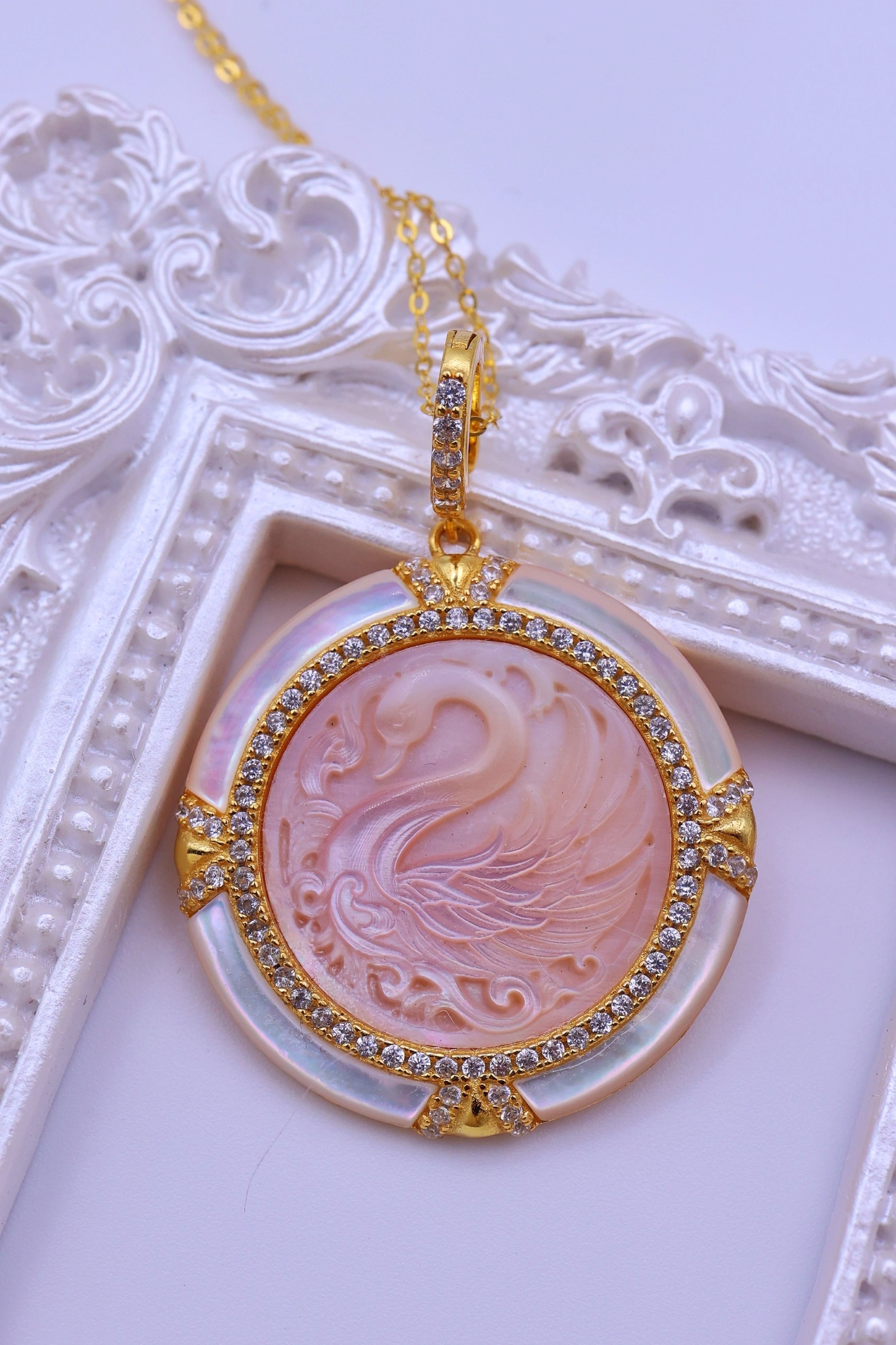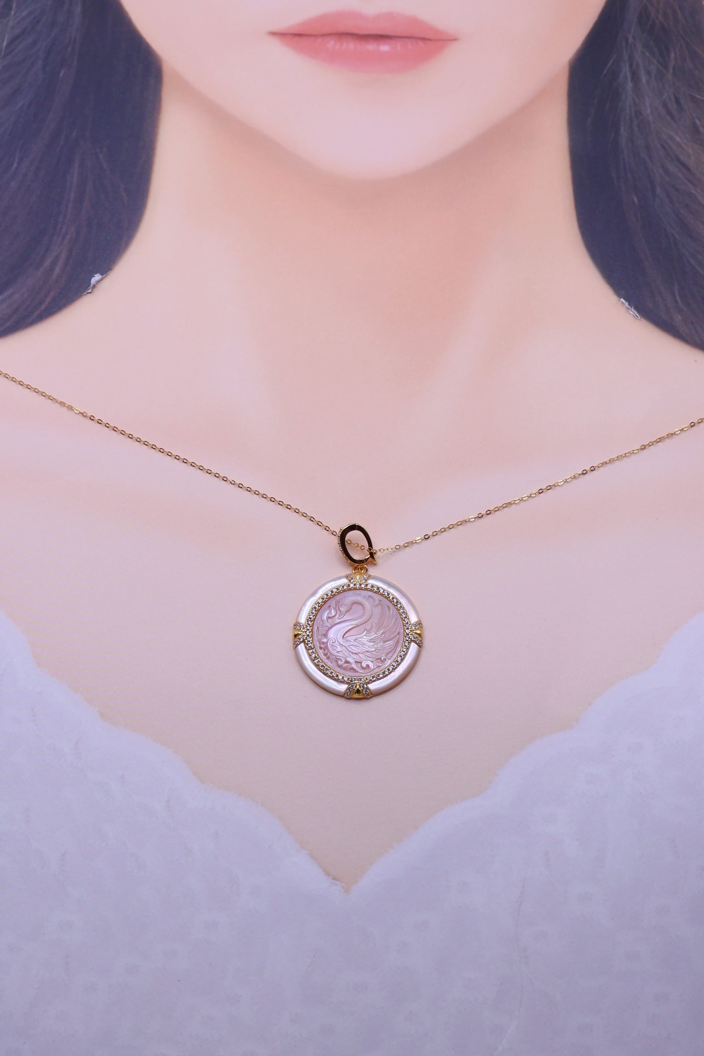 本作は、オーストラリア産の白蝶貝(マザーオブパール)を使用した、白鳥モチーフのペンダントです。