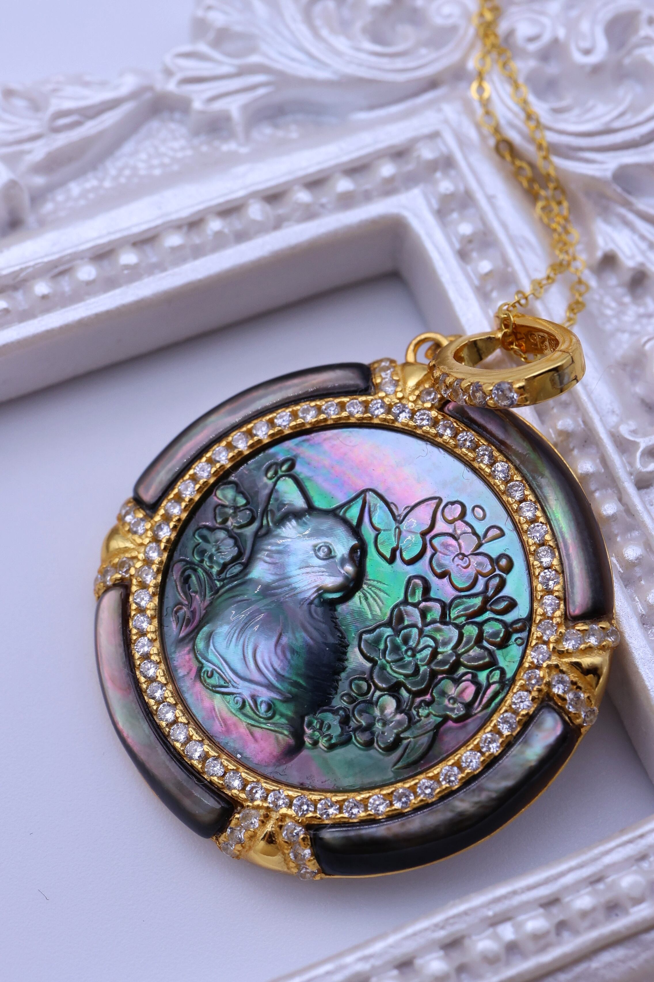 黒蝶貝特有の神秘的な干渉光が、猫の毛並みや花びらの立体感をやわらかく浮かび上がらせ、見る角度によって異なる表情を見せてくれるのも魅力のひとつ。