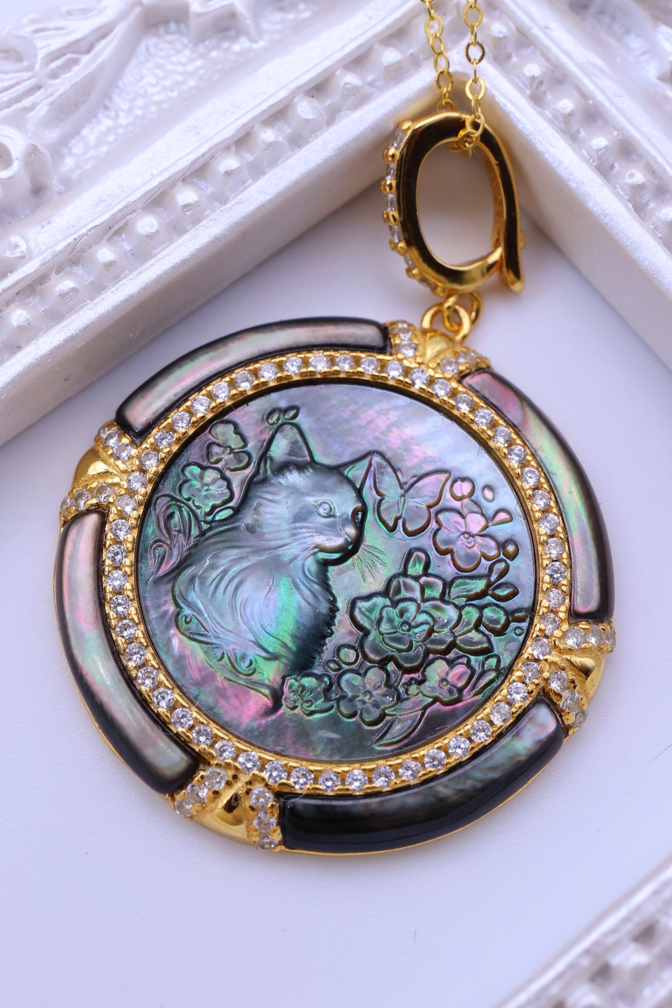 艶やかな黒蝶貝の中には、ふんわりとした毛並みの猫と、周囲を彩る花々を繊細に彫刻。やわらかな表情で佇む猫の姿に、可憐に咲く花々が寄り添い、可愛らしさの中にもどこか優雅で幻想的な雰囲気を感じさせるデザインに仕上がっています。