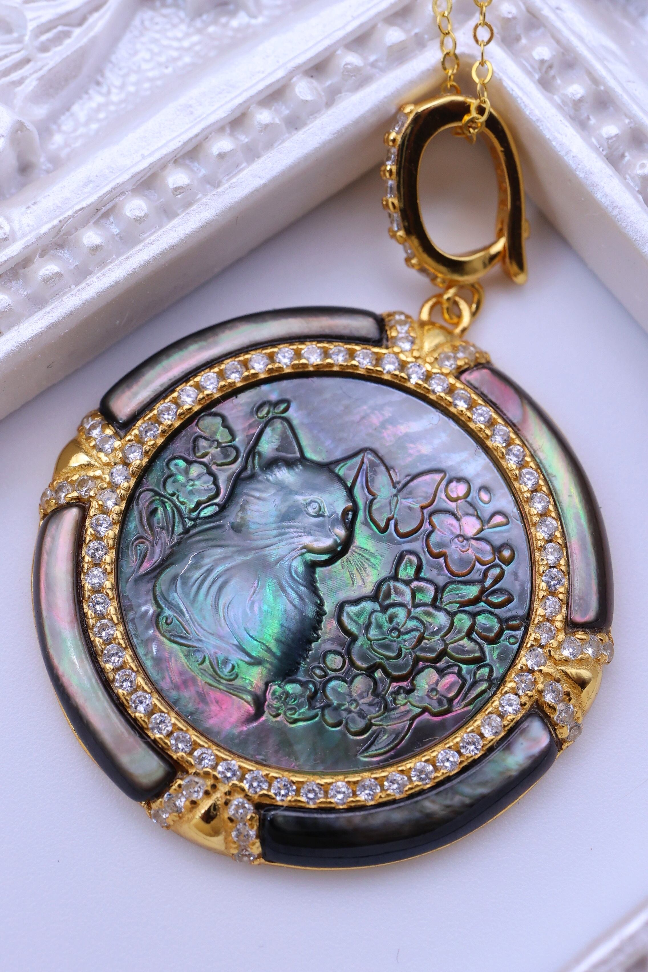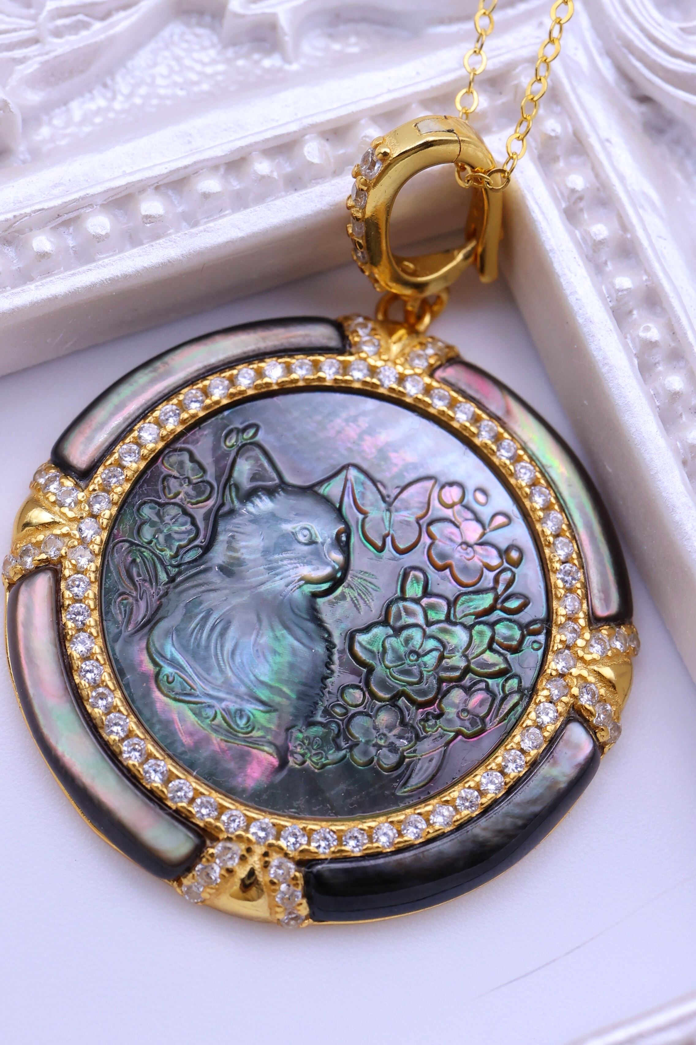 本作は、オーストラリア産の黒蝶貝(ブラックマザーオブパール)を使用した、猫モチーフのペンダントです。