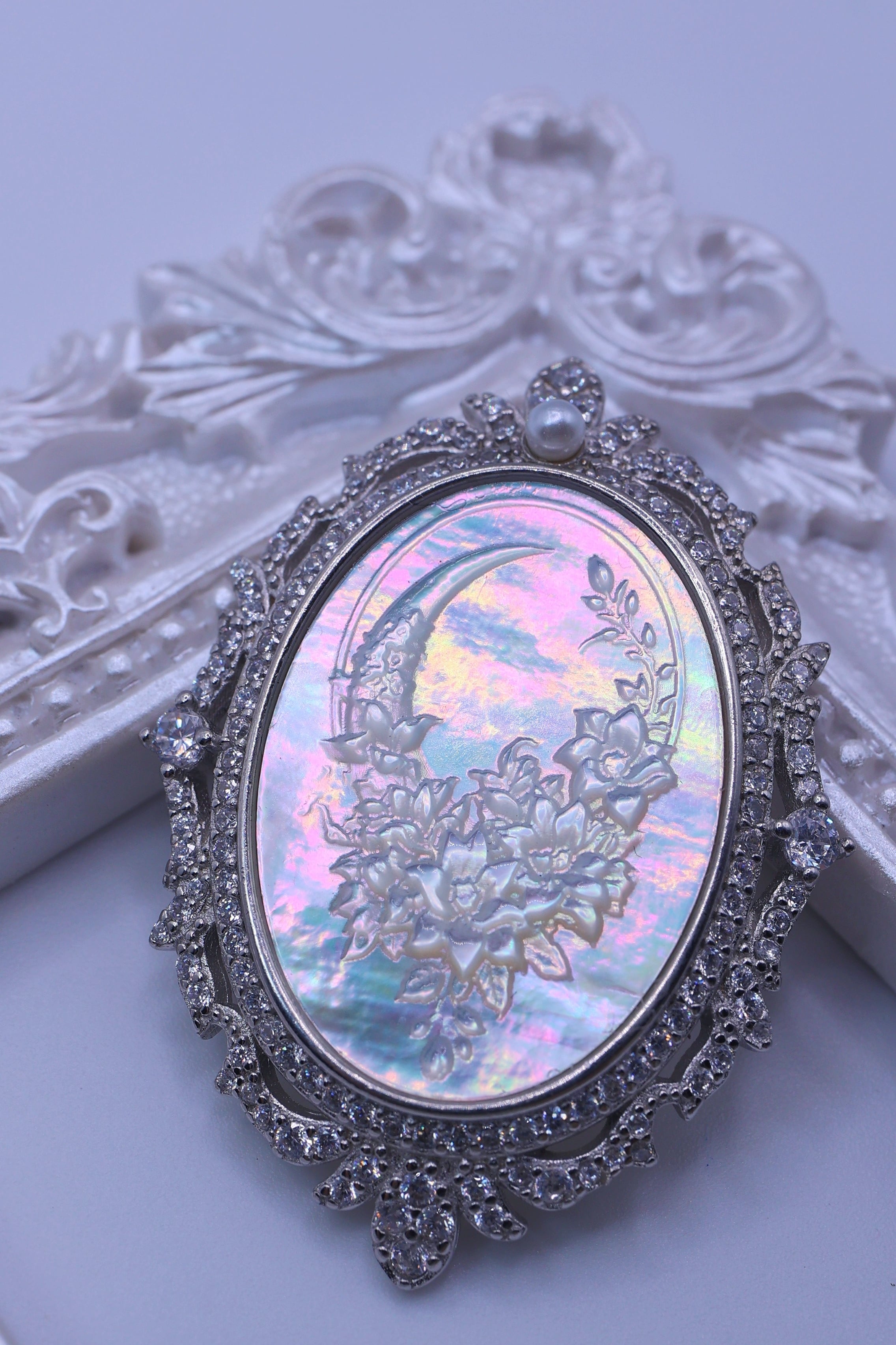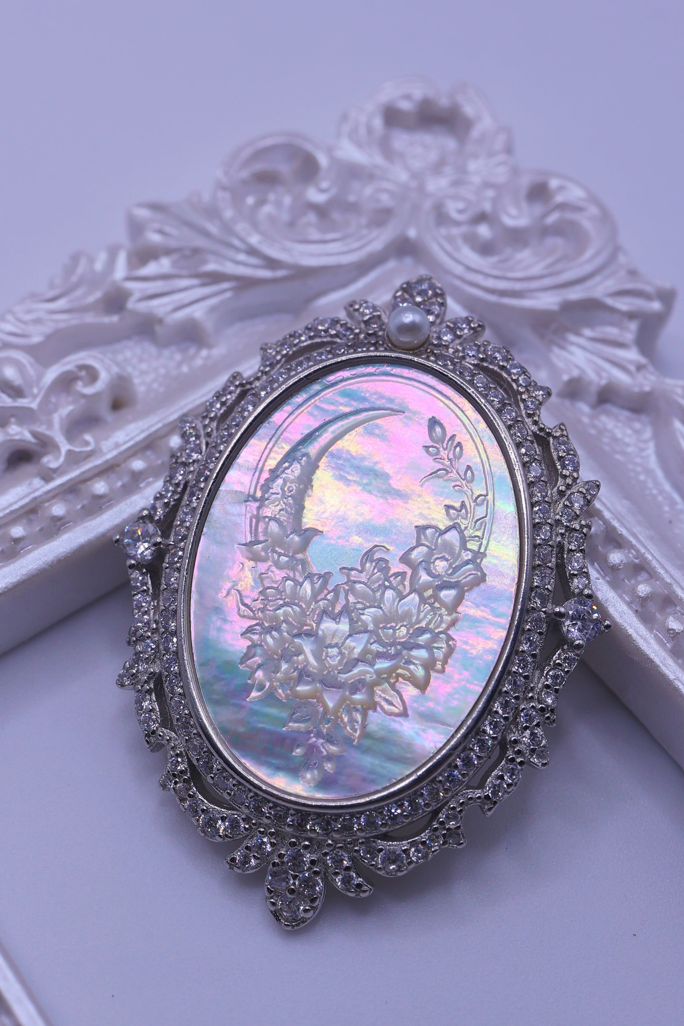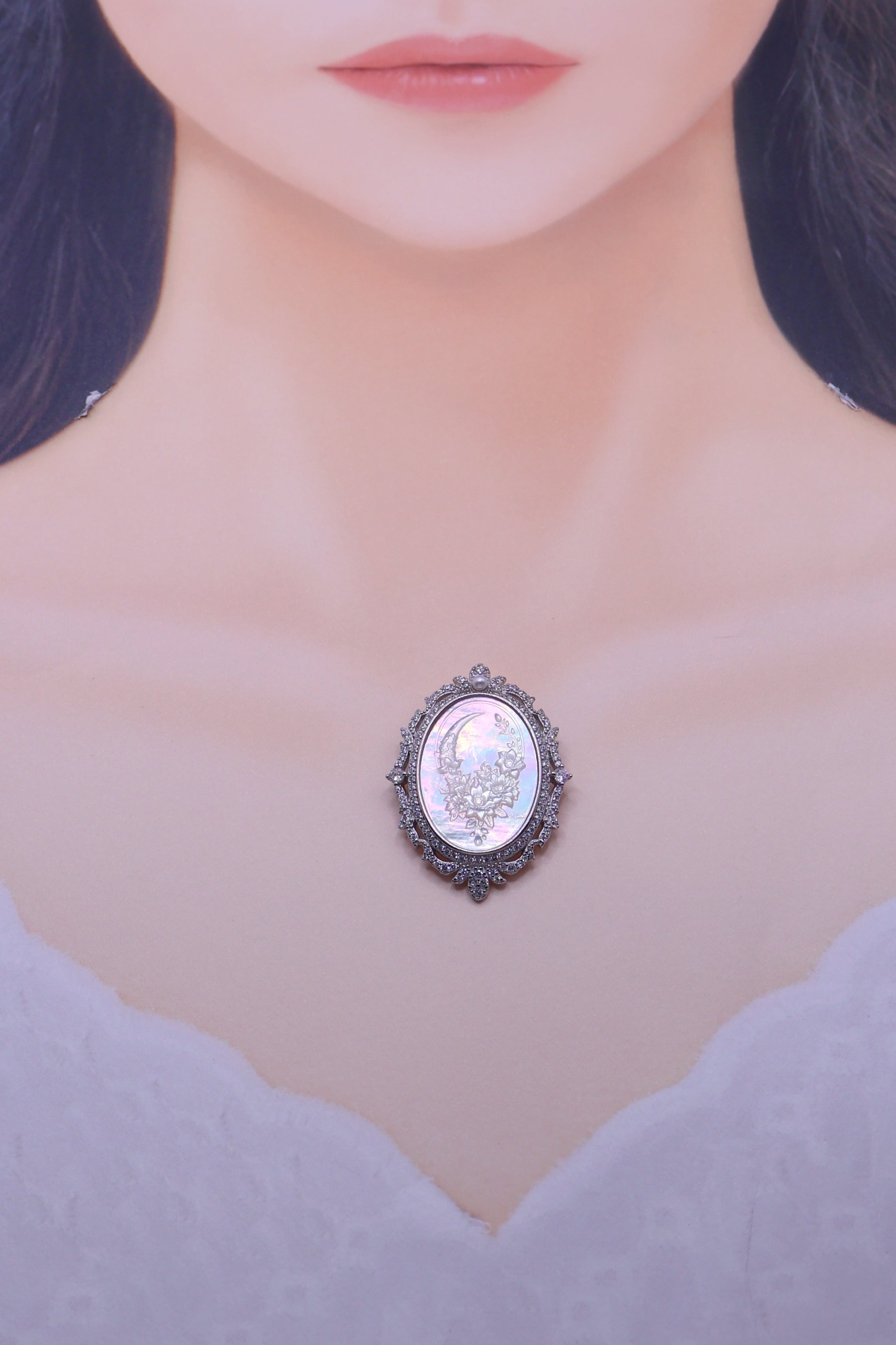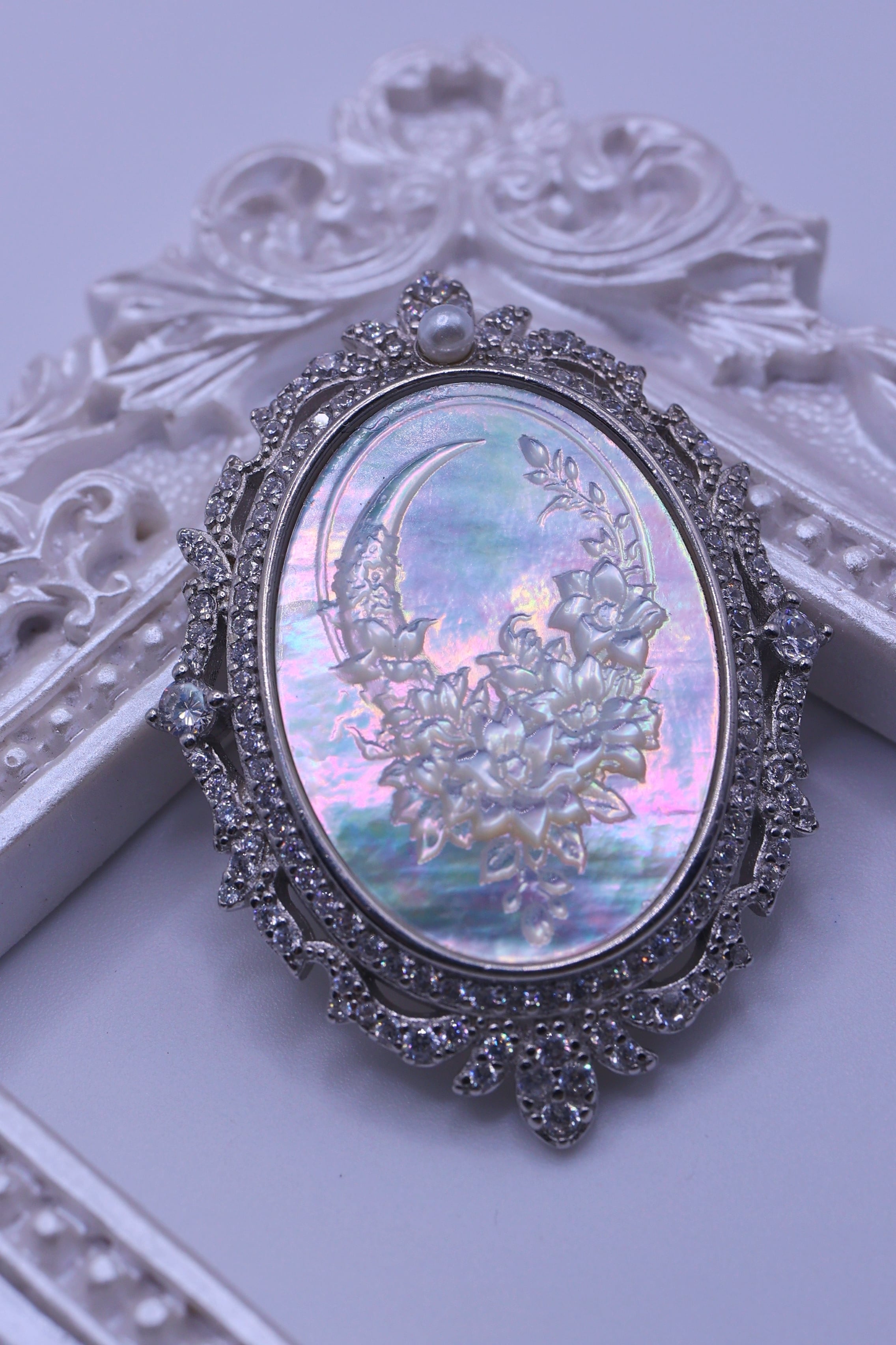 三日月の静かな輝きと、優美に咲き重なる花々。その幻想的な構図に、白蝶貝特有の干渉光が重なり合うことで、身に着けて動くたび、光がすっと横切り、いくつもの光跡が連なって、まるで月夜に花影が揺れるような印象を見せてくれます。