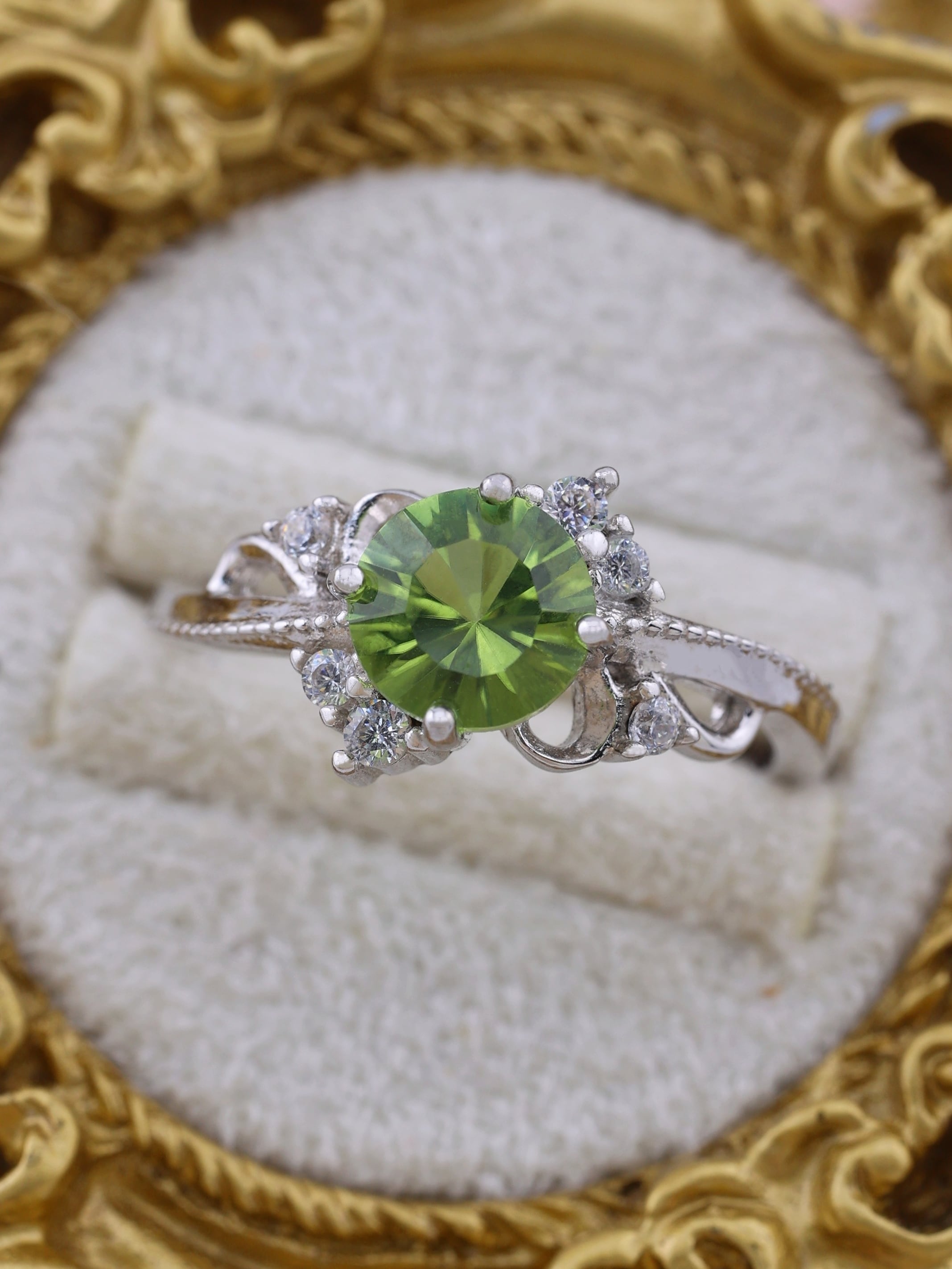 みずみずしい若葉のようなグリーンが美しいペリドットを主役に据えた、優美なリングです。