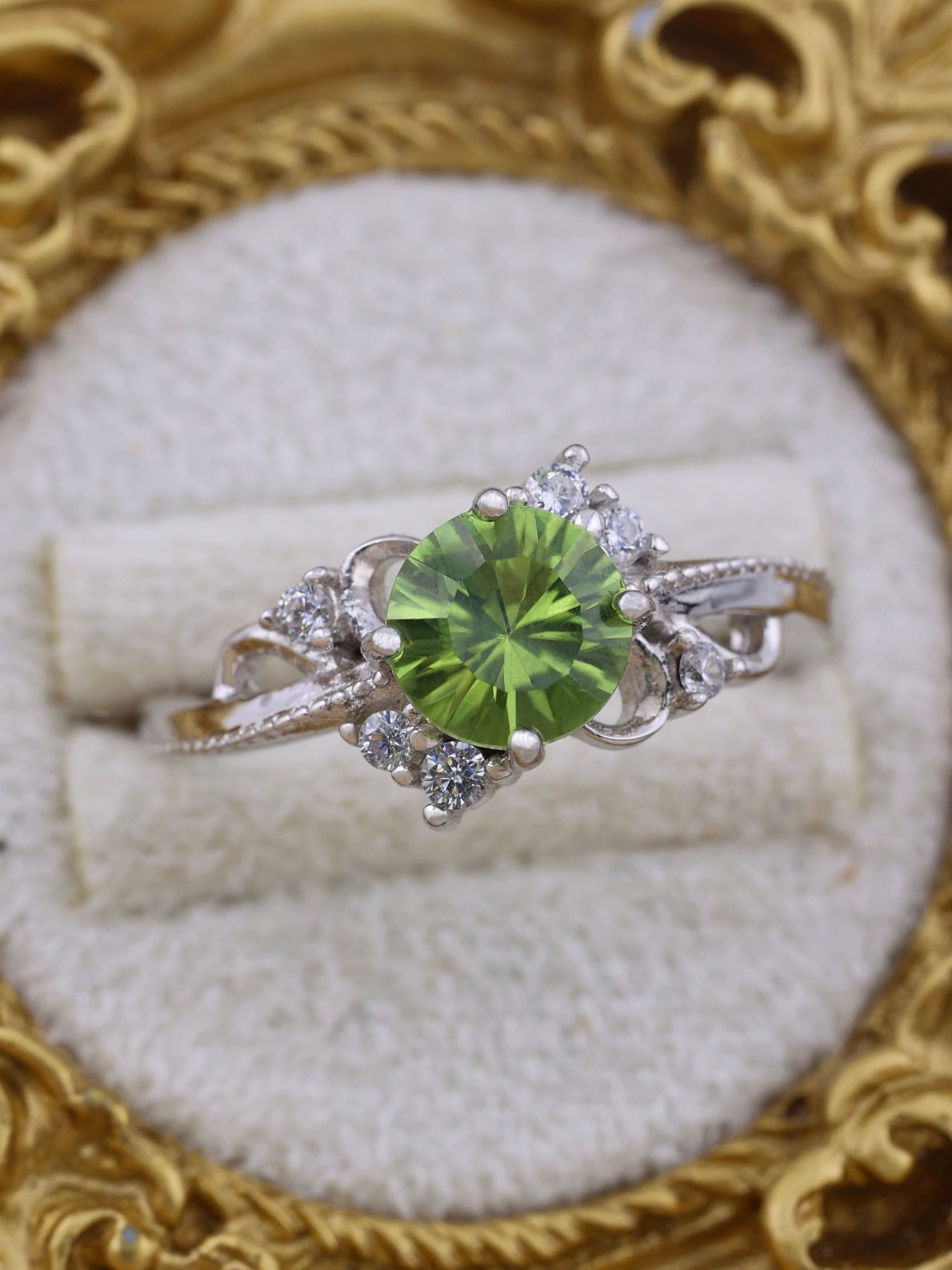 中央には6mmの天然ペリドットを使用し、山梨の職人によるコンケーブカットを施すことで、石の内側から光が広がるような、繊細で立体感のある輝きを引き出しました。