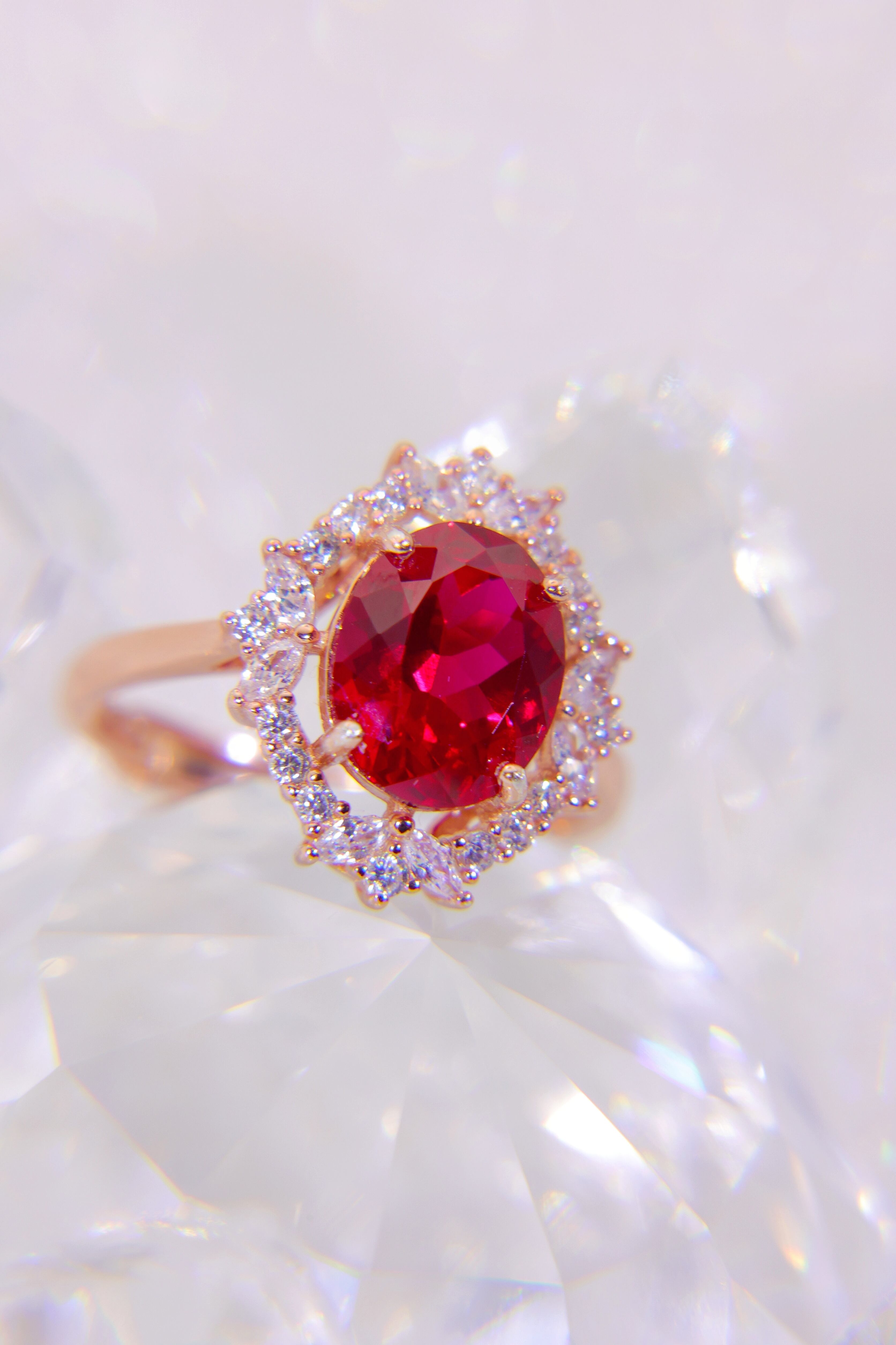 ビーフブラッドカラーを誇る精度カットのラボグロウンルビーが、優雅さと気品を象徴します。