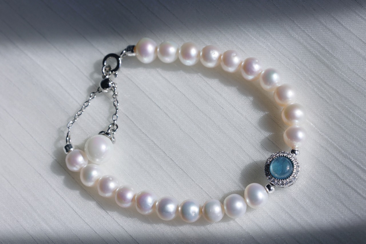 天然淡水パールとアクアマリンを使用した14KGFのブレスレットは、エレガントで洗練されたデザインが魅力的です。