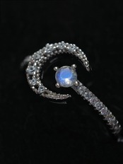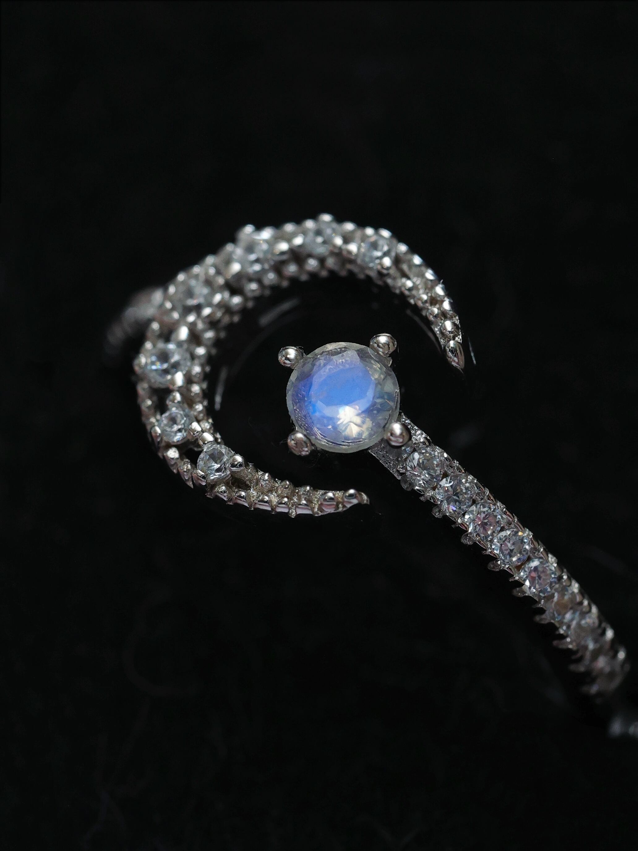 このリングの中心を飾るのは、素晴らしいシラー効果を持つレインボームーンストーン。角度を変えるたびに、虹色の光が神秘的に浮かび上がり、夜空に浮かぶ星のような幻想的な美しさを演出します。この石は、月の光を宿すと言われるムーンストーンの中でも特に珍しく、見る者を引き込む不思議な魅力を持っています。