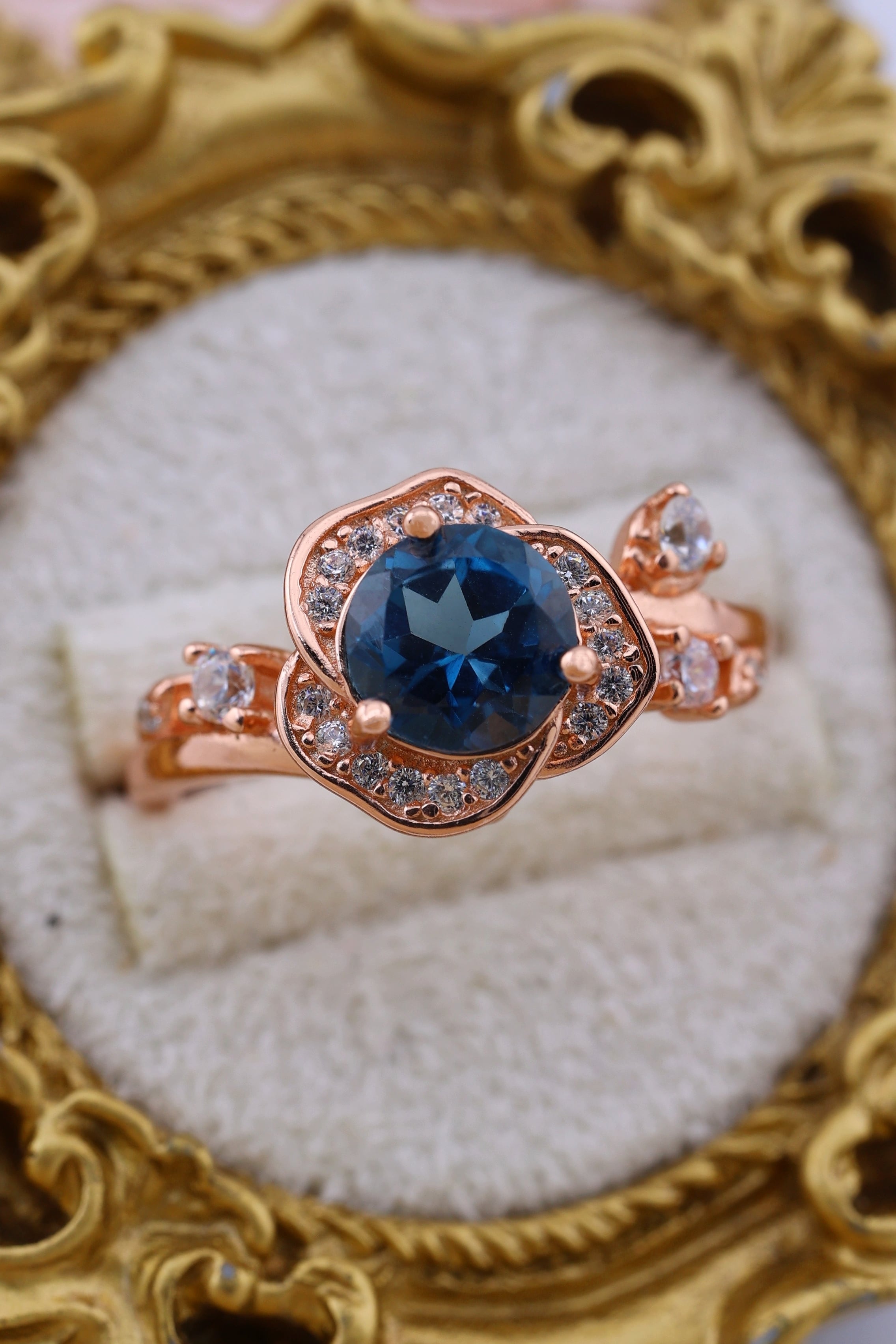 静かな夜空に咲き誇る一輪の薔薇をイメージしたリング。中央に輝くロンドンブルートパーズは、深い夜空のようなミステリアスなブルーが特徴で、その美しい輝きは見る人を魅了します。高透明度を誇るこのトパーズは、光の加減でさまざまな表情を見せ、神秘的な魅力を演出します。