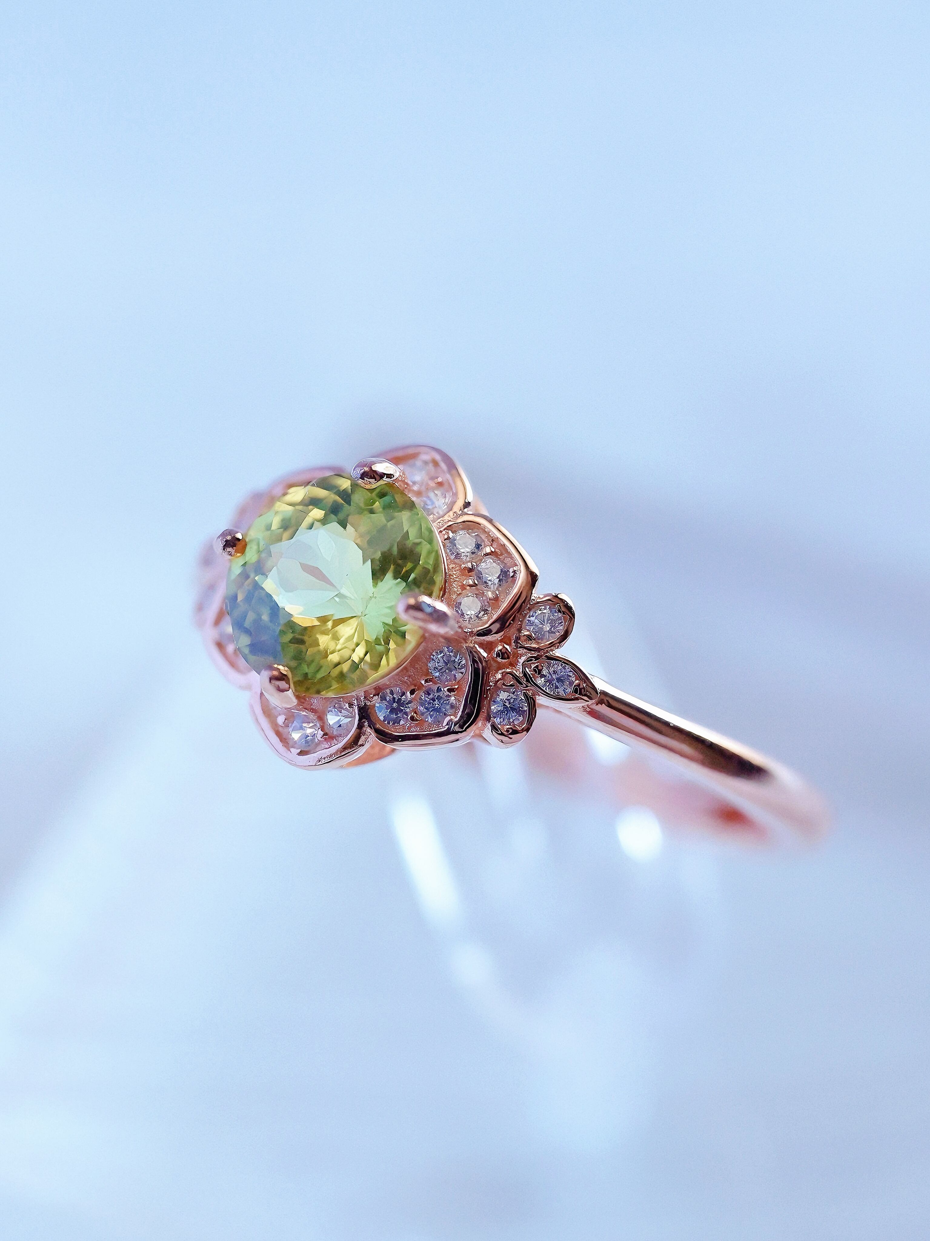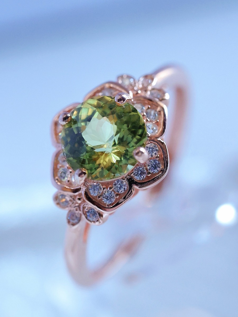 鮮やかなイエローグリーンが美しいマリガーネットを主役に、花のように繊細で華やかなデザインが魅力のリングです。マリガーネットは、グロッシュラーガーネットの一種でありながら、通常のガーネットとは異なる明るく爽やかな色合いが特徴、屈折率が高いため輝きが強い。柔らかな黄緑色の輝きは、春の芽吹きを思わせるようなフレッシュな印象を与えます。