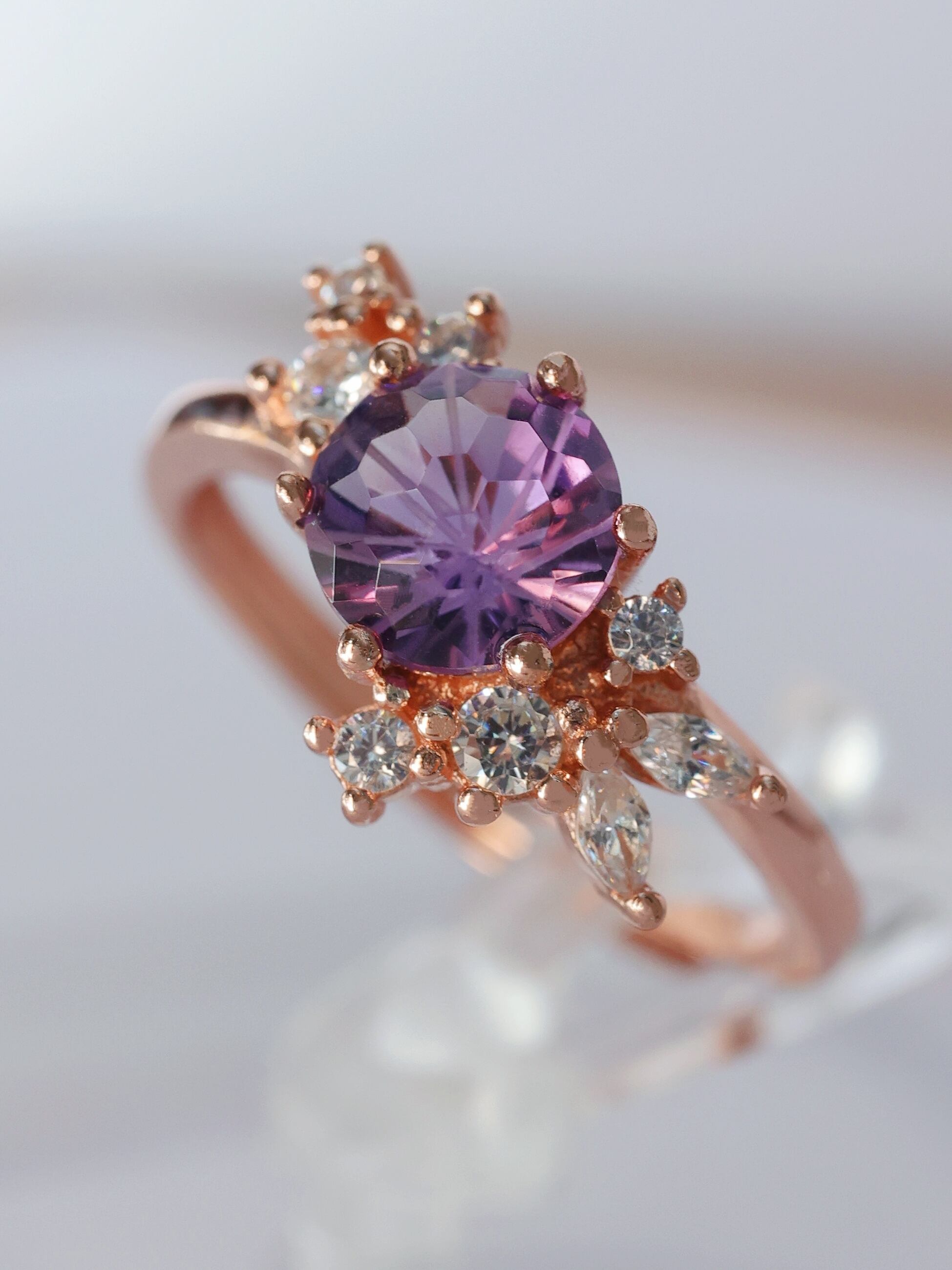 中心に据えられたアメジストは、独自の花火カットが施され、光を受けるたびに鮮烈な輝きを放ちます。まるで天空を駆ける雷の一閃のように、神秘的でありながらも揺るぎない存在感を放つ一石。