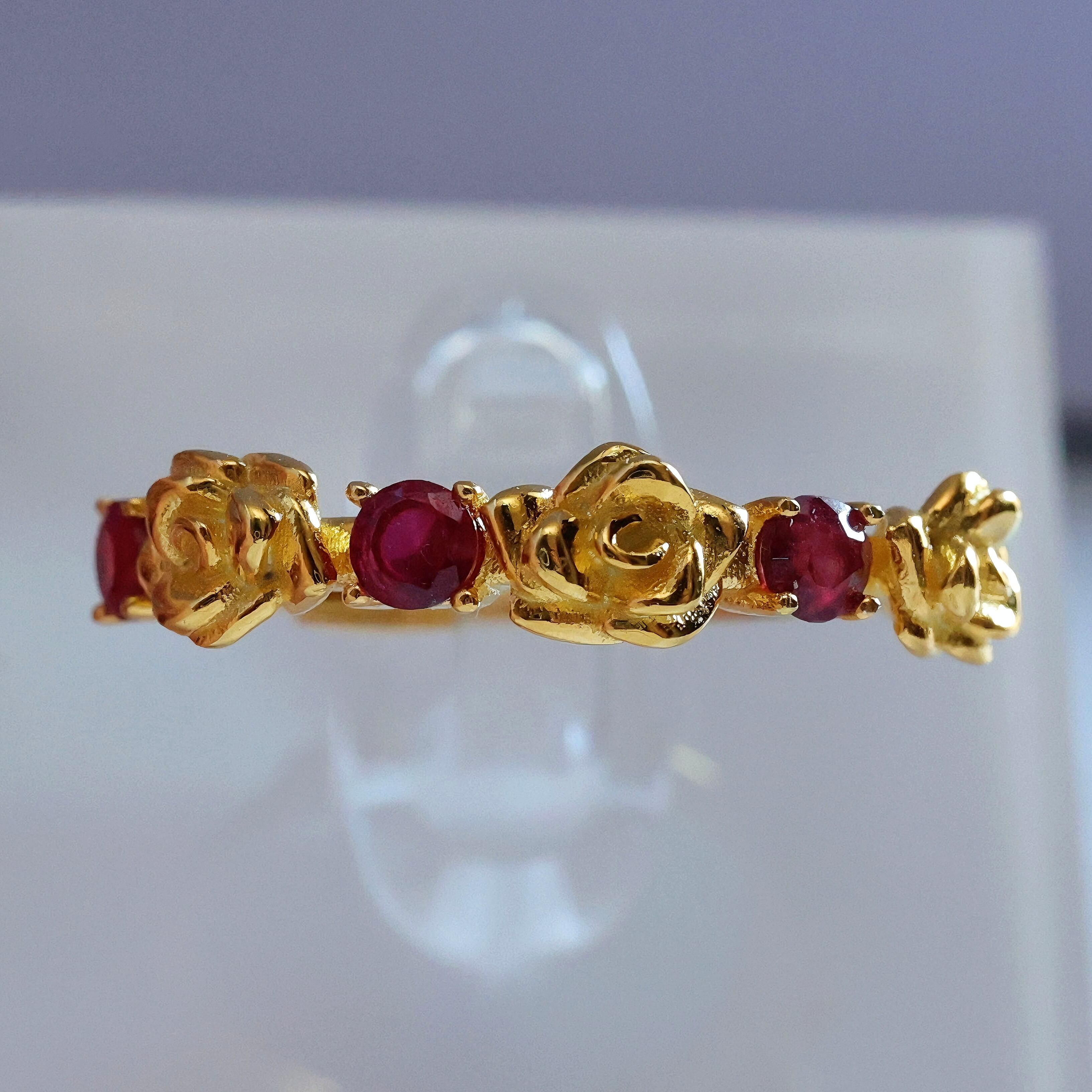 リングの素材にはシルバー925にK18ゴールドコーティングを施し、華やかさと高級感をプラス。周囲の輝きがルビーを引き立て、まるで朝露に濡れた花びらのような透明感を演出します。